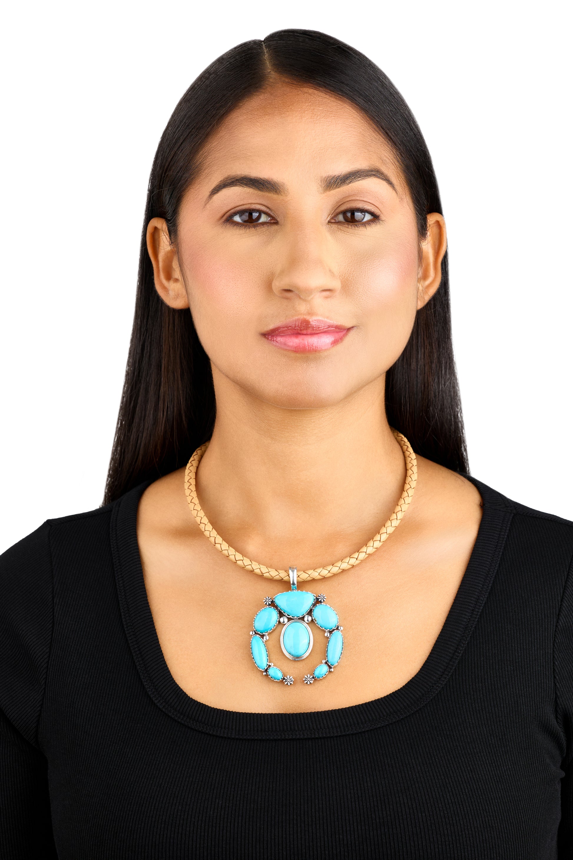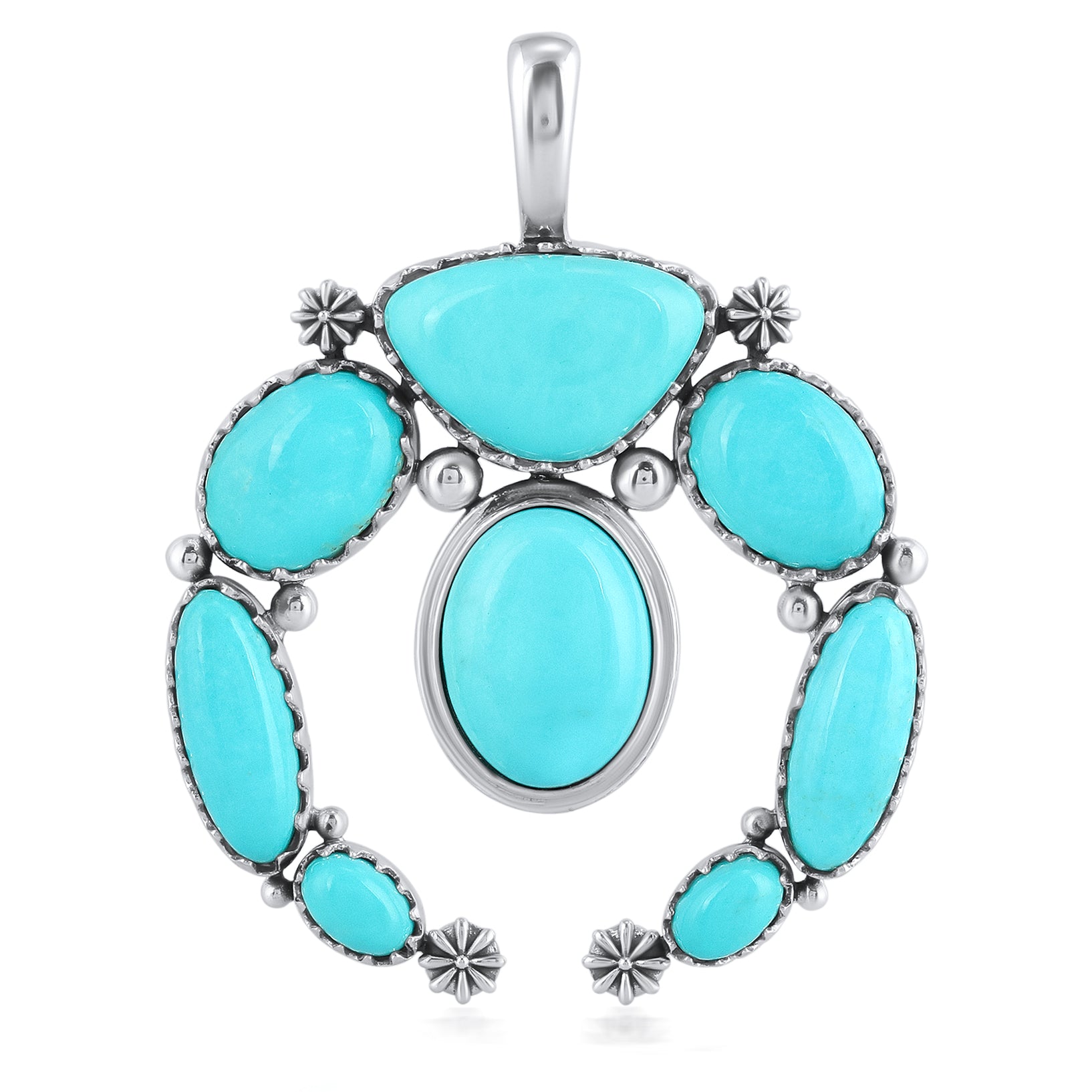 Complete your look today with this beautiful pendant enhancer inspired by Southwest traditions and designs. A beaded silver border, Sterling Silver concha flowers and silver "pearl" beads along with an array of gorgeous genuine Kingman Turquoise gemstones, all with an oxidized, polished finish make this a go-to piece. Known for its vibrant blue color, Kingman Turquoise is a highly sought-after variety of turquoise that originates from the Kingman Mine in Arizona. The pendant features a triangle cut gemstone at top center, which sits above an oval cut stone. These centerpiece gemstones are flanked by another 3 pair of stunning oval cut gemstones, each graduating to a smaller pair of oval gemstones, for a total of 8 Kingman Turquoise gemstones. This Naja pendant is finished at the ends with silver concha flowers. The Sterling Silver hinged bail can accommodate most necklaces or cords.