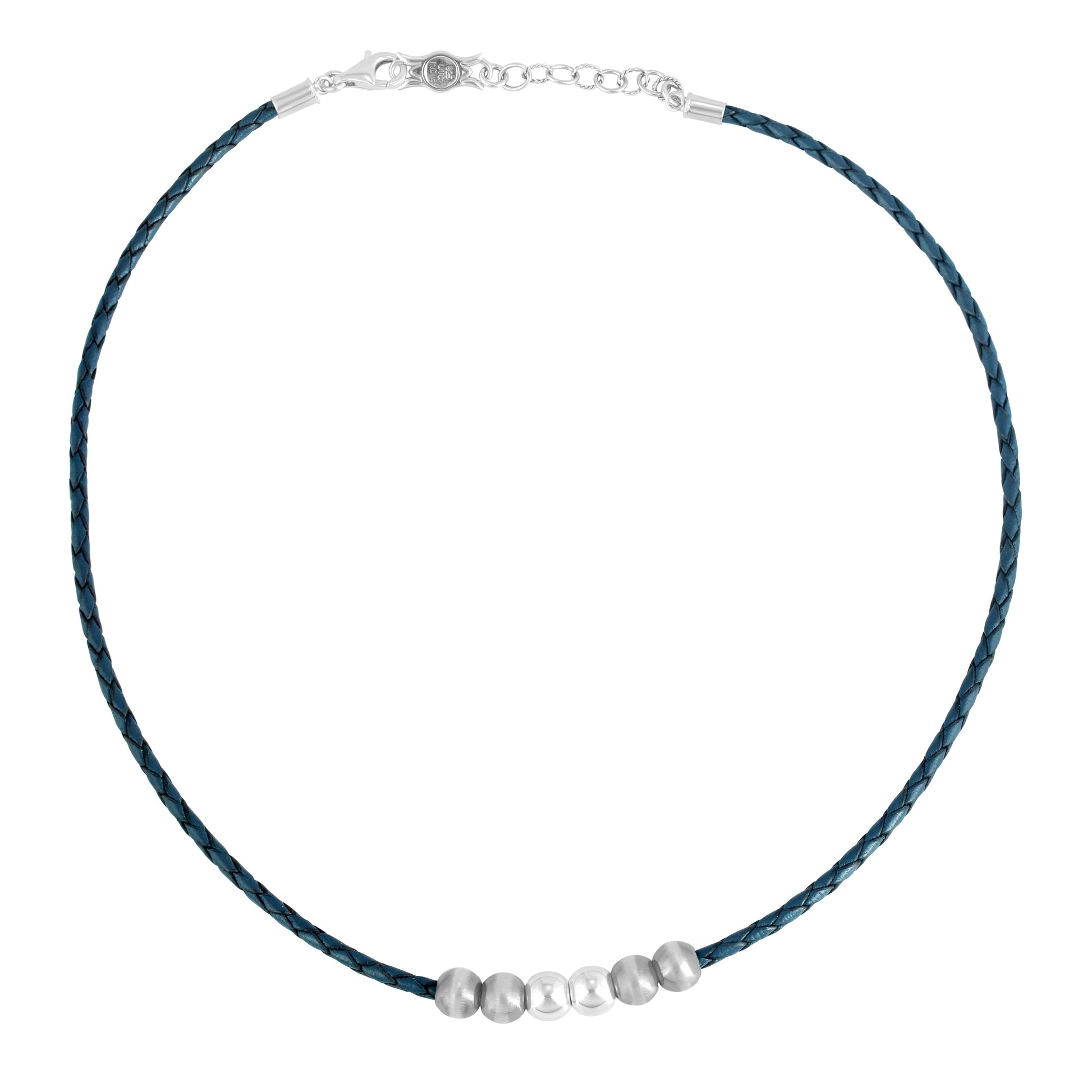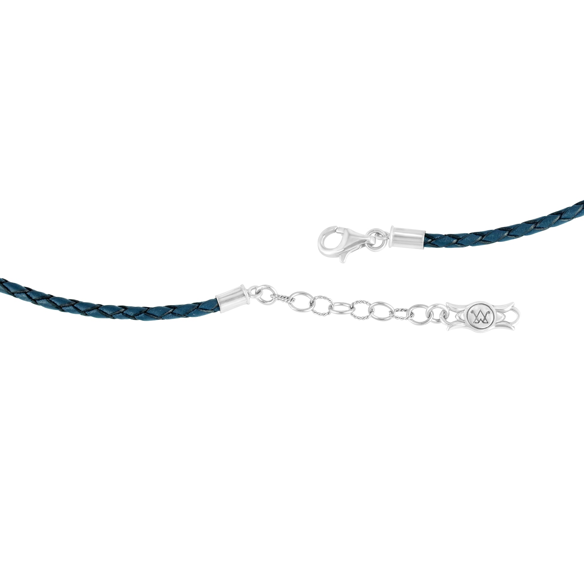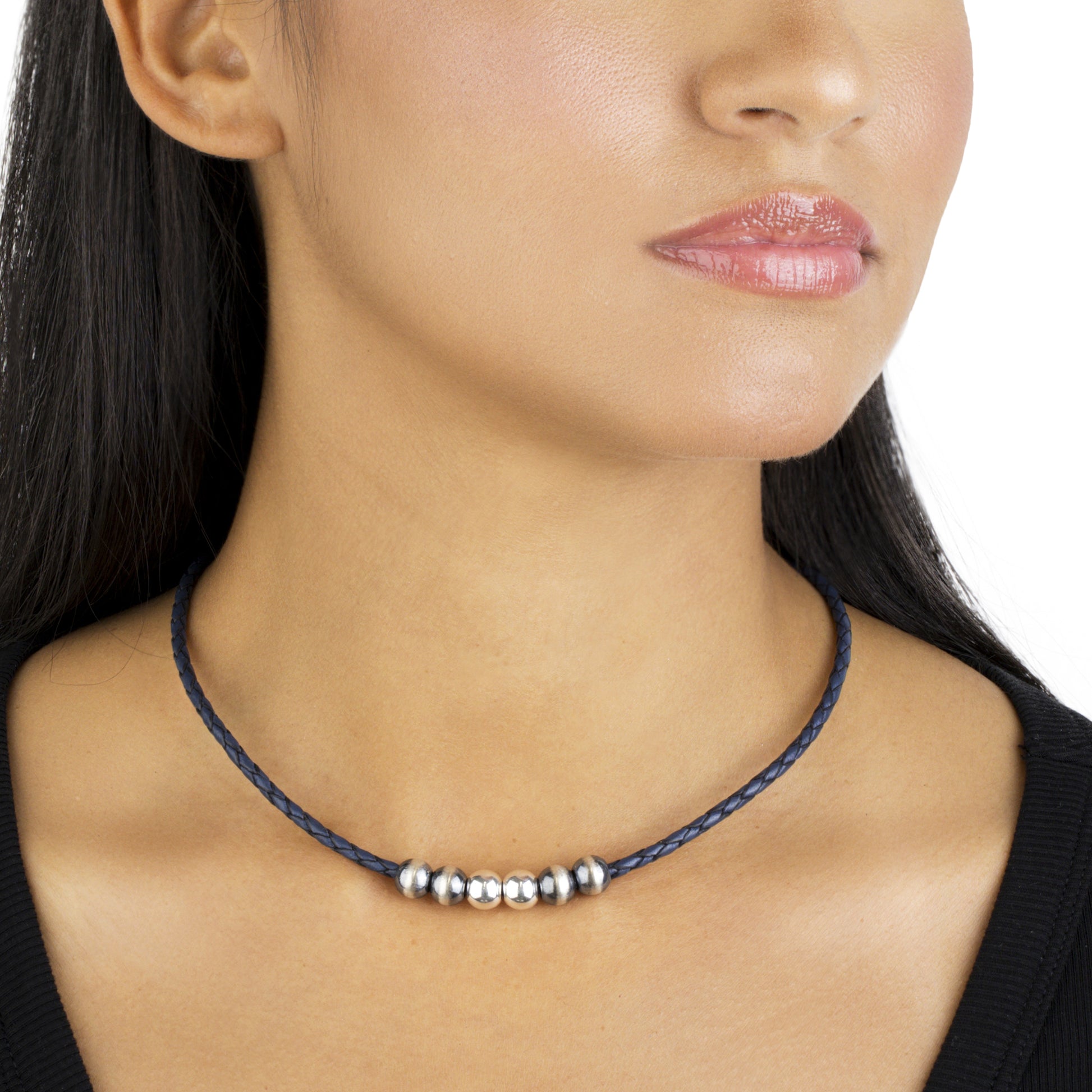 Sterling Silver Braided Blue Genuine Leather Beaded Necklace 17 or 20 Inches