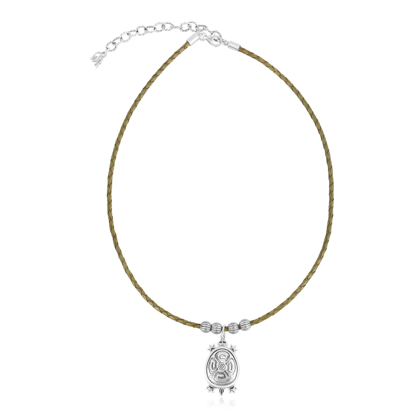 - Necklace features brown braided leather cord; with a turtle pendant; 4 striped, oxidized Sterling Silver native pearl beads
