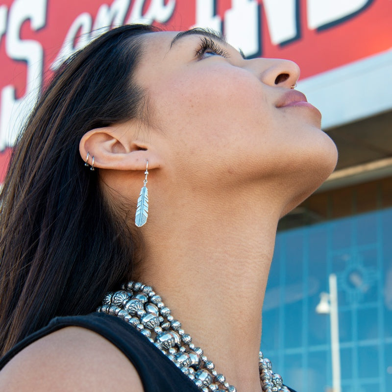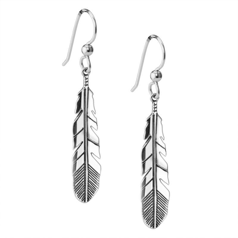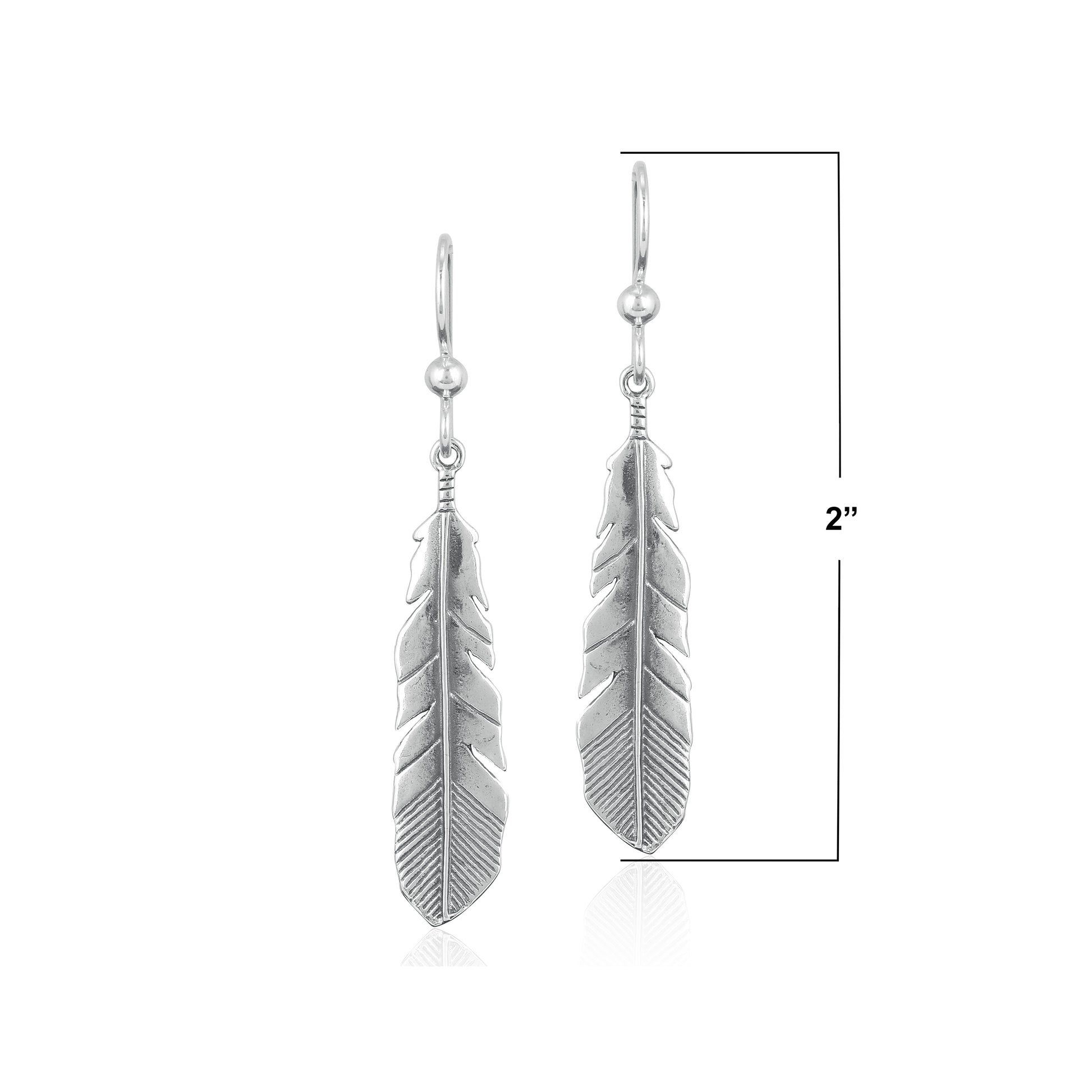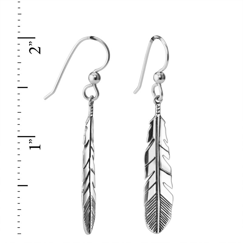 Add a kick of shine to any look with these versatile, Southwest-inspired earrings of real, nickel-free 925 Silver. Feathers are said to bring your prayers to the heavens. These earrings are an ideal complement to an up-do or long locks. The feather design has an oxidized, polished finish. Sterling Silver is the metal of emotions, of the psychic mind, and of loving as well as healing. It is used to bring patience and perseverance to the wearer. Wear these earrings alone or if you have multiple piercings, they are perfect size to mix and match. They feature hook backs (for pierced ears only) and are approximately 2" long by 3/8" wide. This exclusive Southwestern inspired design from the Classics Collection captures the lifestyle and rich history of New Mexico.