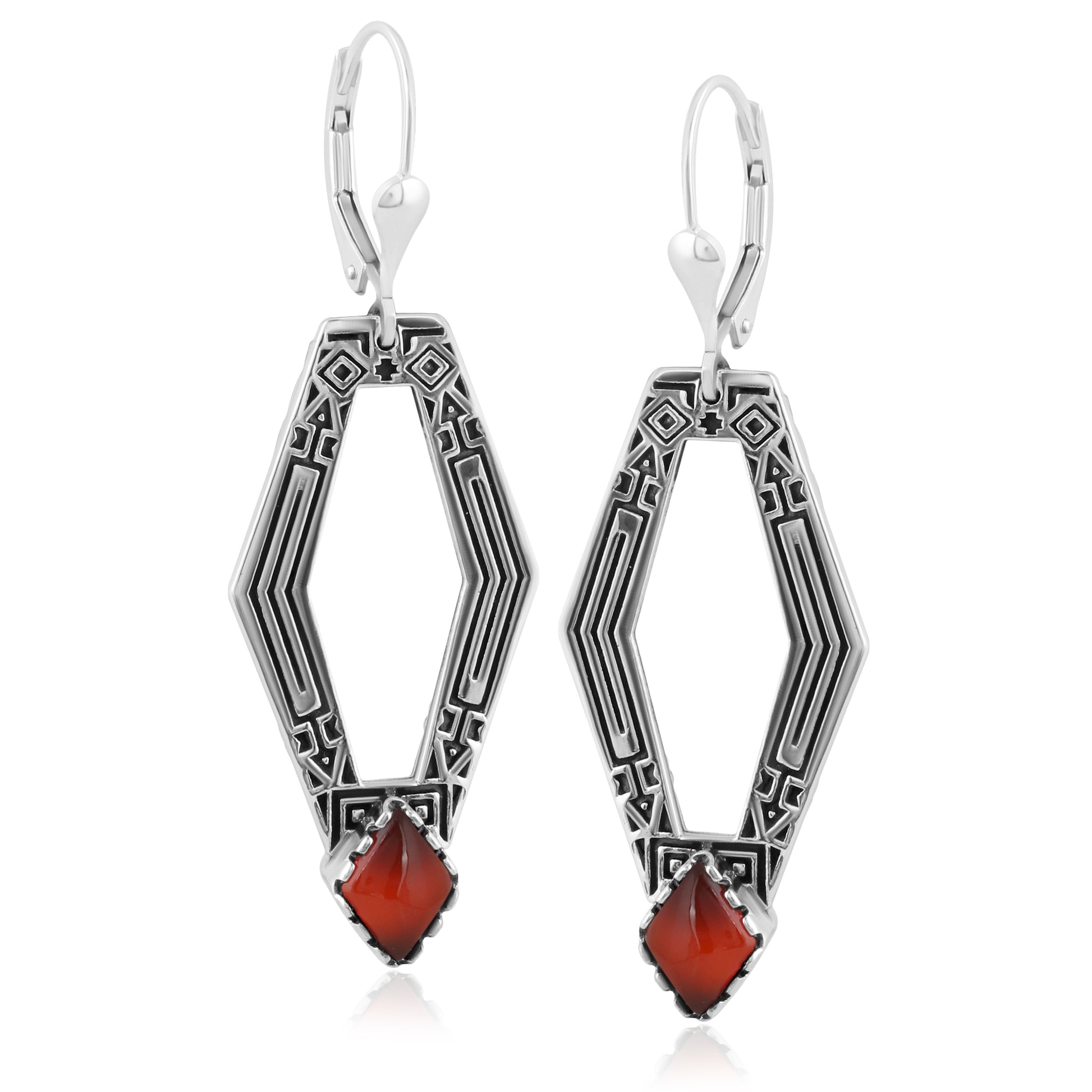 Introducing the American West Lever Back Earring, the perfect addition to any outfit! These stunning earrings feature genuine Red Agate cabochons set inside a timeless, oxidized .925 Sterling Silver geometric shaped drop frame etched with an intricate Southwest-inspired design. While every gemstone in the world is naturally unique, we carefully select the stones for each piece, making your earring one-of-a-kind. All stones are ethically sourced from conflict free mines. Lever back closures for pierced ears are secure and comfortable, and you will find these earrings will help elevate just about any outfit, whether at work, Sunday brunch with friends, a date night with your honey or a special party or social event. The special lady in your life deserves to feel fabulous. Indulge your wife, grandmother, daughter, mom, girlfriend, best friend or even yourself! Packaged in a signature gift box with a cloth pouch and an anti-tarnish bag, it is perfect for any gifting occasion like a birthday or anniversary, congratulations or thank you. Whether you want to surprise someone with a unique present or simply celebrate a milestone or holiday, our American designed jewelry shows your loved one how much you really care. We have been creating jewelry since 1975, and we're proud to share our legacy with you. Made from nickel-free Sterling Silver with 92.5% reclaimed silver metal, this original piece is designed in Albuquerque, New Mexico, USA. Our experienced artisans have honed their craft for decades and hold to the highest standards of quality. Feel confident buying, wearing, and gifting our jewelry! If oxidation or tarnish darkens the piece over time, simply wipe with a polishing cloth to restore to desired finish.