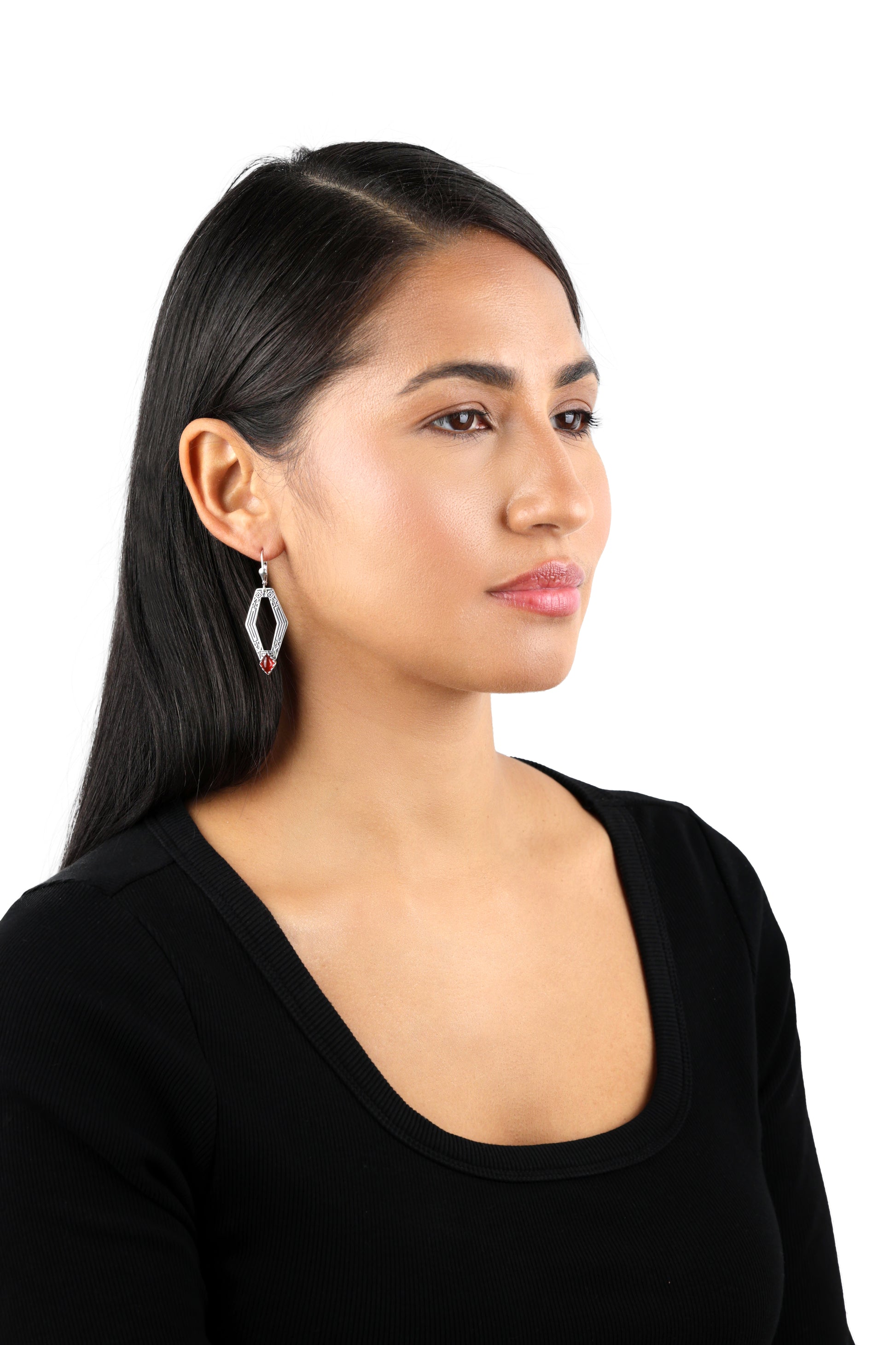 •Genuine Red Agate gemstone cabochons set inside a oxidized, polished .925 Sterling Silver geometric shaped drop frame etched with Southwest-inspired designs