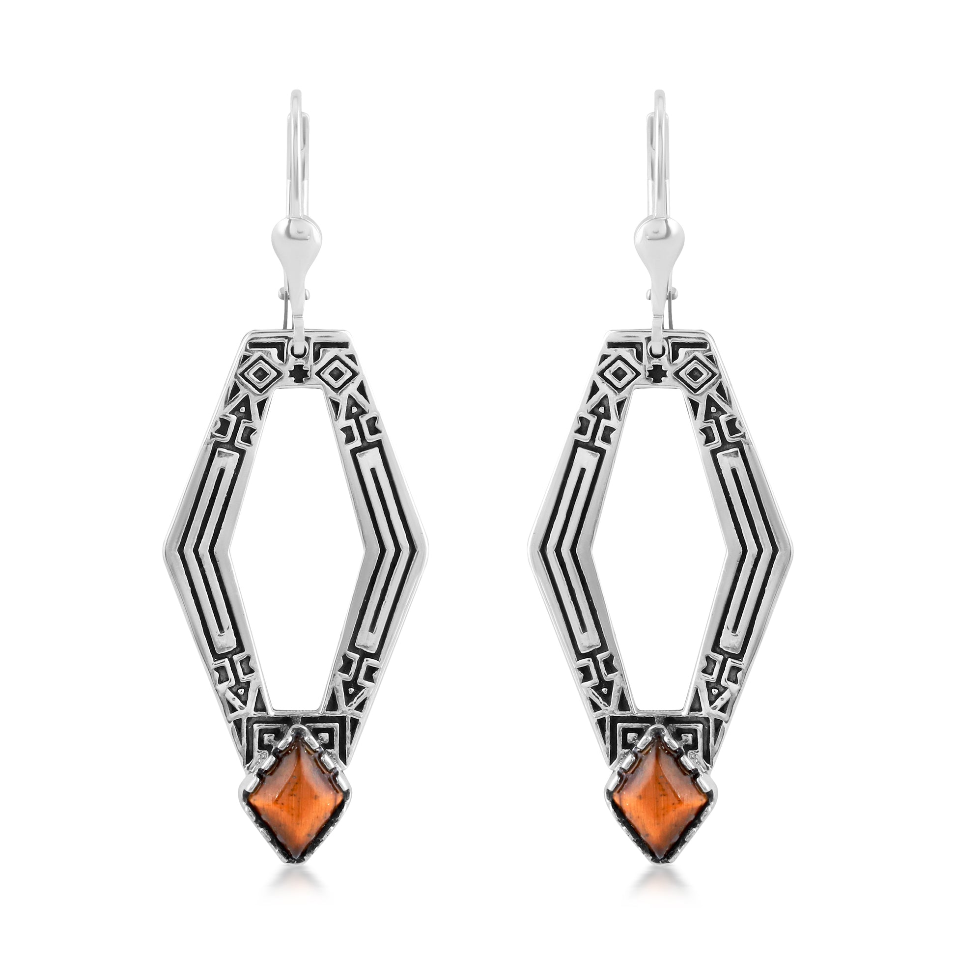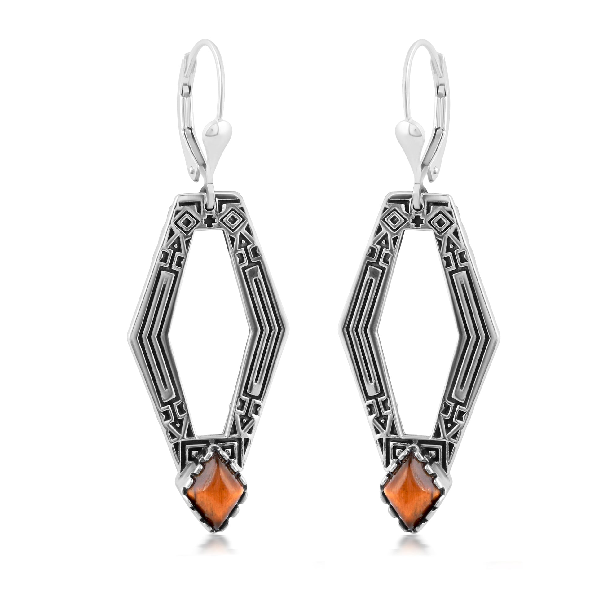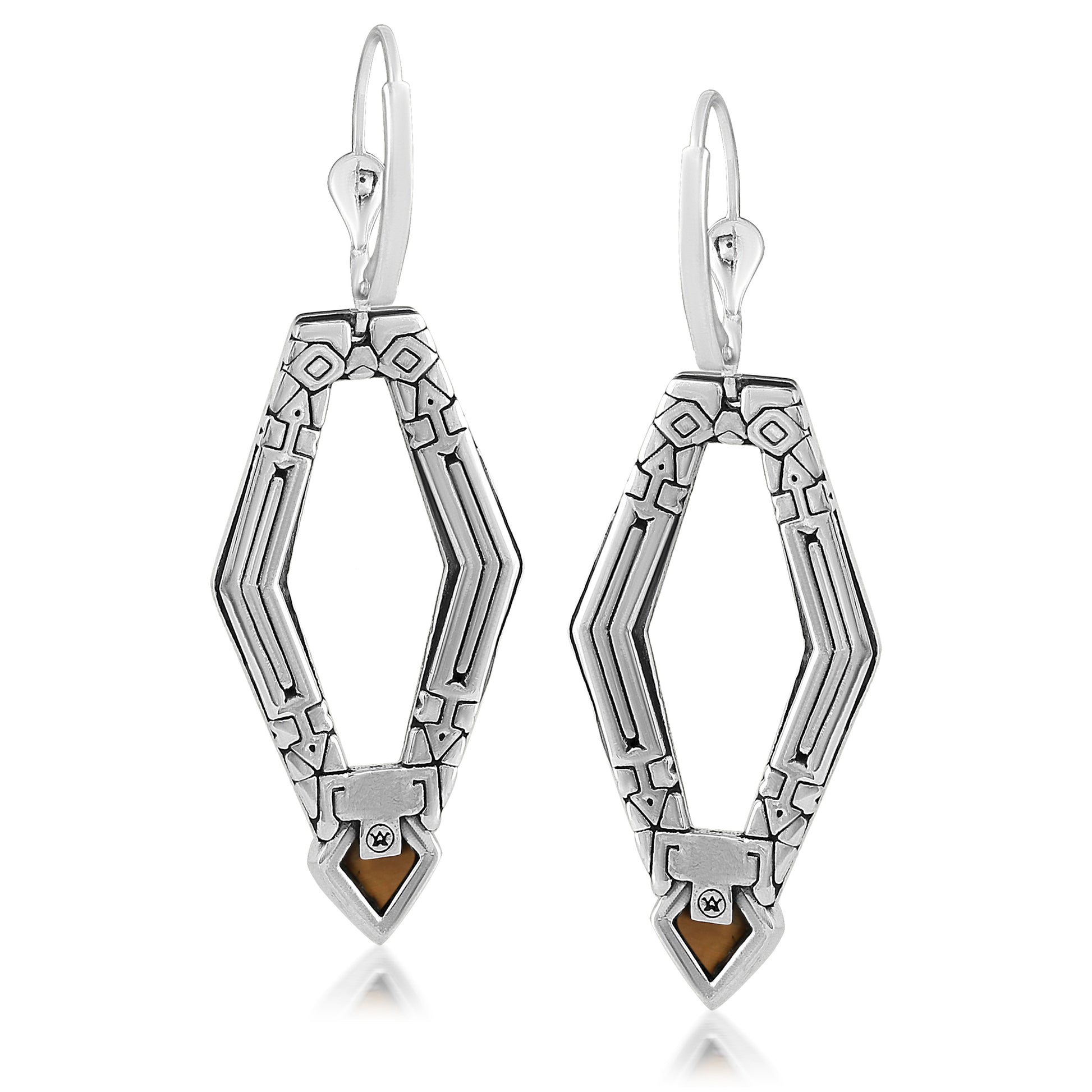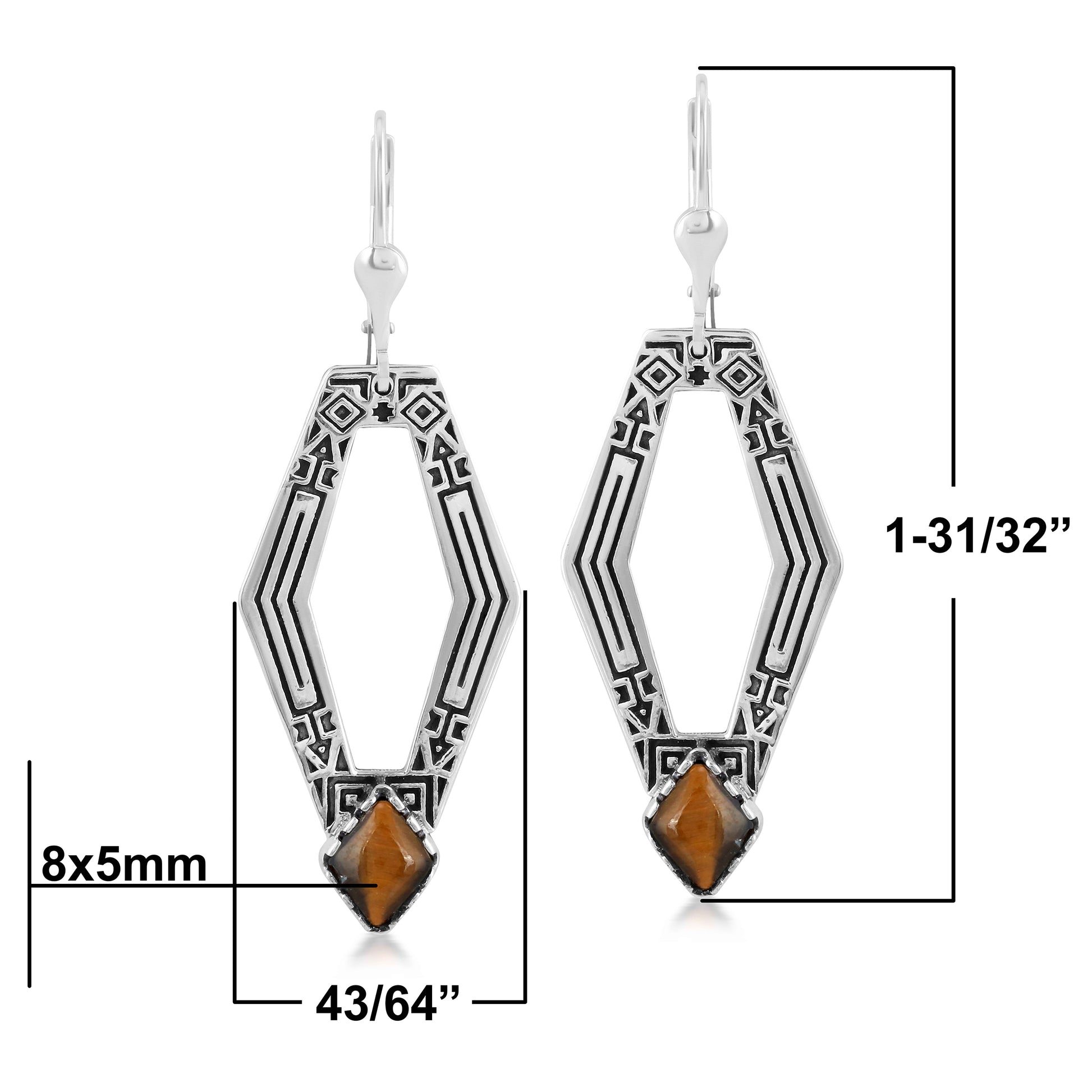 Introducing the American West Lever Back Earring, the perfect addition to any outfit! These stunning earrings feature genuine Tiger's Eye cabochons set inside a timeless, oxidized .925 Sterling Silver geometric shaped drop frame etched with an intricate Southwest-inspired design. While every gemstone in the world is naturally unique, we carefully select the stones for each piece, making your earring one-of-a-kind. All stones are ethically sourced from conflict free mines. Lever back closures for pierced ears are secure and comfortable, and you will find these earrings will help elevate just about any outfit, whether at work, Sunday brunch with friends, a date night with your honey or a special party or social event. The special lady in your life deserves to feel fabulous. Indulge your wife, grandmother, daughter, mom, girlfriend, best friend or even yourself! Packaged in a signature gift box with a pouch and an anti-tarnish bag, it is perfect for any gifting occasion like a birthday or anniversary, congratulations or thank-you. Whether you want to surprise someone with a unique present or simply celebrate a milestone or holiday, our American designed jewelry shows your loved one how much you really care. We have been creating jewelry since 1975, and we're proud to share our legacy with you. Made from nickel-free Sterling Silver with 92.5% reclaimed silver metal, this original piece is designed in Albuquerque, New Mexico, USA. Our experienced artisans have honed their craft for decades and hold to the highest standards of quality. Feel confident buying, wearing, and gifting our jewelry! If oxidation or tarnish darkens the piece over time, simply wipe with a polishing cloth to restore to desired finish.