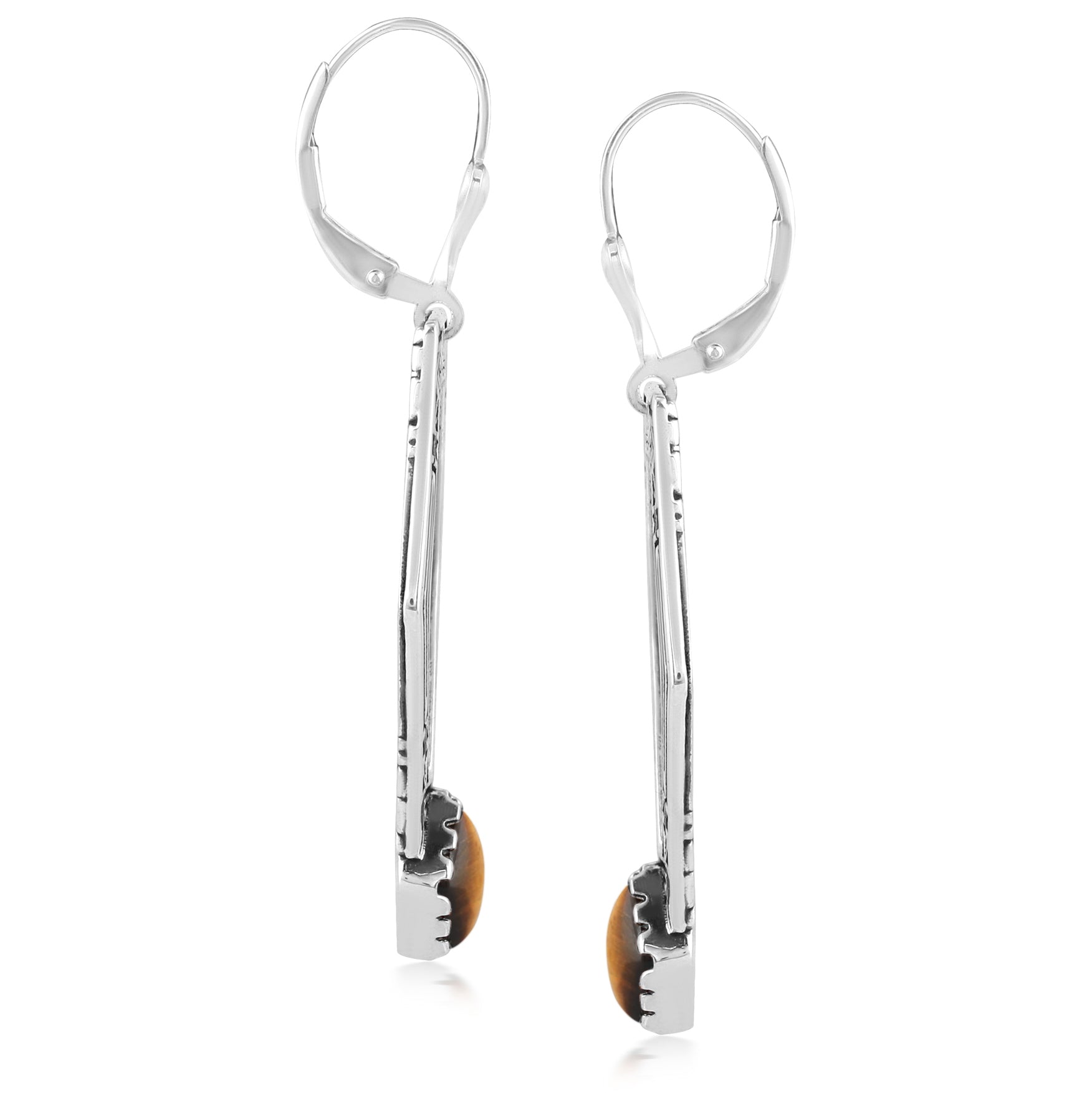 •Genuine Tiger's Eye gemstone cabochons set inside a oxidized, polished .925 Sterling Silver geometric shaped drop frame etched with Southwest-inspired designs
