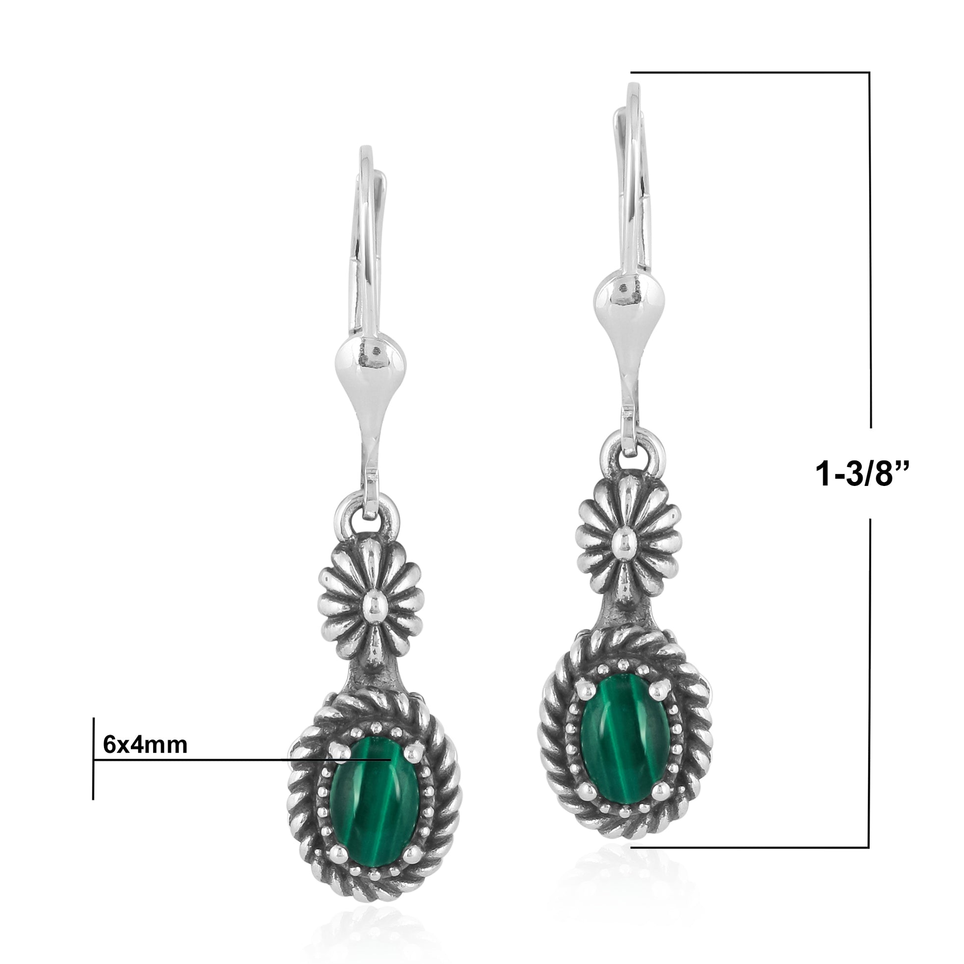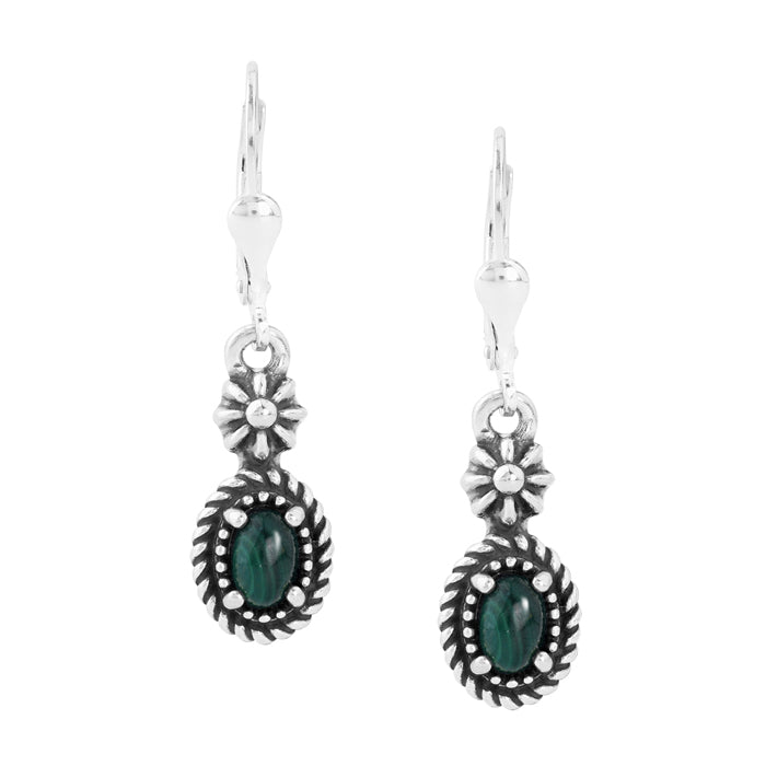 Beautiful Western Jewelry - Naturally colorful Southwestern sterling silver dangle earrings feature a flower motif and dangling is an oval-shaped 4x6mm green Malachite gemstone, set in a prong-setting and surrounded by a beautiful rope border. Leverbacks for pierced ears.