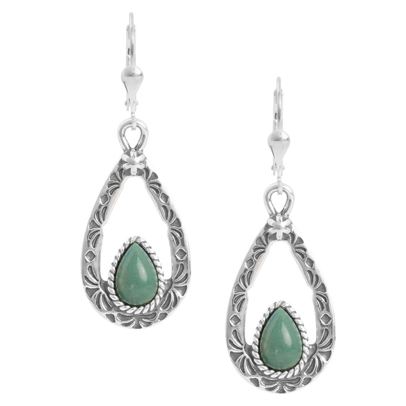 Beautiful Western Jewelry - Add a pop of color wearing these Southwestern nickel-free hypoallergenic 925 Sterling Silver dangle earrings that features a pear-shaped green Turquoise bezel-set gemstone surrounded by a rope-style border and framed with a pear-shaped stamped native design. Enjoy your genuine gemstone jewelry. Know that it is uniquely Yours, no two gemstones are alike! Naturally beautiful, genuine gemstones will vary, it is Mother Nature’s fingerprint.