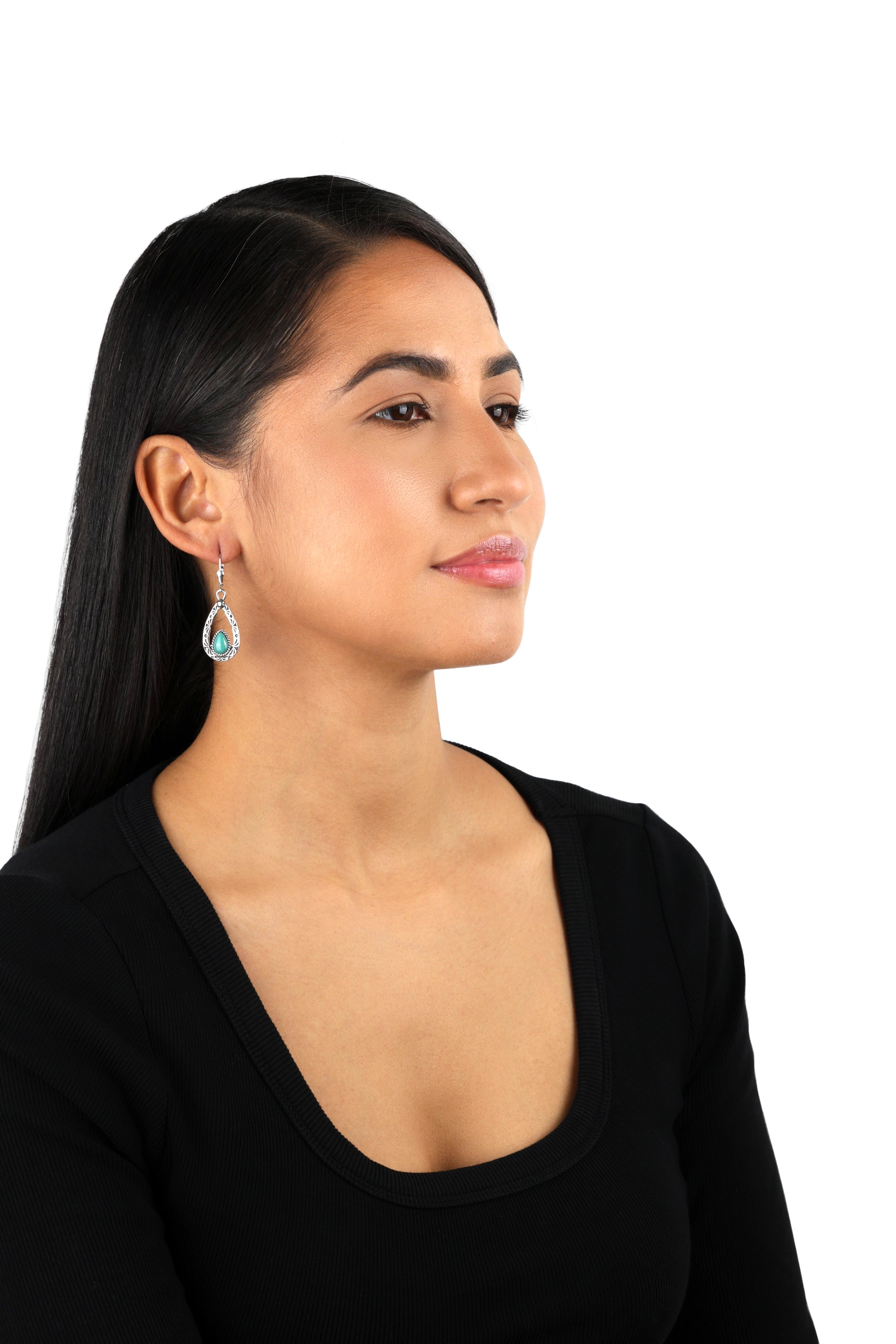 • Add a pop of color wearing these Southwestern 925 Sterling Silver dangle earrings that features a pear-shaped green Turquoise bezel-set gemstone surrounded by a rope-style border and framed with a pear-shaped stamped native design.