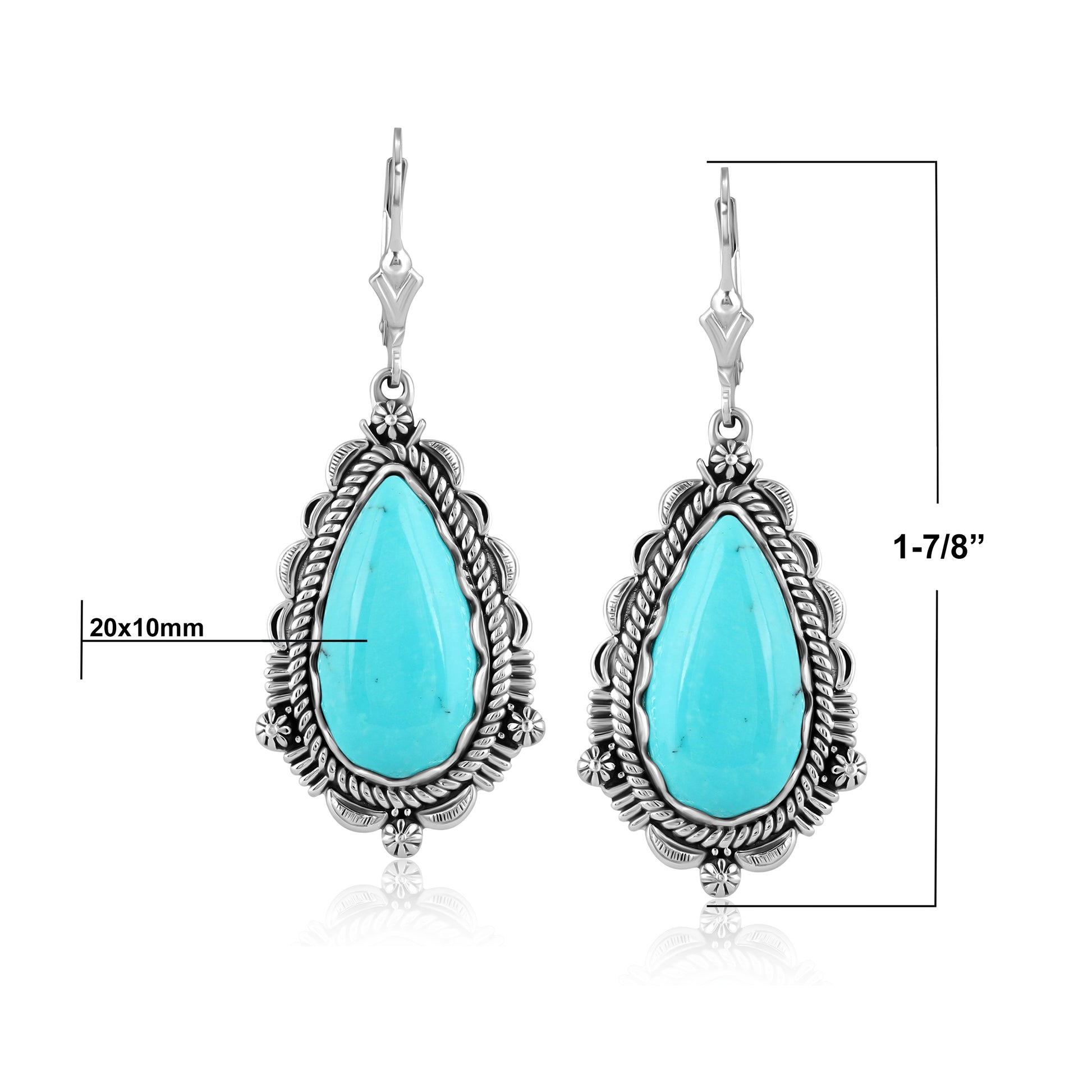• Southwest-inspired Sterling Silver earrings that features teardrop shaped 10mm x 20mm Kingman Turquoise gemstones set in a scalloped bezel-setting surrounded by a rope border, concha flower motifs and sun ray designs