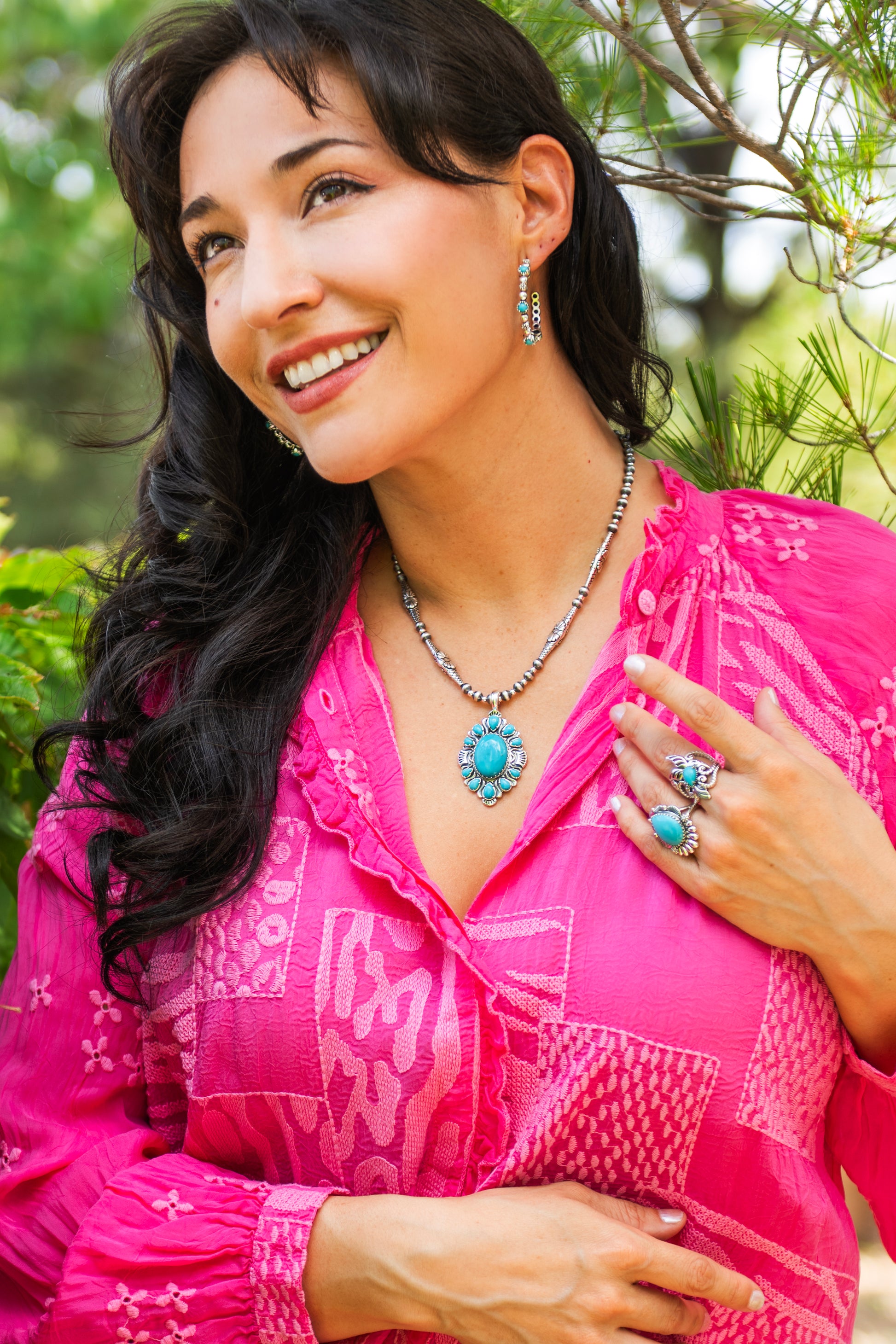 Ready for a statement that's all about southwestern flair? This enhancer showcases vibrant Kingman Turquoise cabochons in Sterling Silver, bringing instant color and boldness to your favorite chains or cords. The intricate setting and oxidized finish add character, making it a standout focal point for any fashion statement. At the center is a stunning oval cabochon in a serrated bezel. Pear cut Kingman Turquoise cabochons are fanned in a graduated arrangement both above and below with Sterling Silver prong settings and oxidized fan details. A polished top hinged bail accommodates most chains and cords. Turquoise has long been considered sacred due to its beautiful and unique appearance. Turquoise jewelry has been thought to bring luck to its wearer and have healing properties, making it an invaluable accessory for those looking to live a healthy and happy life. Every gemstone in the world is naturally unique, just like you! We carefully select the GIA certified gems for each piece, making your enhancer one-of-a-kind. You will find it will elevate any outfit! Whether at work, a date night with your honey or a special party or event– American West Jewelry will get you noticed. Get ready for compliments!