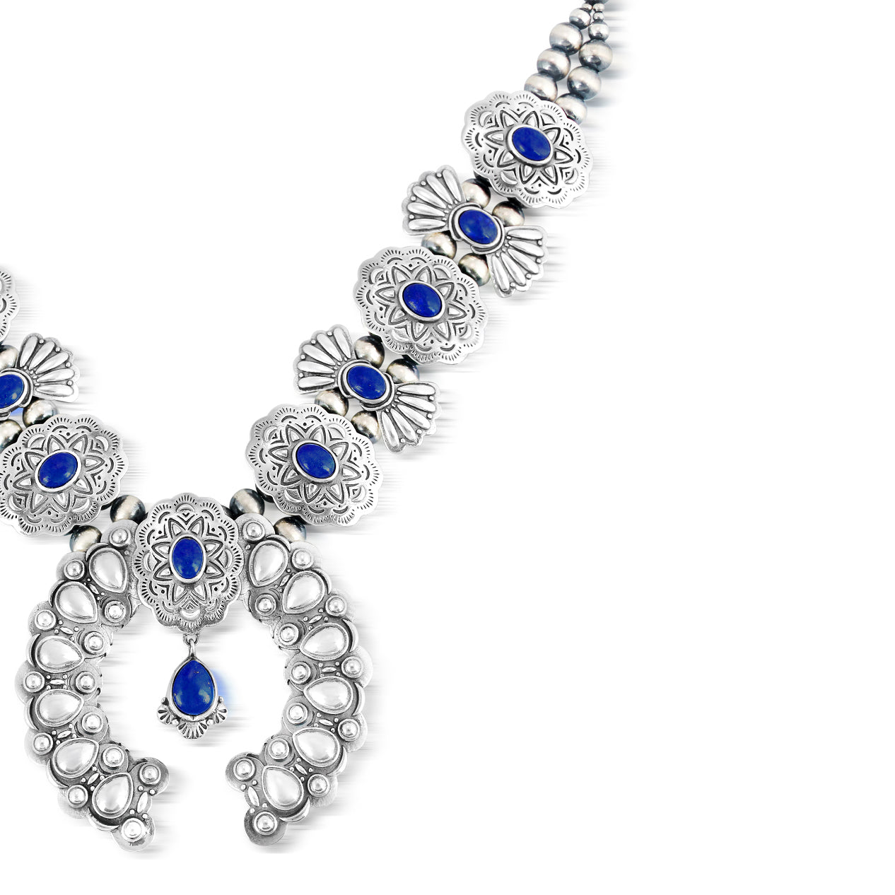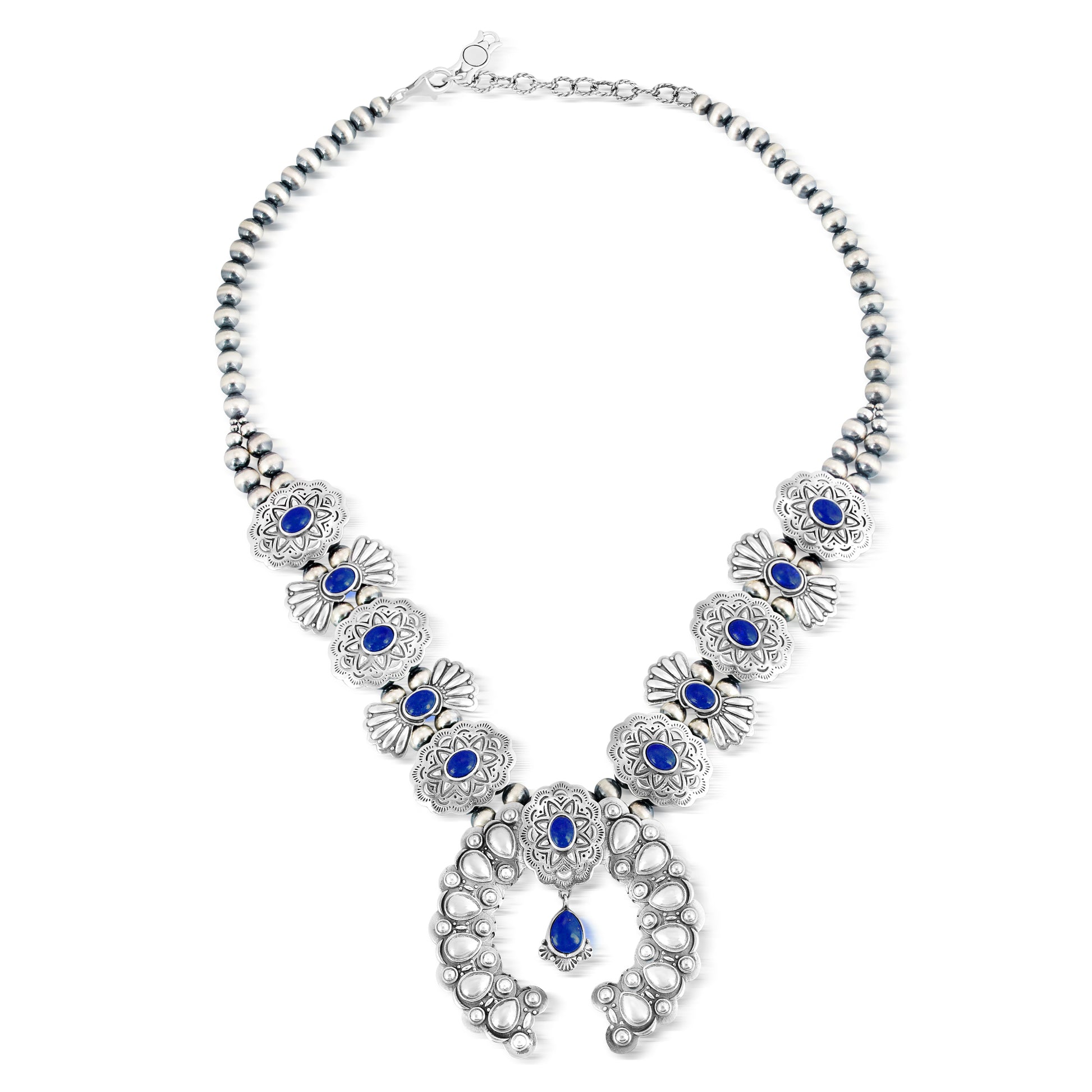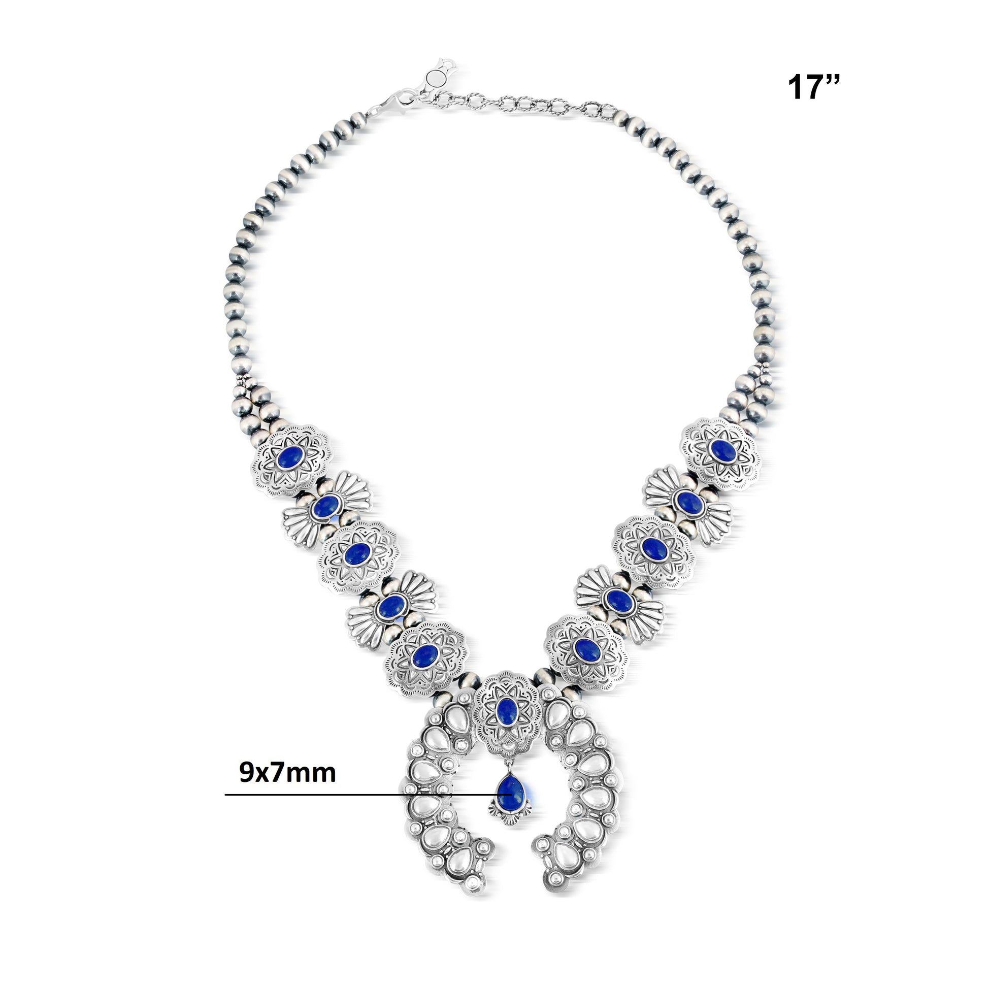 Sterling Silver Lapis Concha Butterfly Squash Blossom Necklace, 17 to 20 Inches