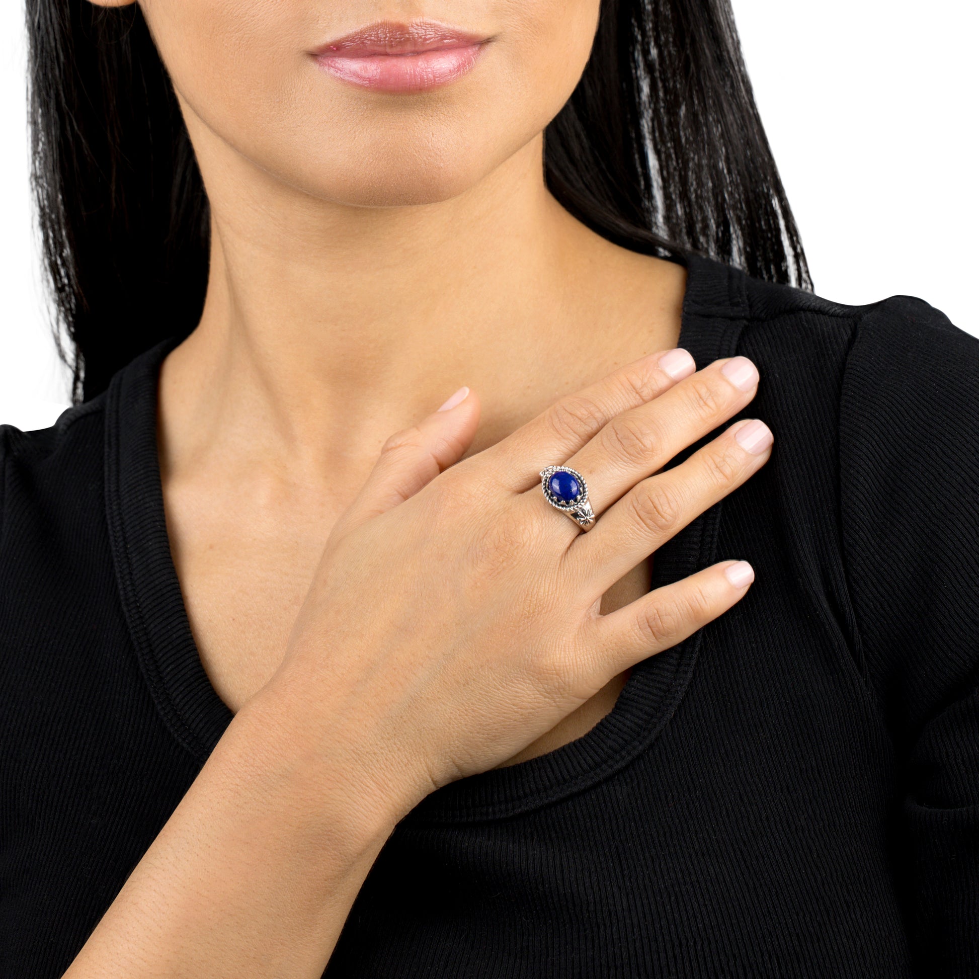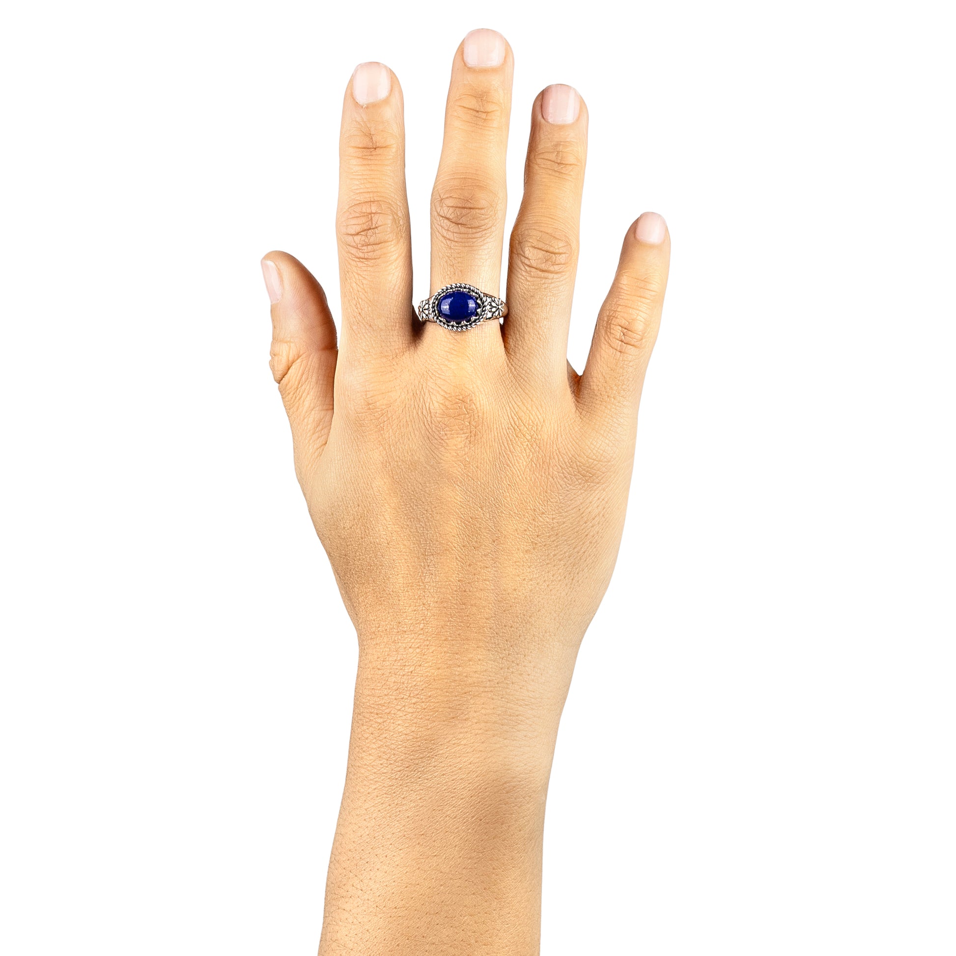 Gift yourself (or someone special) a great way to add some unexpected color and Southwestern style to your look with this gemstone concha ring. Unlike anything else in your jewelry collection, the oval-shaped Lapis cabochon sits in an east-west design with a serrated bezel, rope border, and concha flowers on either side. Lapis Lazuli, often associated with wisdom, truth, and enlightenment, is believed to activate the third eye chakra, facilitating deep intuition, psychic abilities, and spiritual growth. Every gemstone in the world is naturally unique, just like you! We carefully select every GIA certified gem, making your ring one-of-a-kind. You will find it will elevate any outfit! Whether at work, a date night with your honey or a special party or event– American West Jewelry will get you noticed. Get ready for compliments!