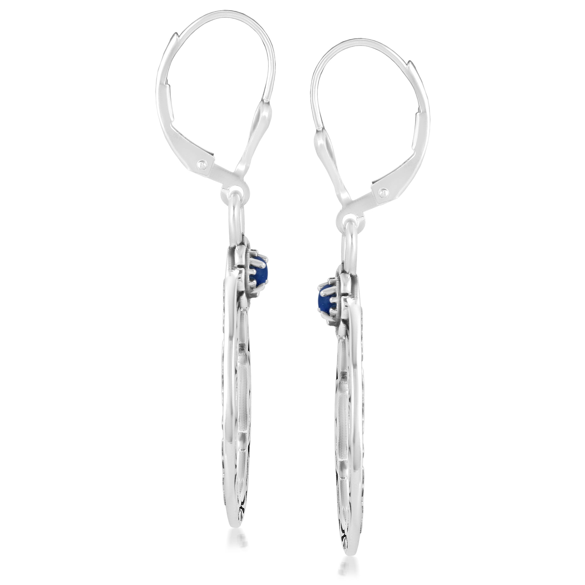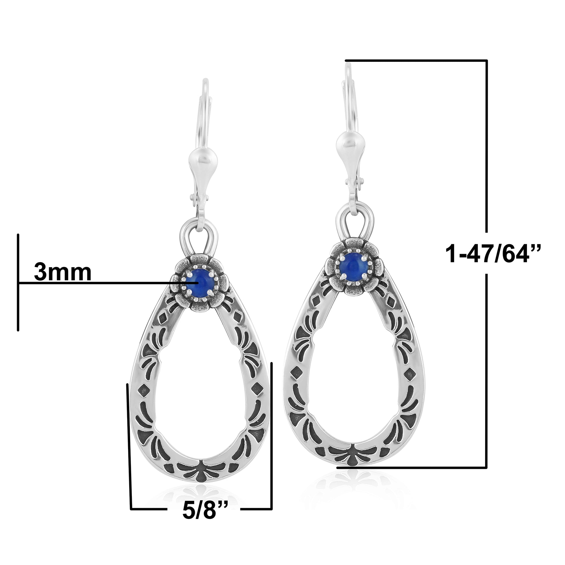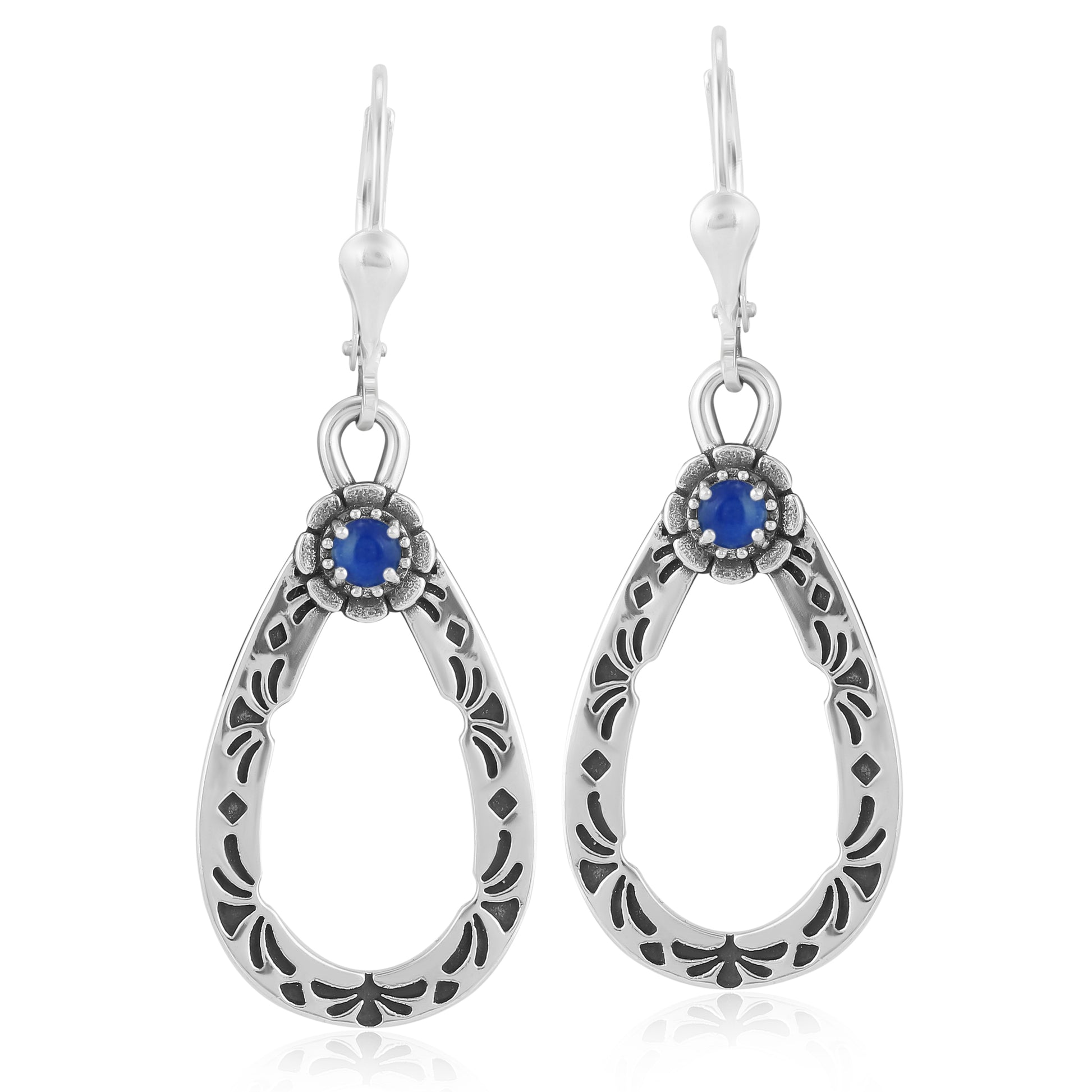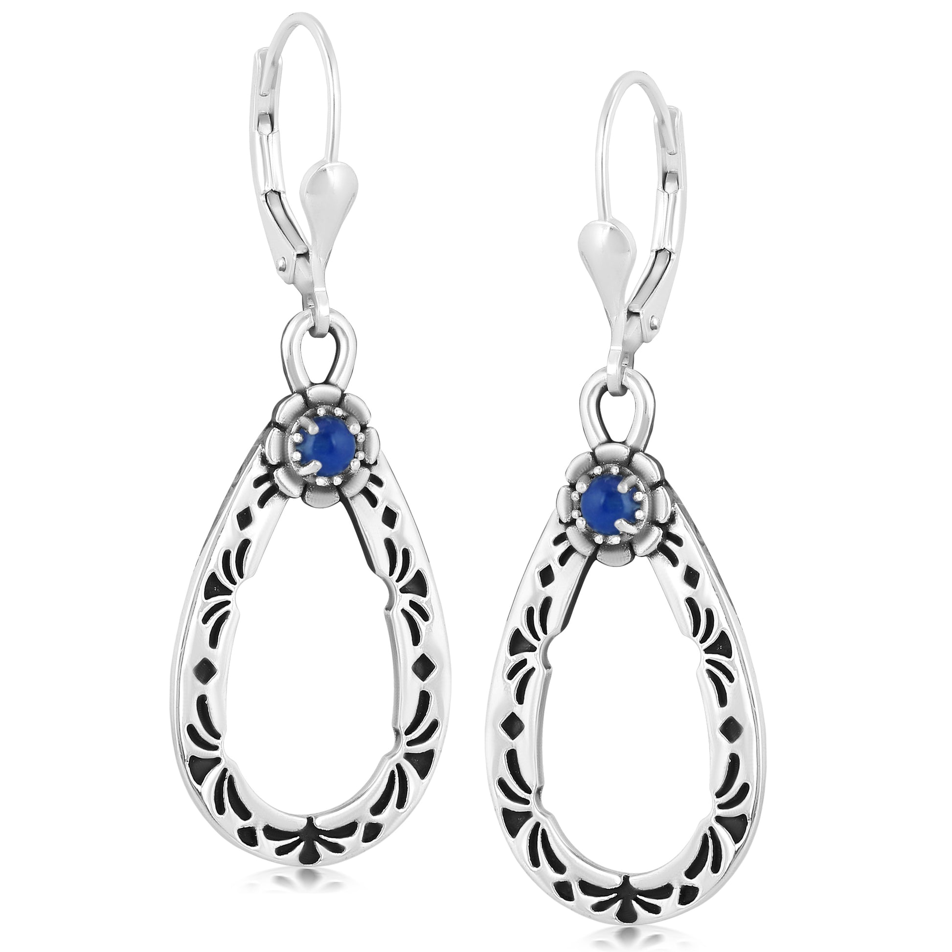 These naturally colorful Southwestern Sterling Silver dangle earrings feature intricately carved, pear-shaped Sterling Silver drop with a genuine, round prong set Lapis Lazuli gemstone adorning the top; all with an oxidized, polished finish. While every gemstone in the world is naturally unique, we carefully select the stones for each piece, making your earring one-of-a-kind. All stones are ethically sourced from conflict free mines. Lever back clutches for pierced ears are secure and comfortable, and you will find these earrings will help elevate just about any outfit, whether at work, Sunday brunch with friends, a date night with your honey or a special party or social event. The special lady in your life deserves to feel fabulous. Indulge your wife, grandmother, daughter, mom, girlfriend, best friend or even yourself! Packaged in a signature gift box, it's perfect for any gifting occasion like a birthday or anniversary, congratulations or thank-you. Whether you want to surprise someone with a unique present or simply celebrate a milestone or holiday, our American designed jewelry shows your loved one how much you really care. We have been creating jewelry since 1975, and we're proud to share our legacy with you. Made from nickel-free Sterling Silver with 92.5% reclaimed silver metal, this original piece is designed in Albuquerque, New Mexico, USA. Our experienced artisans have honed their craft for decades and hold to the highest standards of quality. Feel confident buying, wearing, and gifting our jewelry! If oxidation or tarnish darkens the piece over time, simply wipe with a polishing cloth to restore to desired finish.