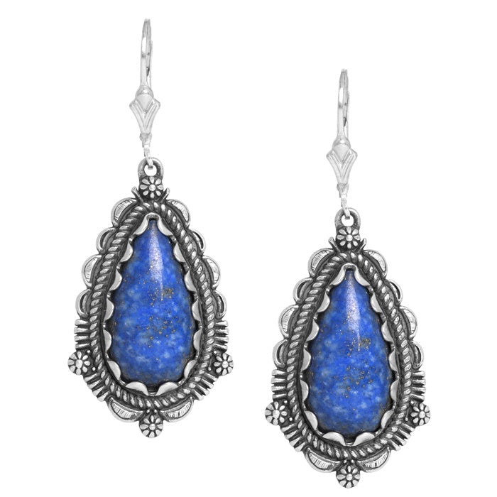 These naturally colorful Southwestern earrings feature pear-shaped 10x20mm Lapis gemstones set in a scalloped bezel-setting surrounded by a rope border, concha flower motifs and sun ray designs. Sun rays are a symbol of constancy. Leverbacks for pierced ears only. These earrings measure 3/4 inch wide by 1-7/8 inches long including the leverback. Whether at work, a date night with your honey or a special party or event– American West Jewelry will get you noticed. Get ready for compliments!