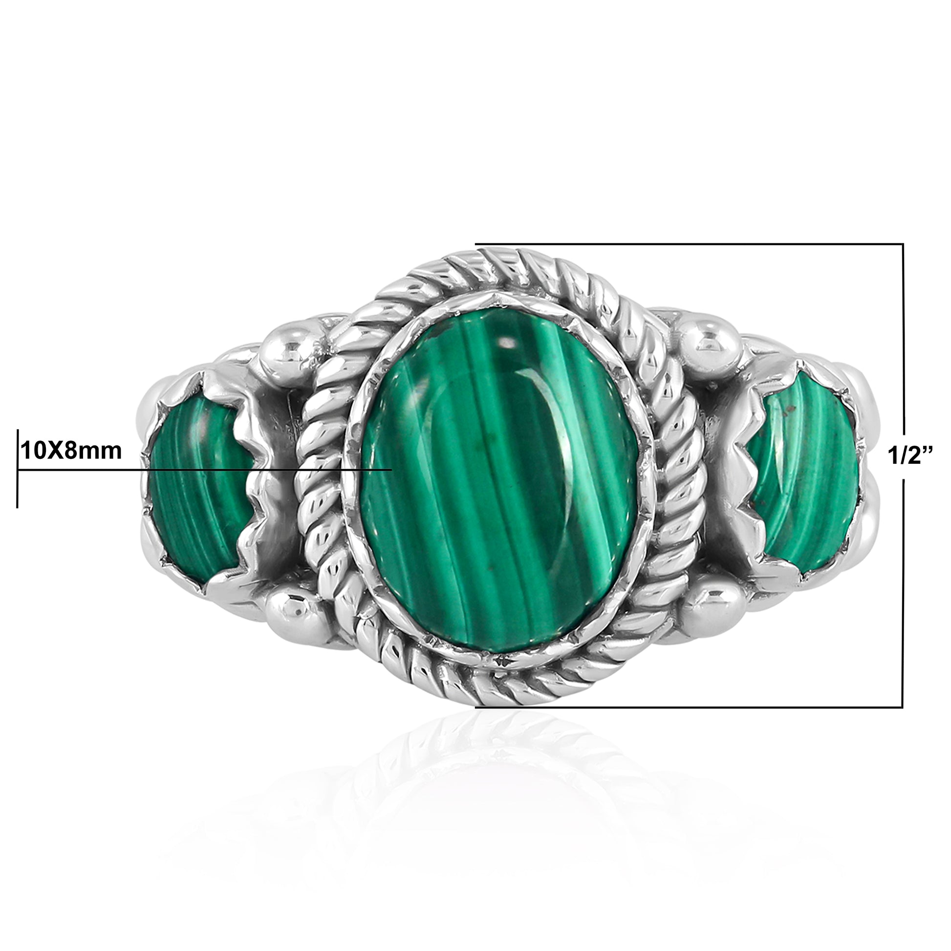 Introducing the American West Jewelry 3-Stone Ring. This naturally colorful, Southwest-inspired Sterling Silver ring features 3 oval Malachite gemstones, with a decorative bezel setting with rope detailing and a split shank in a polished, oxidized finish. Create a bold statement and elevate your look. This beautiful ring is designed from nickel-free Sterling Silver and is available in a range of sizes to fit every finger. Green Malachite delivers a delightful burst of natural color that enhances your signature style. Malachite protects the creative mind from the analytical mind, allowing the artist within oneself to flourish.