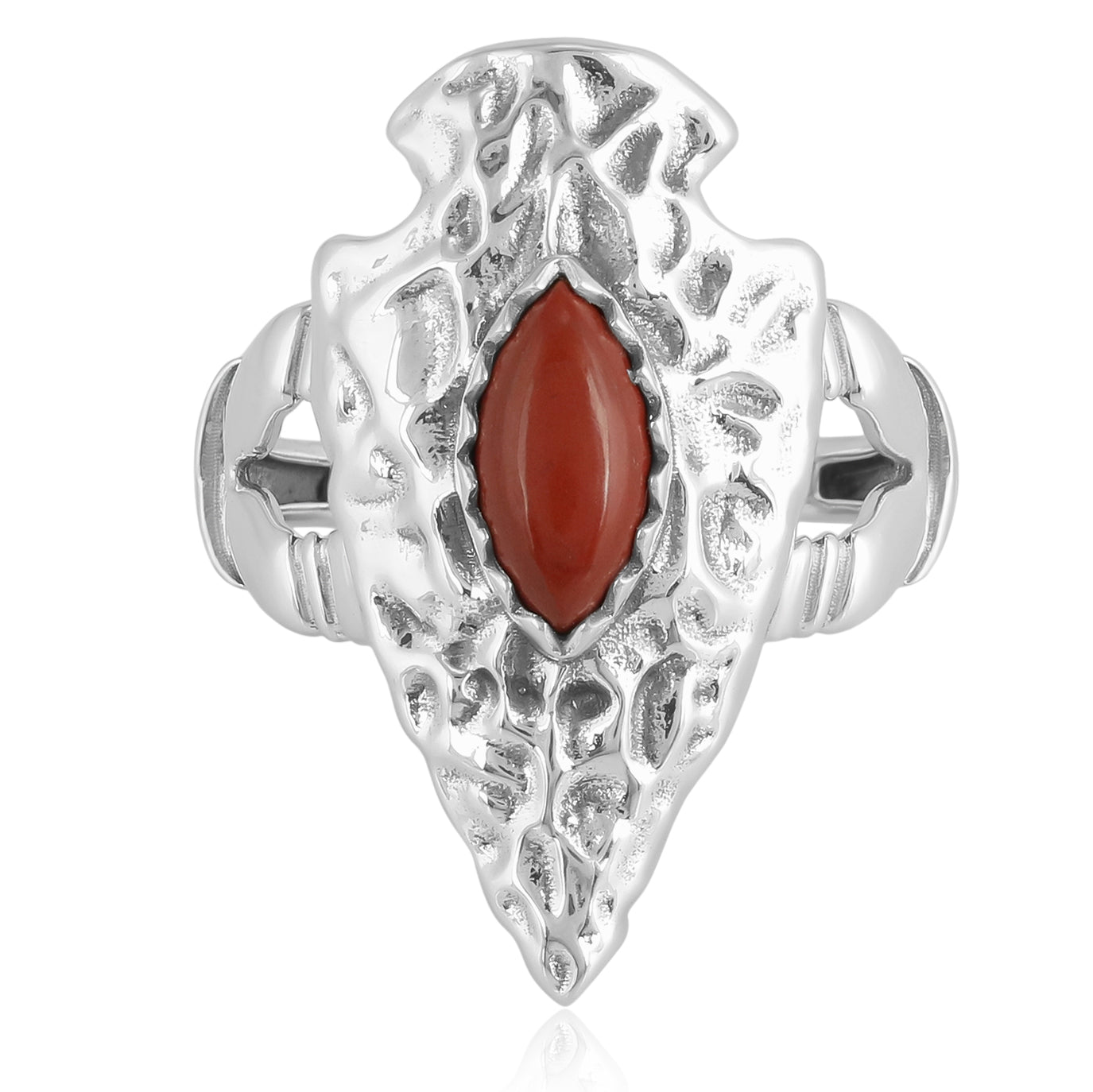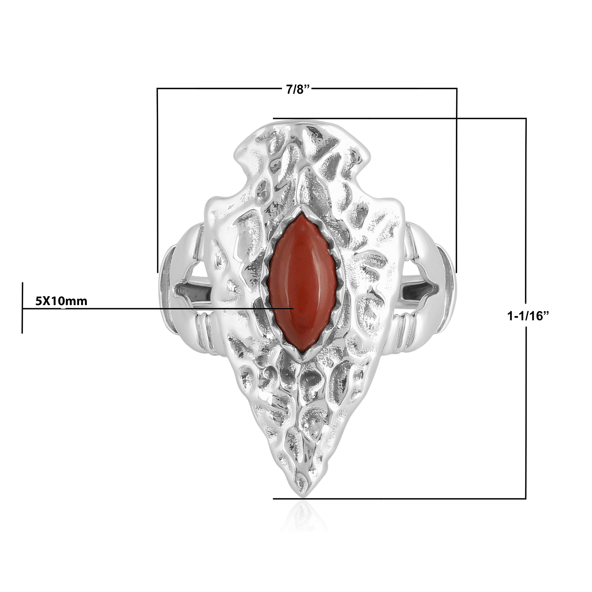 • Marquise cut 5x10mm genuine Red Jasper gemstone set in a serrated bezel on an oxidized, textured arrowhead-shaped Sterling Silver base with a split-shank band