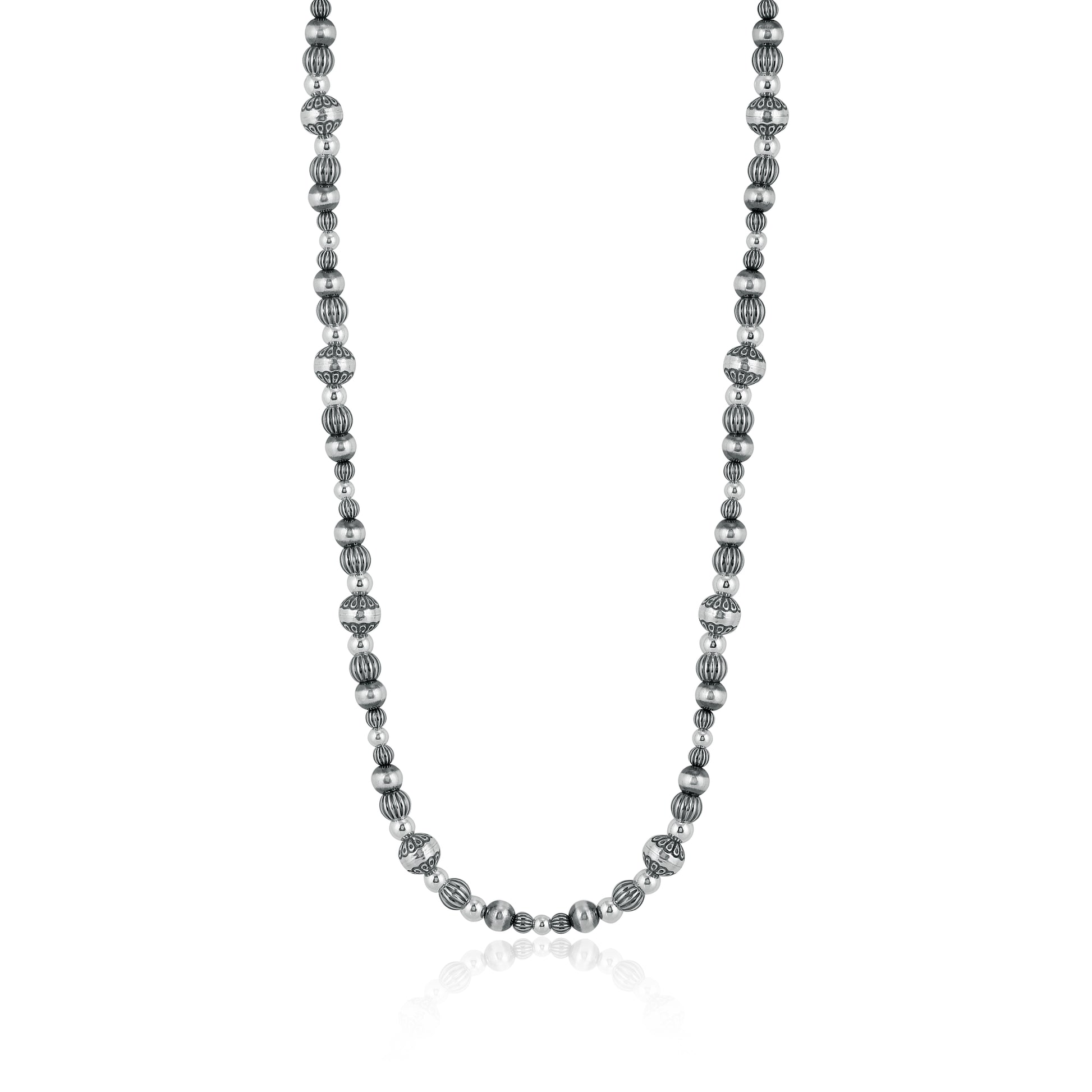 This gorgeous necklace is giving us major go-with-anything vibes. It features a captivating array of stamped and polished Sterling Silver beads to add a touch of shine to your jeans and t-shirts, leggings and tunics, or skirts and blouses. This single strand of mixed includes 8 mm native pearls, 6 mm desert and rope beads, 4 mm desert and rope beads, all in an alternating pattern. This mixed silver beaded necklace has an oxidized, polished finish. You will want to wear this every day! This exclusive Southwestern inspired design captures the lifestyle and rich history of New Mexico.
