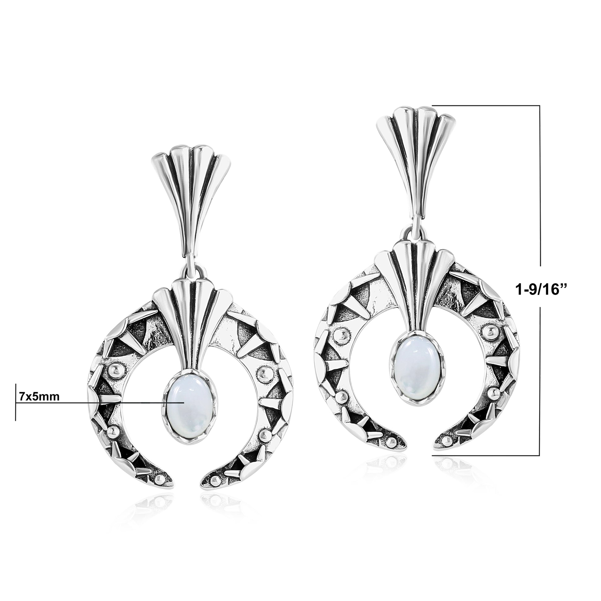 Showcasing a sacred symbol and genuine gemstones of the Southwest, these Naja earrings are beautifully crafted in Sterling Silver with great attention to detail. In native culture, a naja, or crescent-shape, is believed to have protective and symbolic significance, representing fertility and spirituality. Designed by Fritz Casuse, Navajo artist and jeweler, these dangle earrings feature najas with bezel-set oval White Mother of Pearl gemstones and oxidized, polished accents. Post and clutch closures are secure and comfortable (for pierced ears only). Mother of Pearl embodies the balance of nurturing love and the radiant energy of the sun, making it a powerful stone for emotional healing and purity and tranquility.