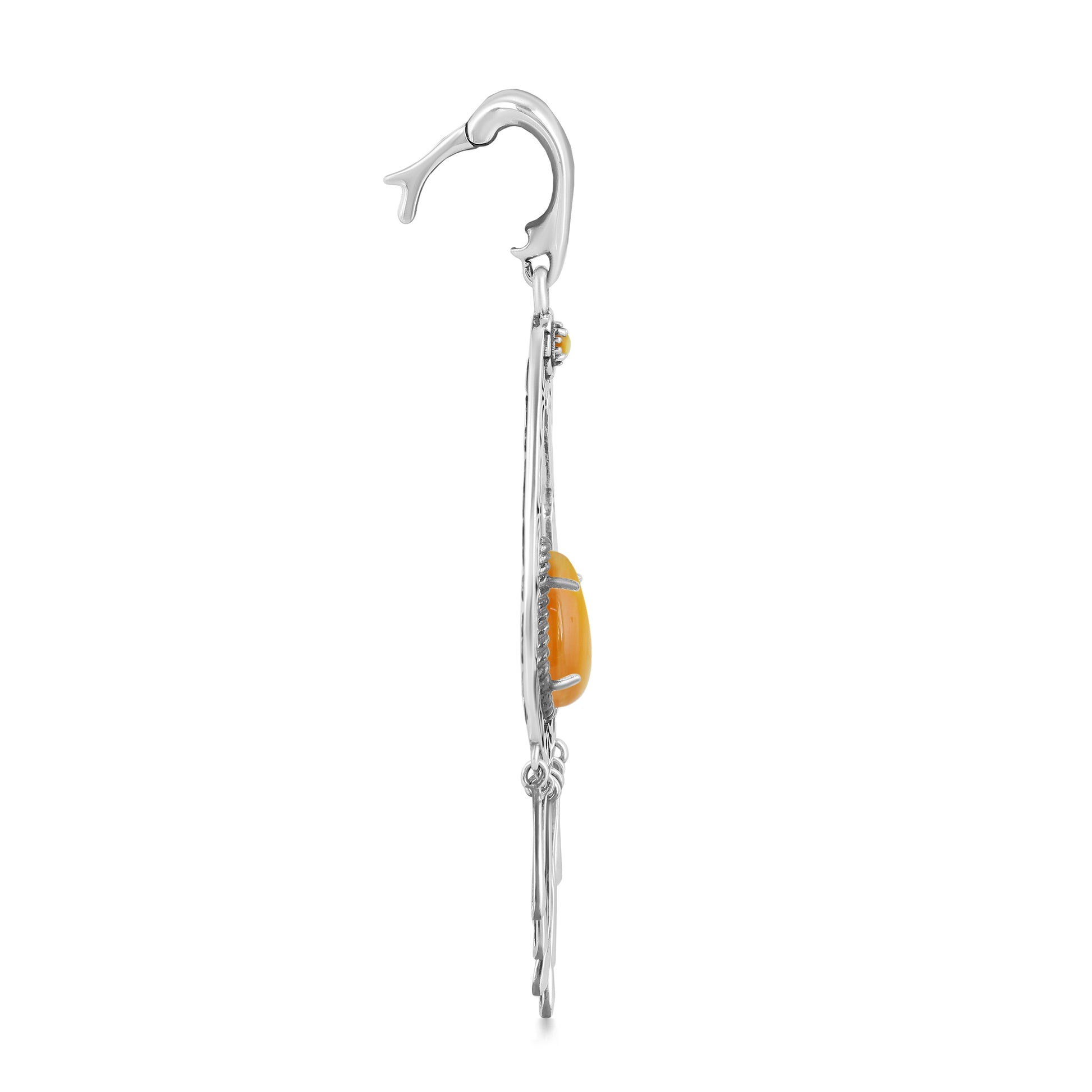 Looking for ways to make your style feel more hand-selected? This finely detailed enhancer, anchored by a pear-shaped gemstone cabochon and dangling with Sterling Silver paddles, is it. Handcrafted with a bohemian flair, this elegant pendant features a stunning, pear-shaped cabochon of Yellow Mother of Pearl at its heart. The serene, creamy-yellow gemstone glows with a subtle iridescence, beautifully complemented by the intricate openwork of the Sterling Silver frame. The frame's ornate floral-like carvings and delicate fringe of polished silver dangles create graceful movement, making this a truly captivating and unique piece.
