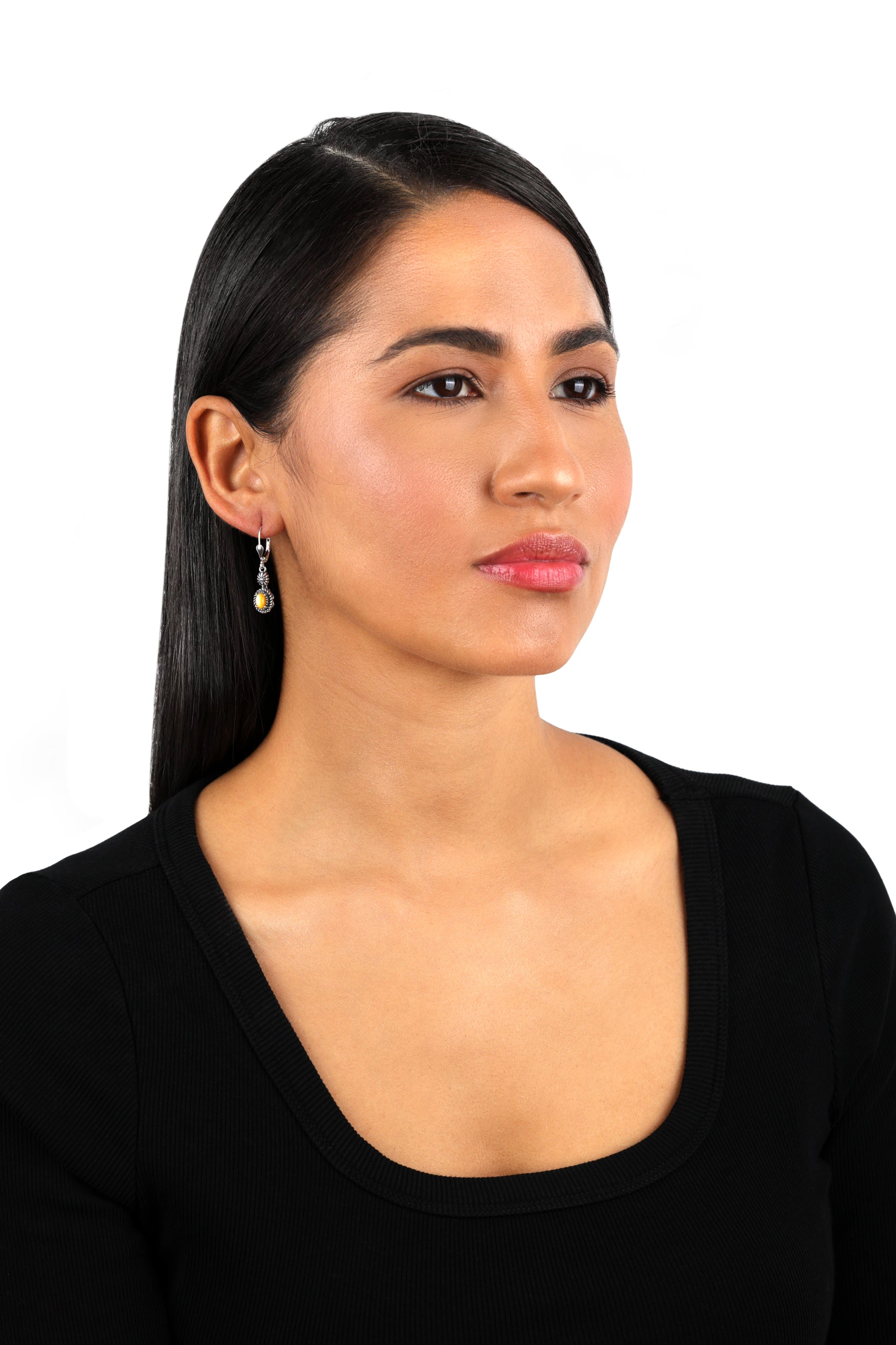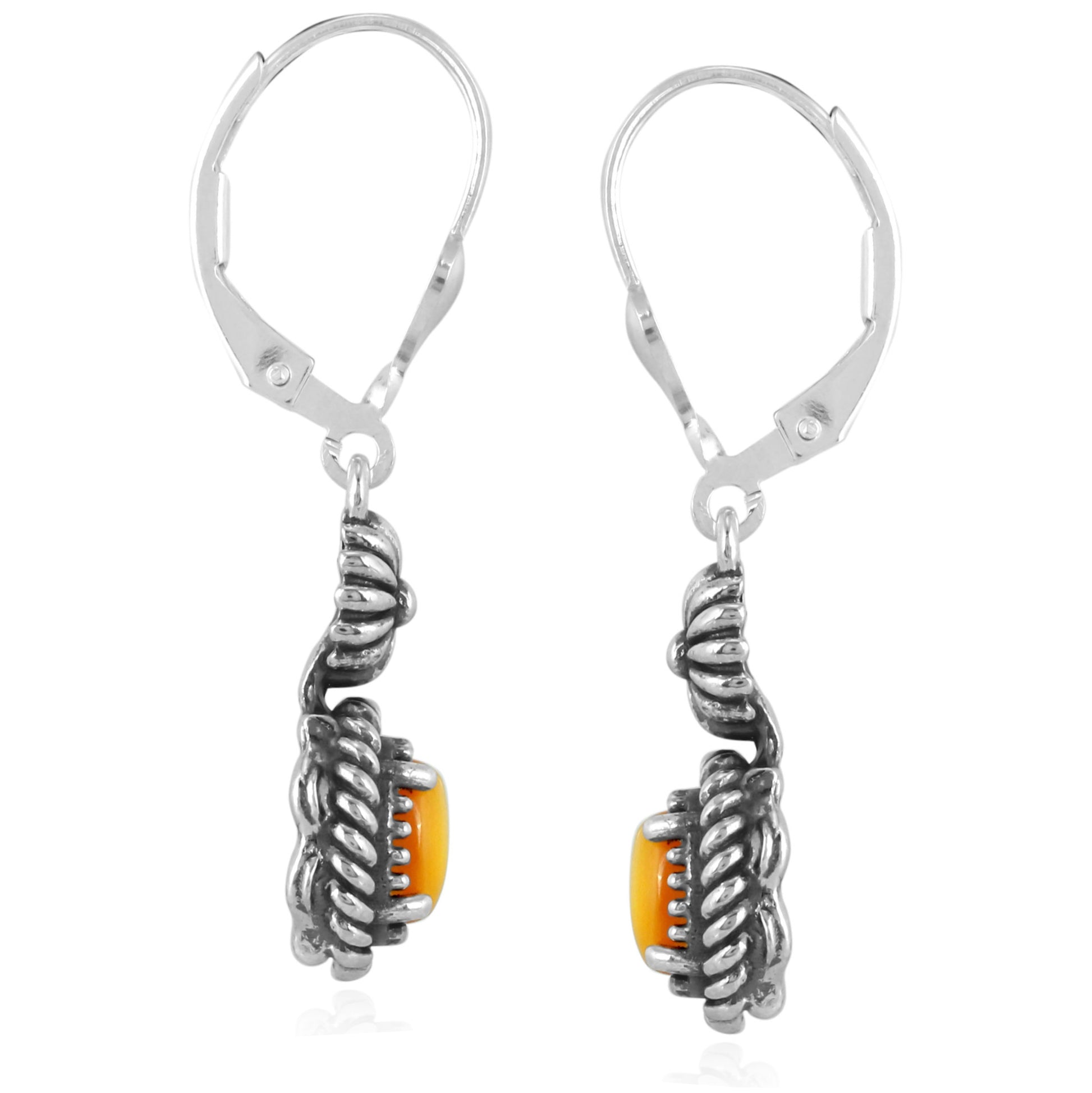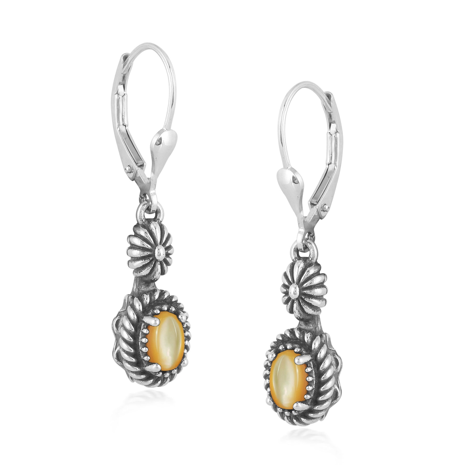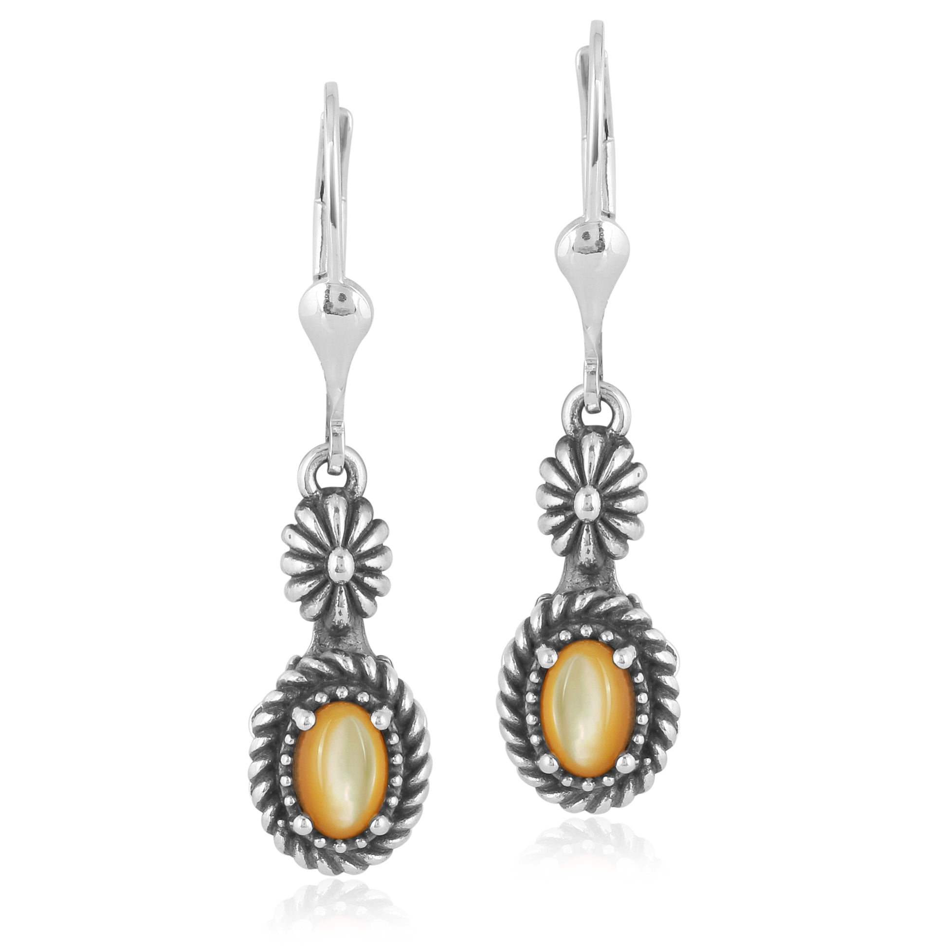 • Naturally colorful Southwestern sterling silver dangle earrings feature a flower motif and dangling is an oval-shaped 4x6mm Yellow Mother of Pearl gemstone, set in a prong-setting and surrounded by a beautiful rope border. Polished, oxidized finish