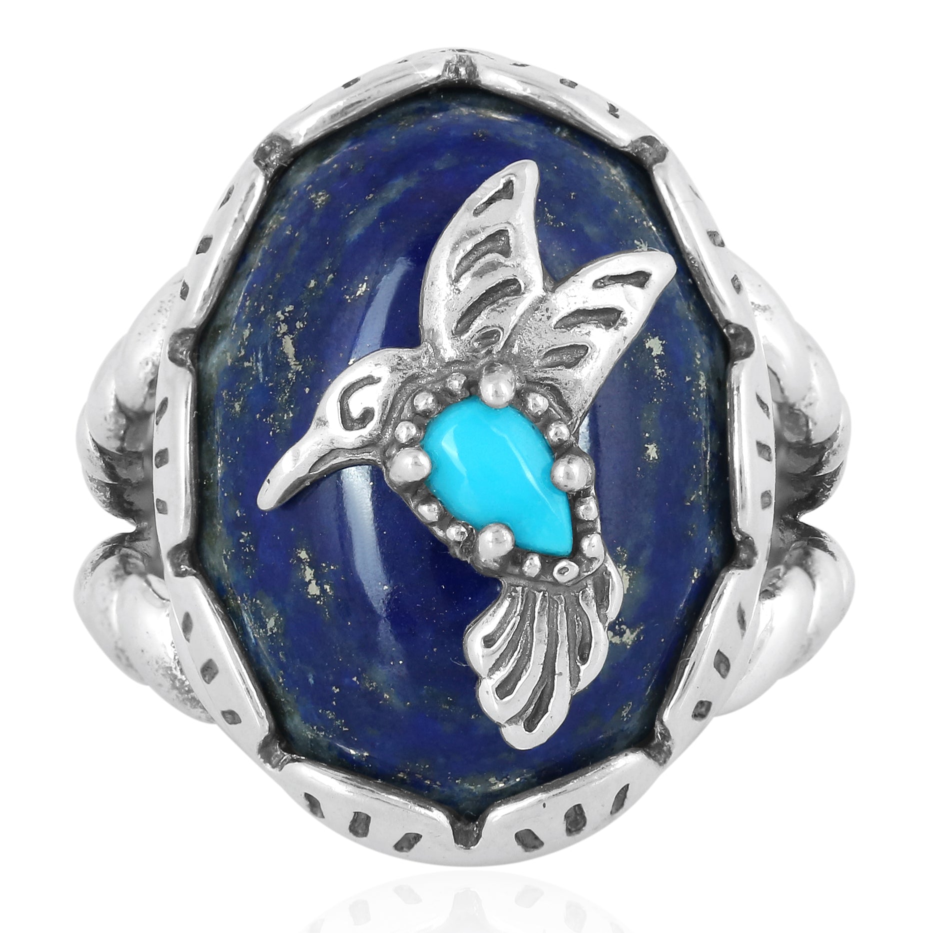 • Sterling Silver ring features oval-shaped Lapis gemstone with Sterling Silver hummingbird design; pear-shaped Turquoise gemstone in the center; scalloped border ; split shank rope style band