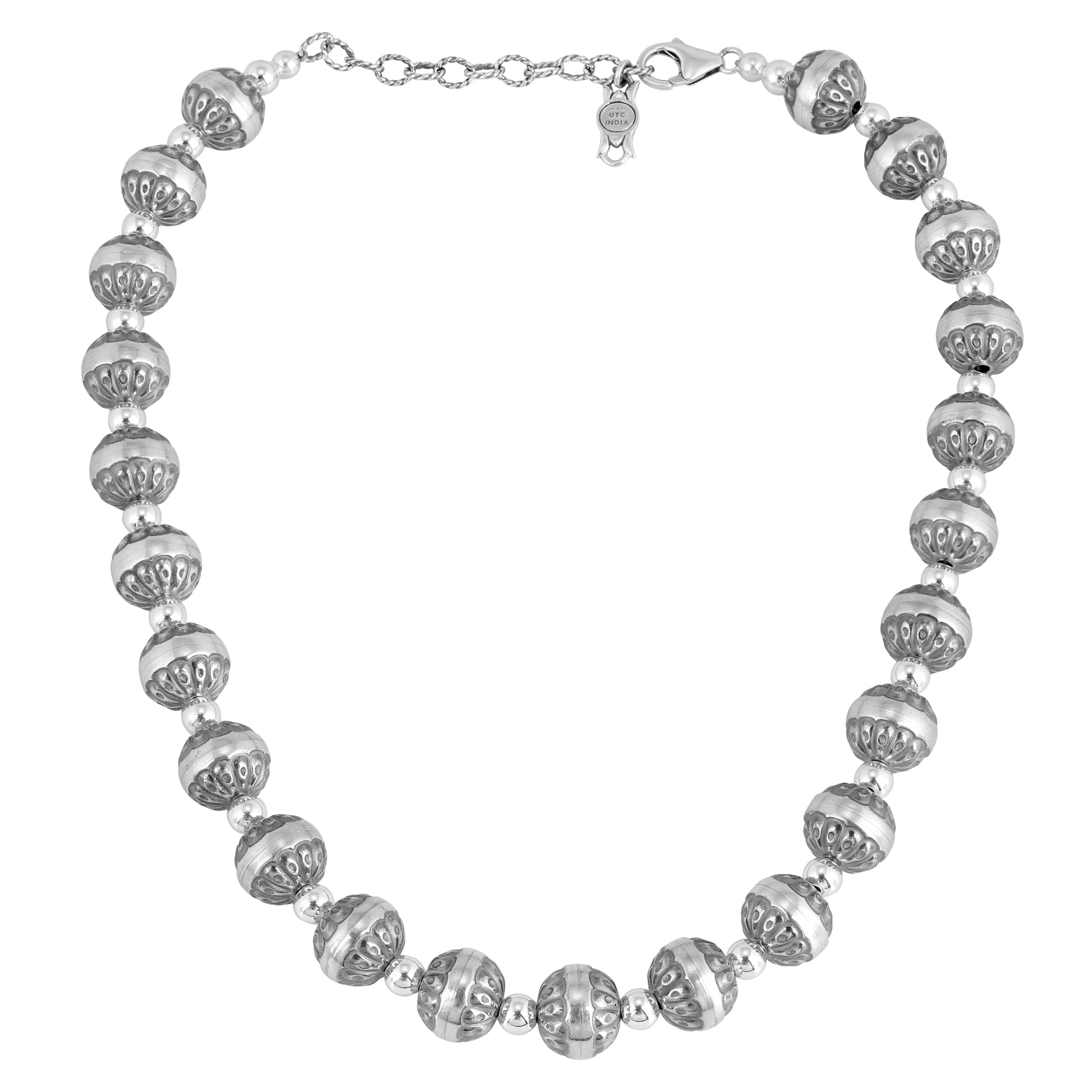 Add the shine of silver to any look with this versatile necklace made from real, nickel-free, stamped, .925 Sterling Silver native pearl beads with detailed concha engravings. The "native pearl" is a signature element of Southwestern fashion. The oxidized finish with polished accents help accentuate the intricate designs featured on each bead. Available in both 17 and 21 inch lengths, the necklace features a 3" textured extender, and fastens securely with a lobster-claw clasp. This necklace will elevate any outfit! Whether at work, a date night with your honey or a special party or event, wear American West jewelry and get ready for compliments!