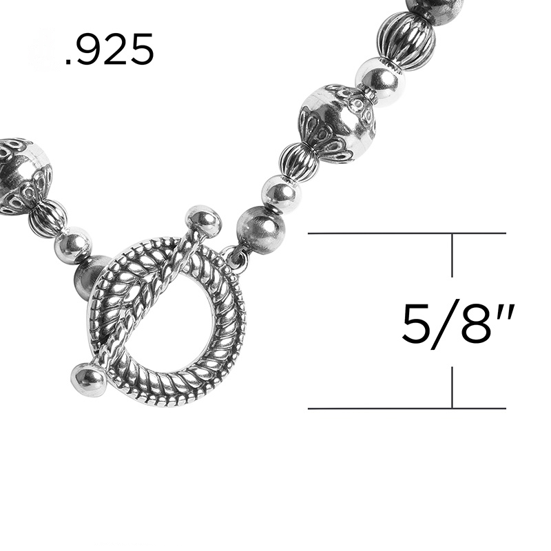 Showcase your inner boheme with this personality-infused bracelet strung with an array of textured beads. This simply beautiful bracelet of Sterling Silver should be a staple in your jewelry wardrobe. It is made of native pearl beads, with rope detailing and smooth Silver alternating beads. The oxidized, polished finish shows off the detail of craftsmanship. The toggle measures 5/8 wide.
