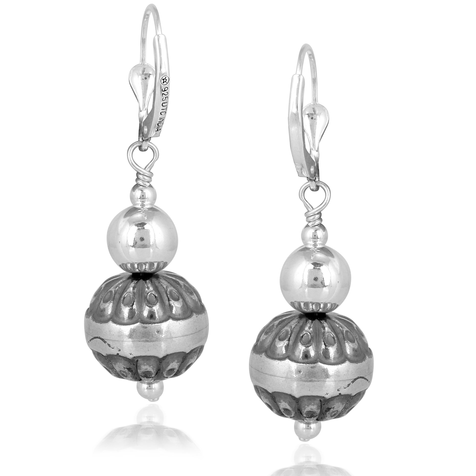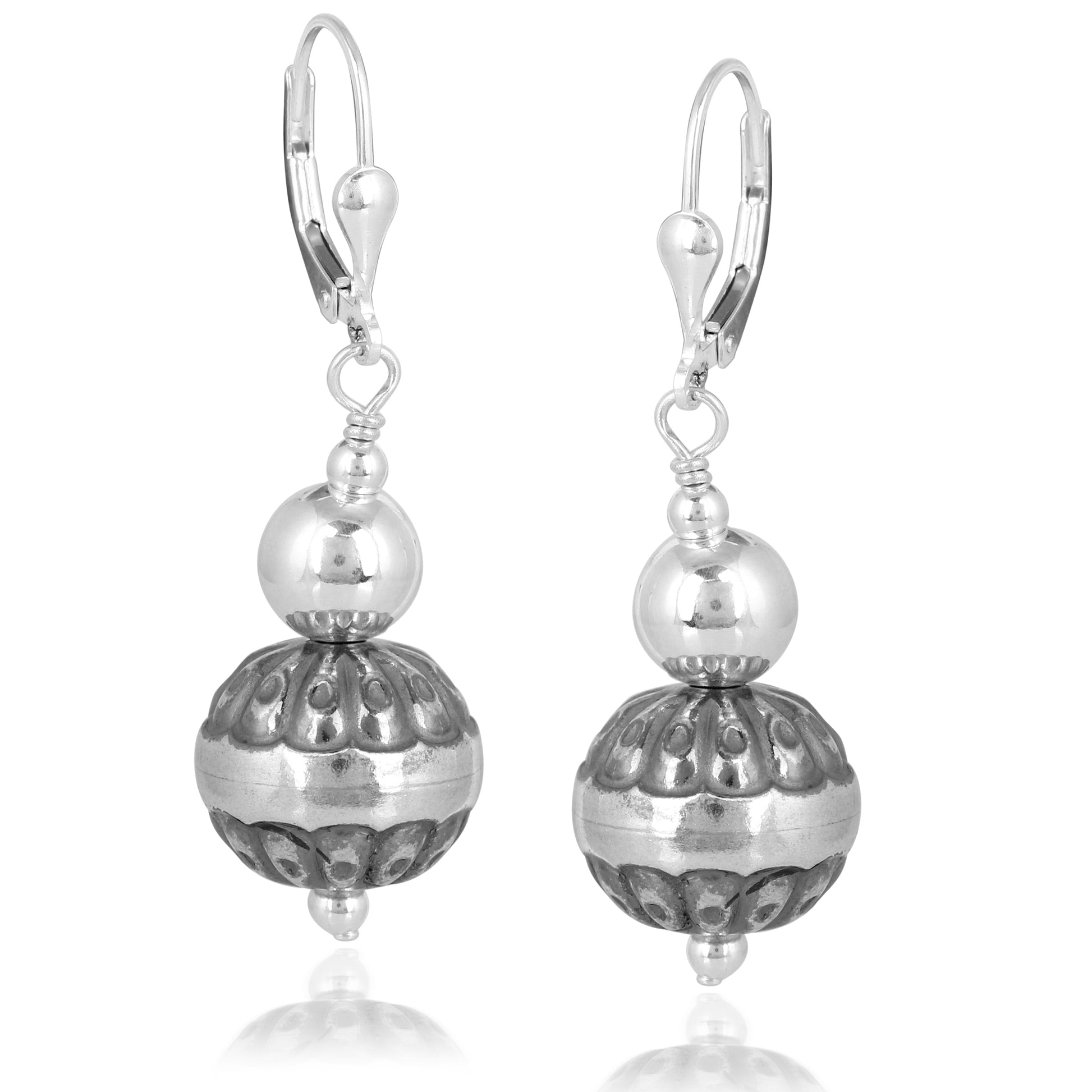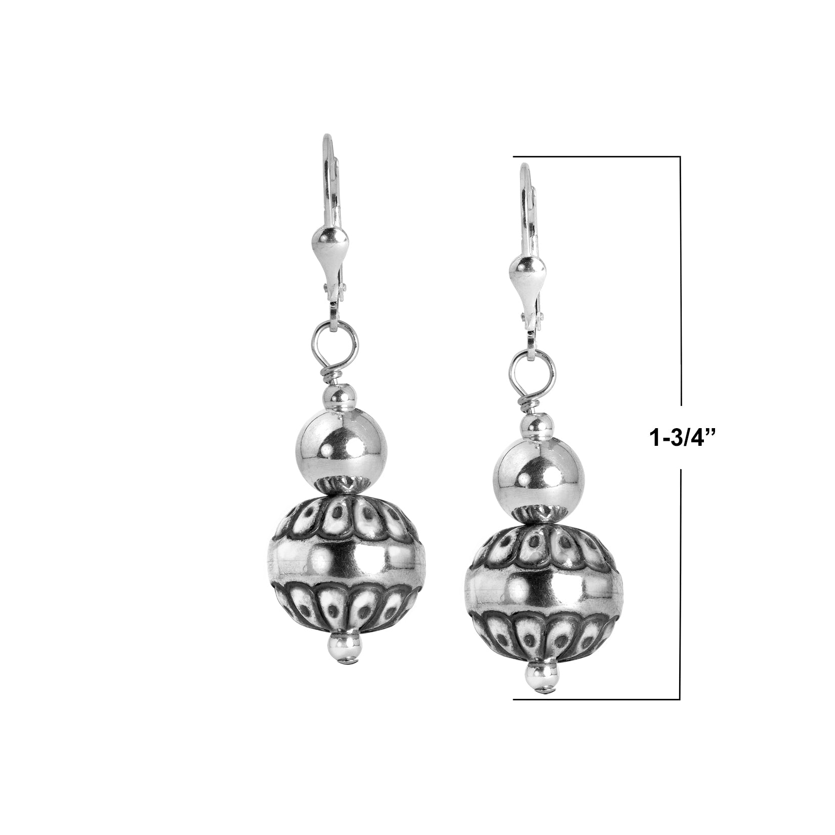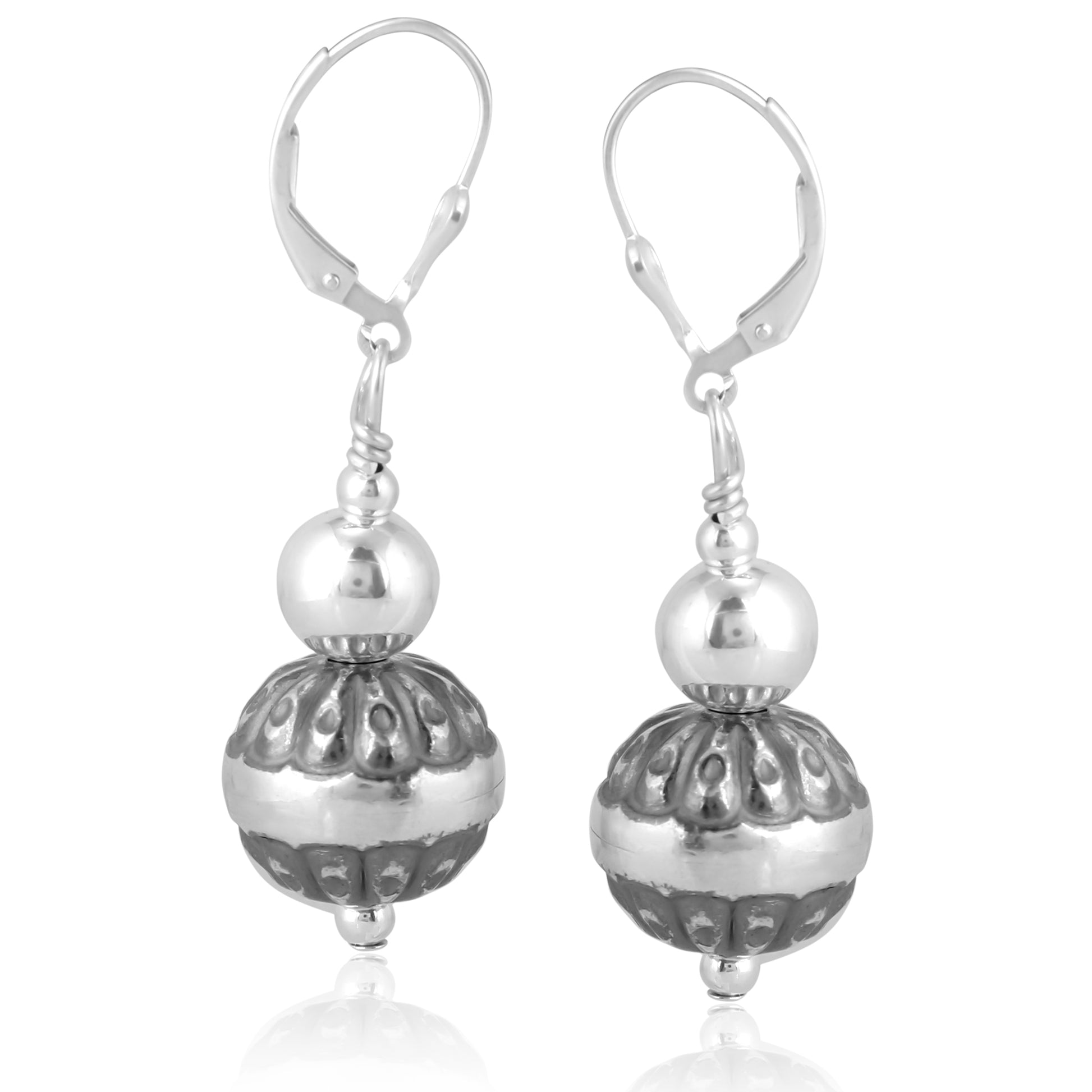Accent your everyday attire with these beautiful beaded earrings. These versatile Sterling Silver native pearl dangle earrings feature 3mm & 8mm polished Sterling Silver beads with an 8mm concha stamped flower Sterling Silver beads. Lever backs closures are secure and comfortable (for pierced ears only).