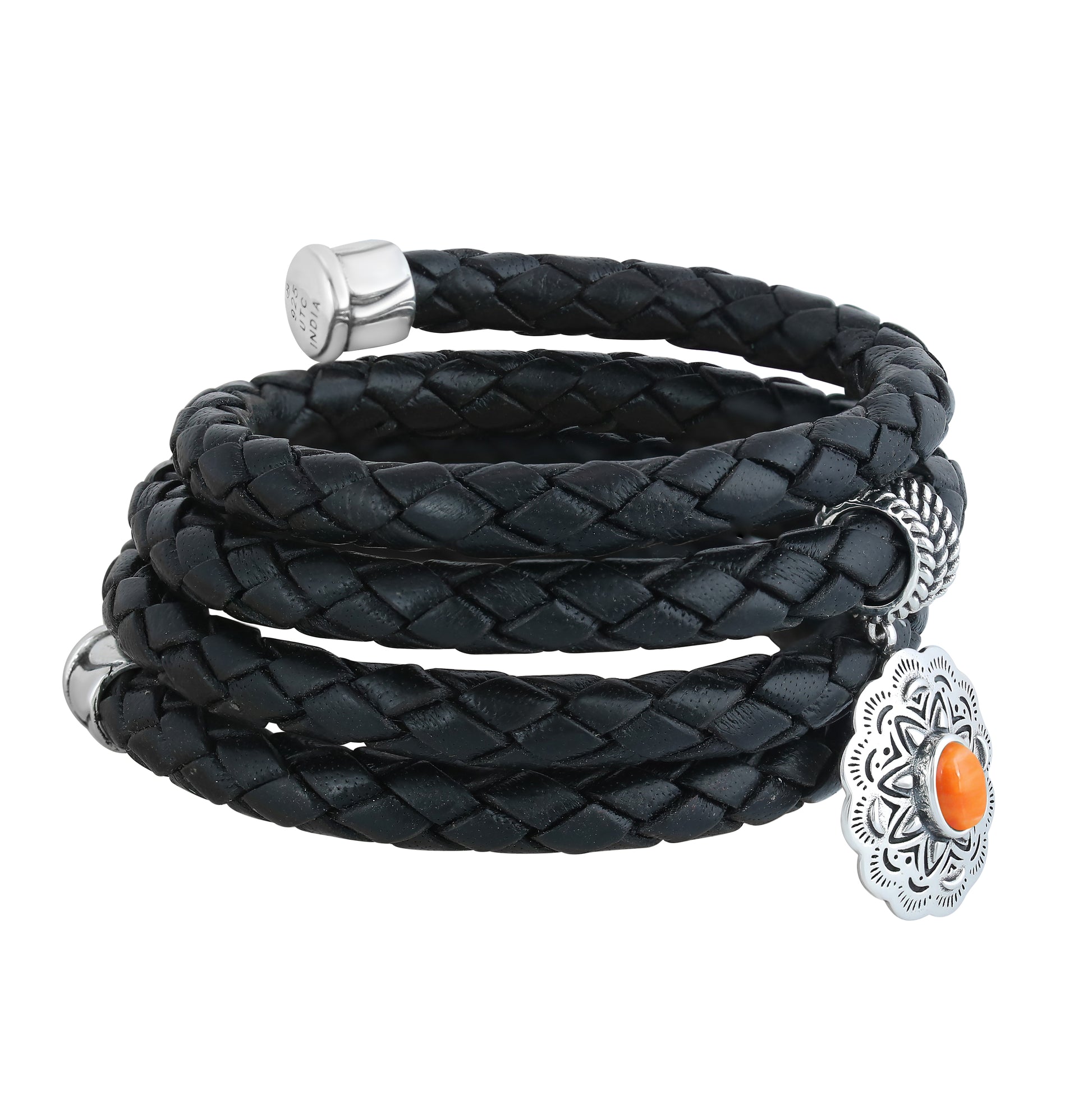 Add a touch of Southwestern charm to your wardrobe with the American West Jewelry Sterling Silver Concha Leather Bracelet. This standout piece features a braided genuine leather coil wrap design, accented with a Sterling Silver concha charm with sun and fan designs and a bezel-set oval, Orange Spiny Oyster cabochon as well as Sterling Silver end caps. This bracelet measures .75" wide x 24" long and fits most wrist sizes. The vibrant Orange Spiny Oyster shell symbolizes the life that flourished in the mystical oceans, far away from the desert Southwest.
