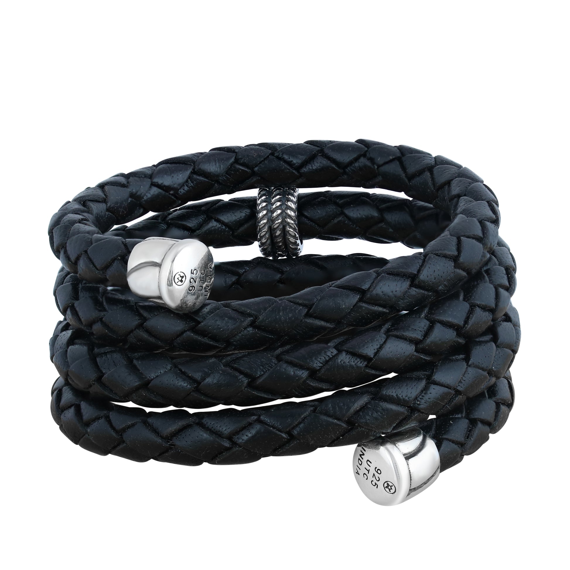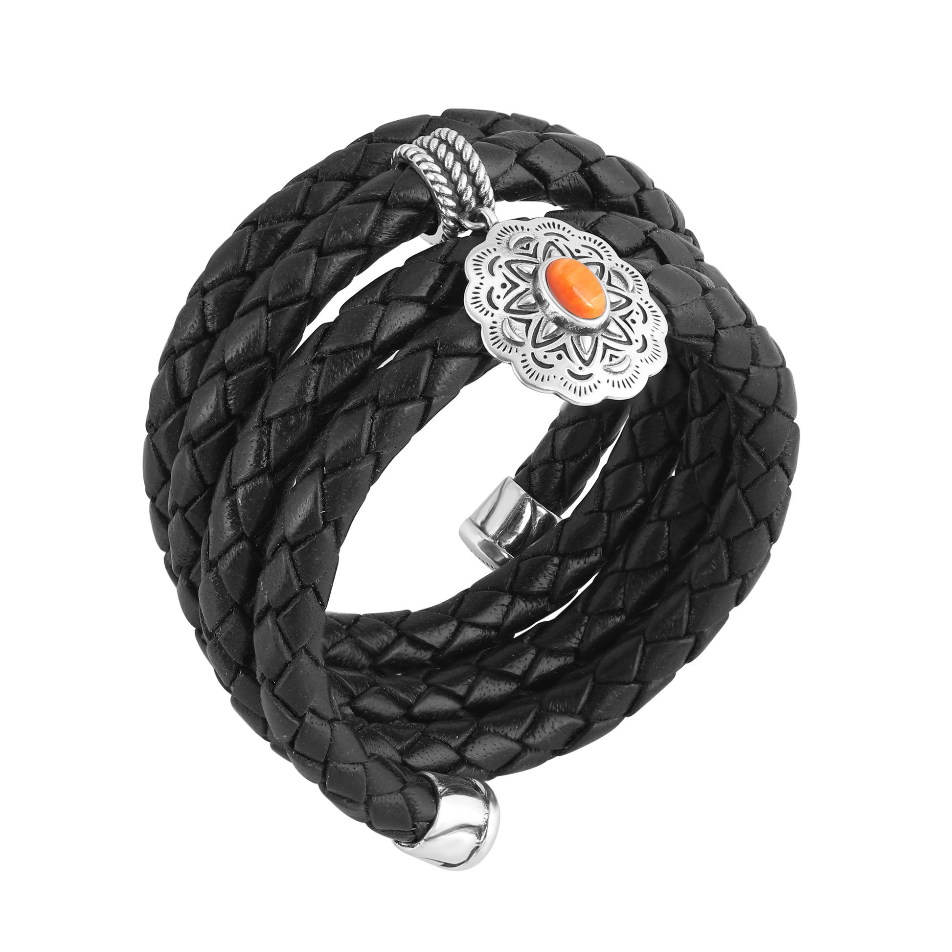 Sterling Silver Orange Spiny Oyster Concha Braided Leather Wrap Bracelet, One Size Fits Most