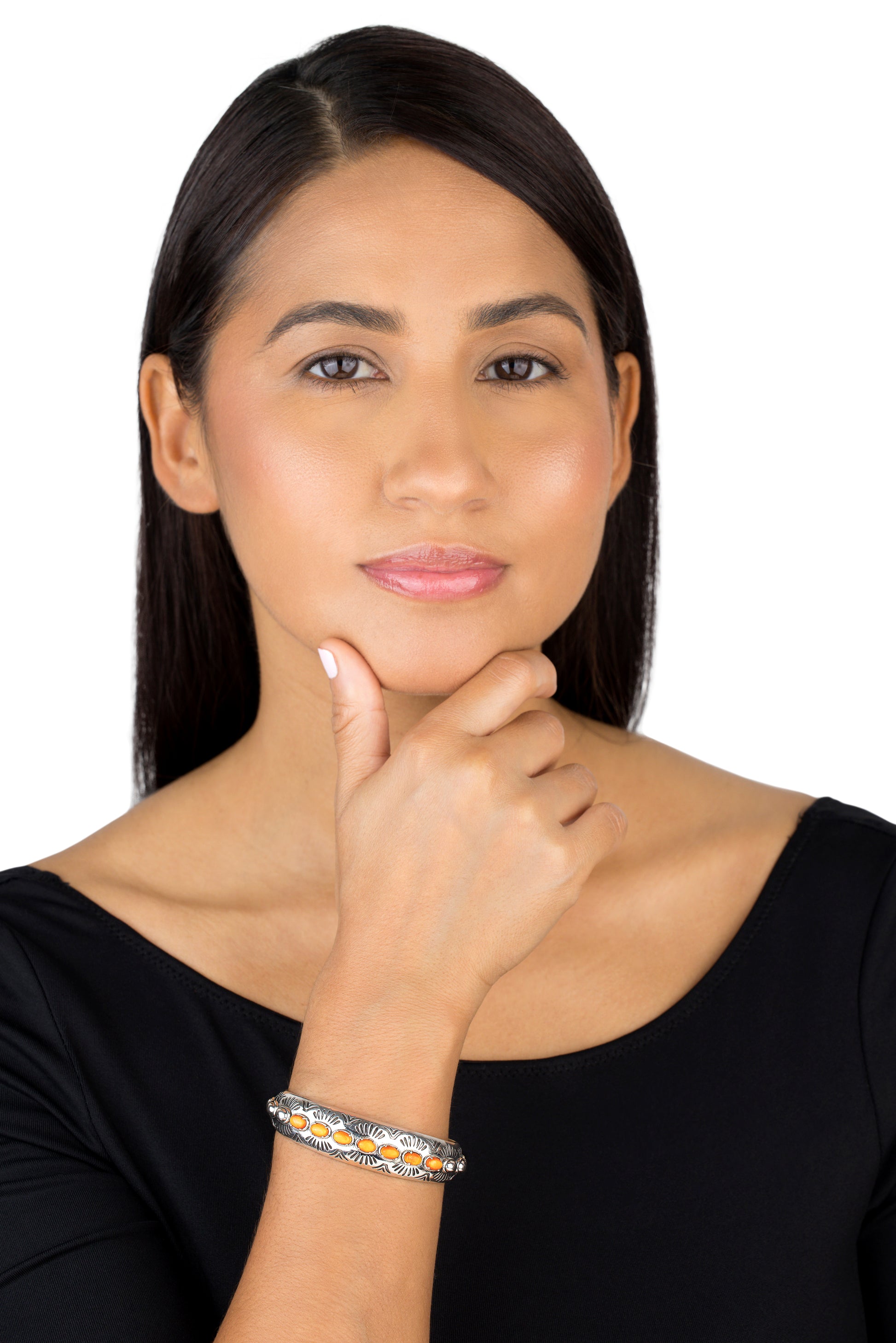 Create a confident style statement with this stunning Sterling Silver cuff, featuring 7 oval, prong-set Orange Spiny Oyster gemstone cabochons at the center and polished oval beads at the ends - it's the perfect blend of elegance and tradition. The etched Sterling Silver cuff also has textured fan designs to add Southwestern flair to every wave of your hand! Wear it solo or in a stack for maximum impact. Orange Spiny Oyster is one of the most popular stones of the Southwest, used in Southwestern jewelry since prehistoric times, as a base for intricate Inlay. Shells symbolize the life that flourished in the mystical oceans, far away from the desert Southwest. Spiny Oyster Shell originates from the Pacific Ocean. Every gemstone in the world is naturally unique, just like you! We carefully select the GIA certified gems for each piece, making your cuff one-of-a-kind. You will find it will elevate any outfit! Whether at work, a date night with your honey or a special party or event– American West Jewelry will get you noticed. Get ready for compliments!