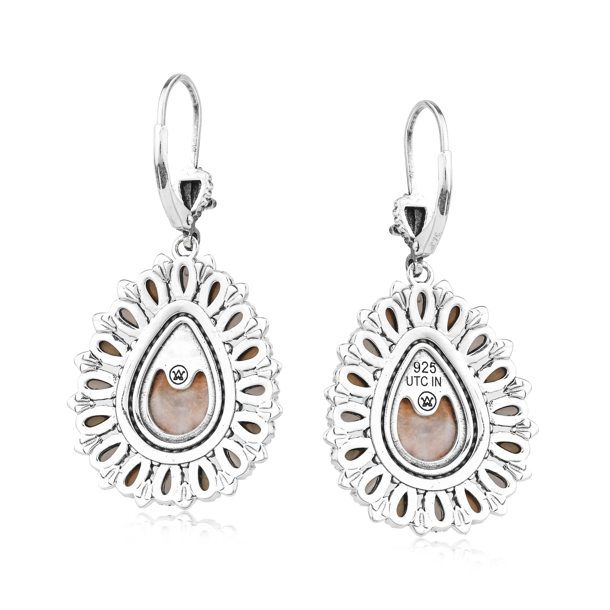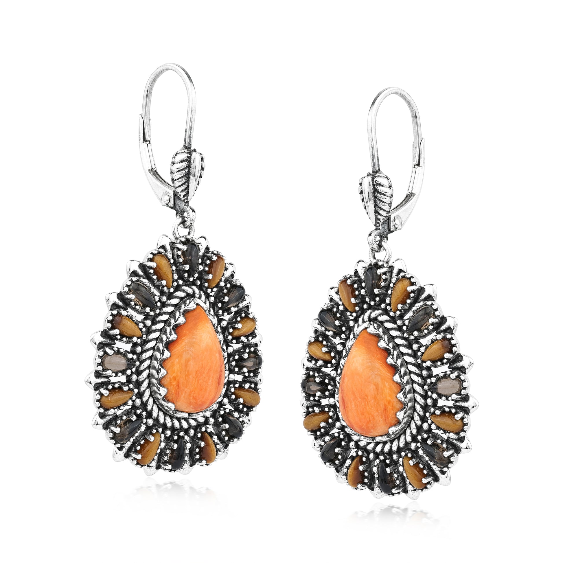 These Sterling Silver beauties bring the colors of the Southwest to life. At the center, a bold pear-shaped Orange Spiny Oyster cabochon in a serrated bezel anchors the design, surrounded by a total of 16 pear-cut Tiger's eye and Smoky Quartz gemstones, each stone alternating in color and prong-set, adding a warm neutral tone to the outer band of each earring. Rope-textured silver and scalloped details frame the cabochons in true Southwestern style. At 1.8 inches long, they make just the right statement without being too heavy. The secure lever-back closures with leaf detailing keep them comfy and easy to wear, whether you’re out on the town or soaking up a desert sunset. Every gemstone in the world is naturally unique, just like you! We carefully select every GIA certified gem, making your earrings one-of-a-kind. Whether at work, a date night with your honey or a special party or event– American West Jewelry will get you noticed. Get ready for compliments!