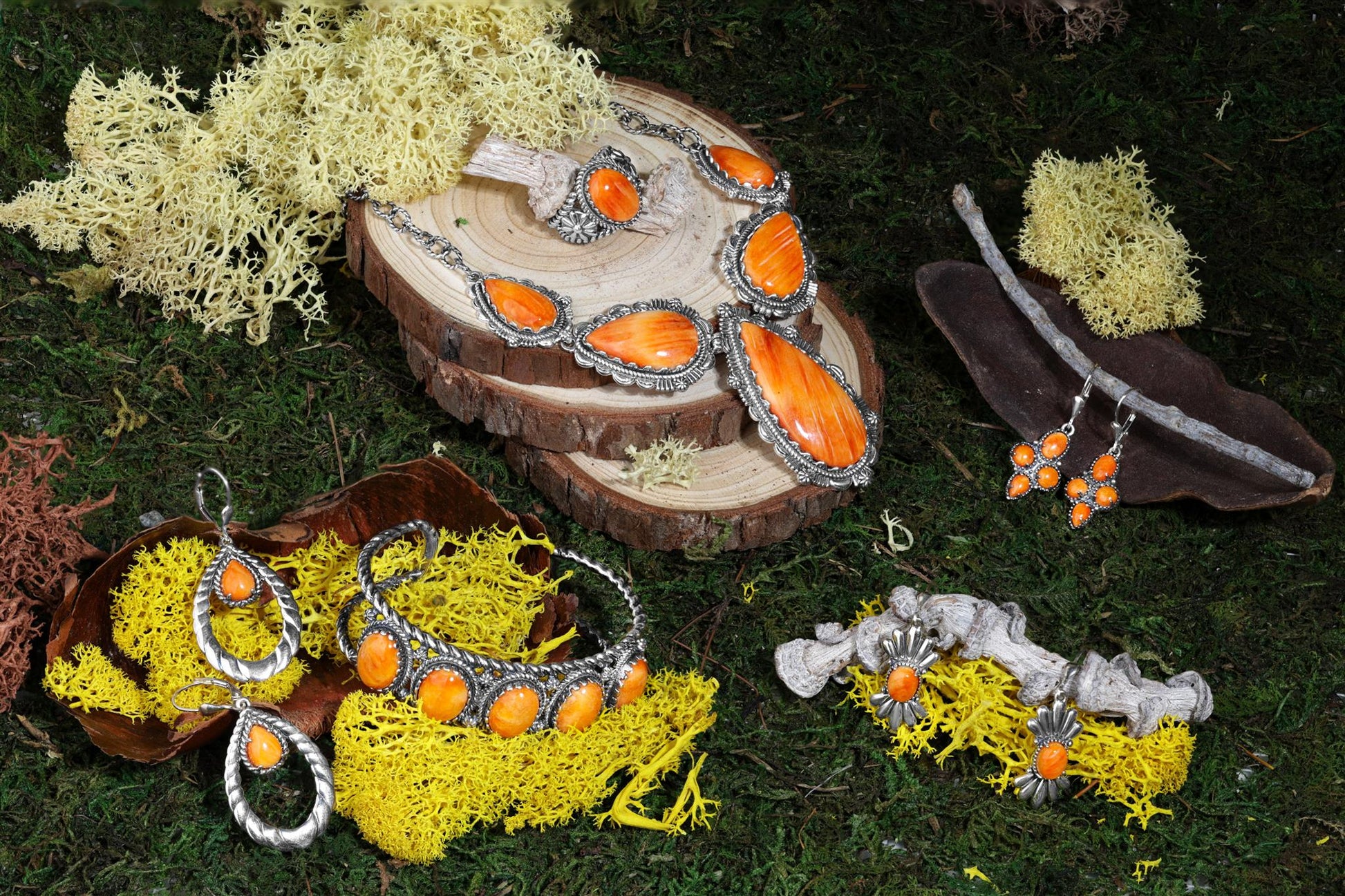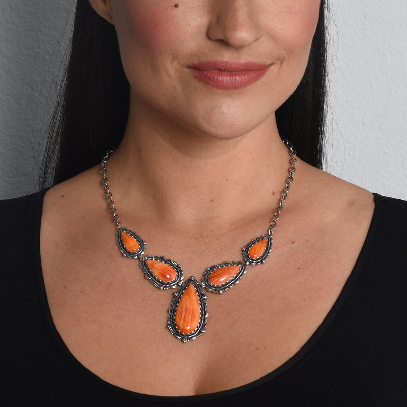 • Naturally colorful Southwestern Sterling Silver statement necklace with (2) 10x20mm, (2) 14x25mm and (1) 18x40mm pear-shaped Orange Spiny Oyster gemstones; scalloped bezel-setting; rope border, concha flower motifs; sun ray designs