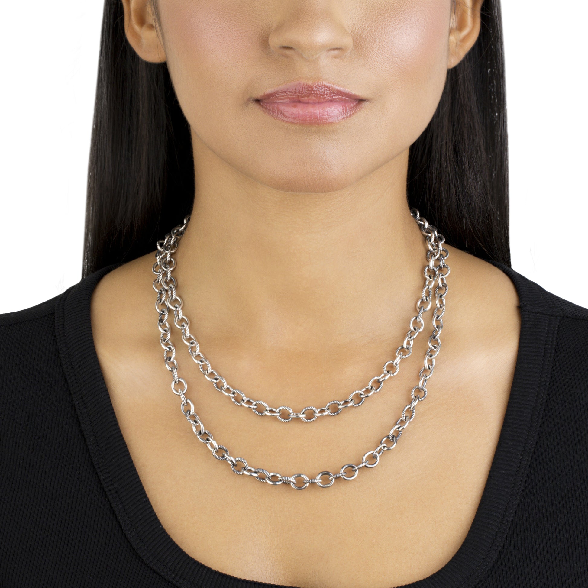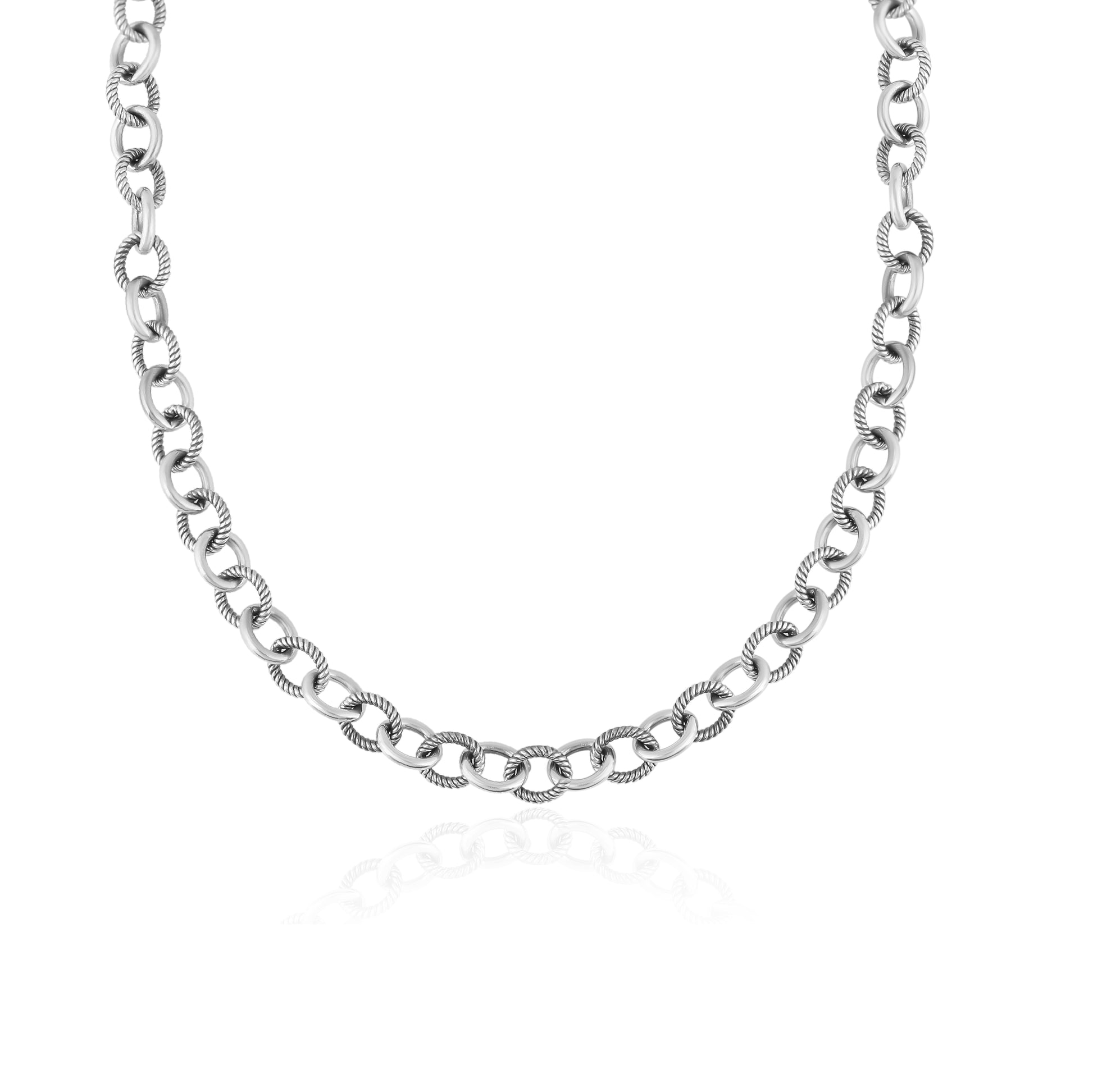 • 17 or 20 inch textured oval link chain with oxidized, polished finish; 6.35 mm rope textured links alternate with smooth, polished links