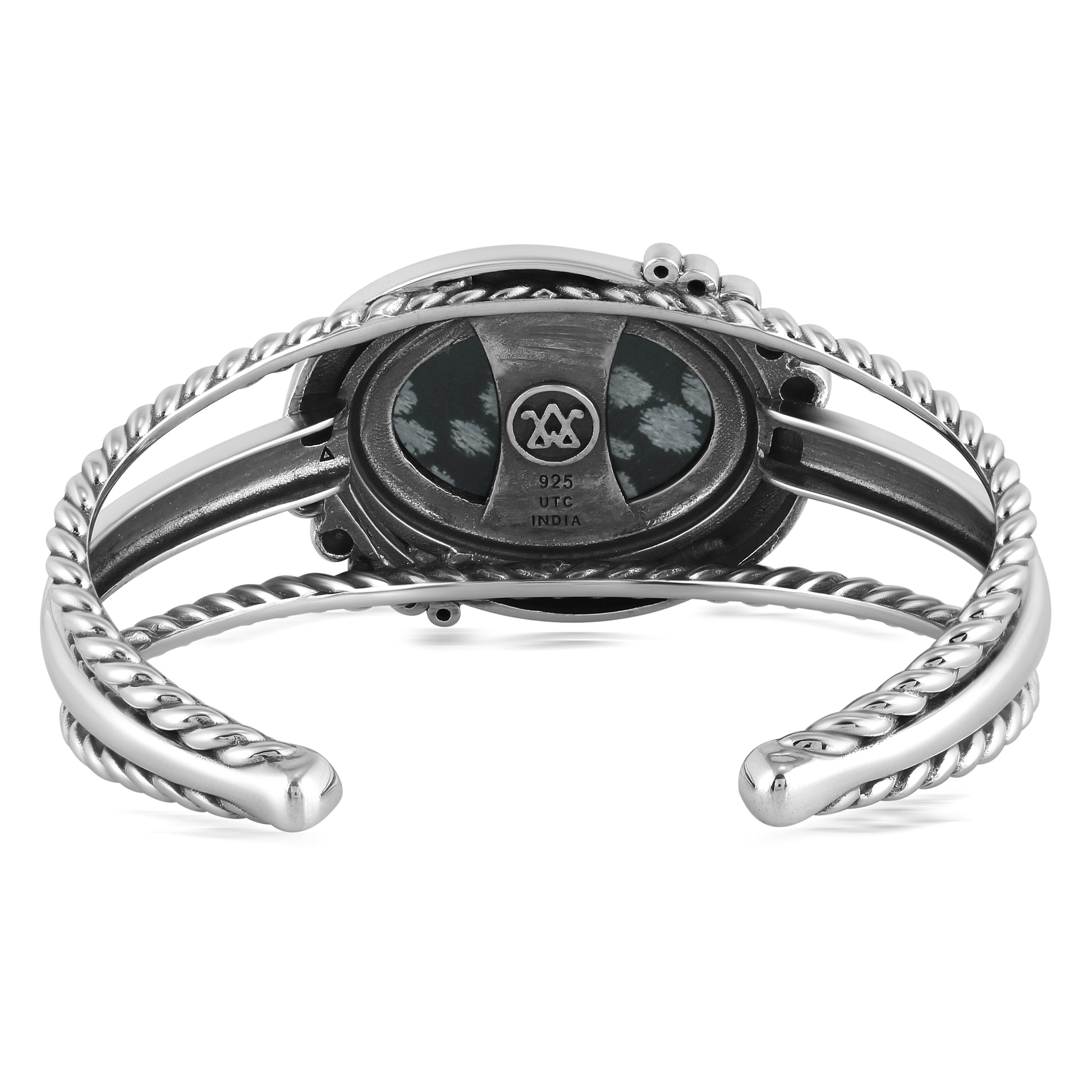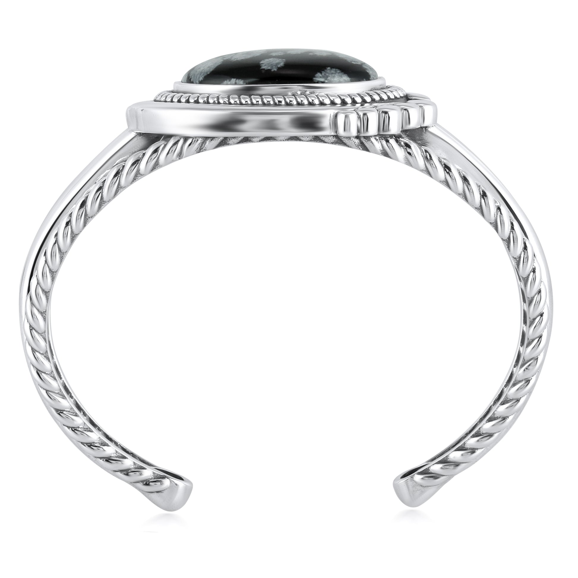 - Sterling Silver cuff features center 25x18 mm oval Snowflake Obsidian in bezel setting; 3 rows and rope texture