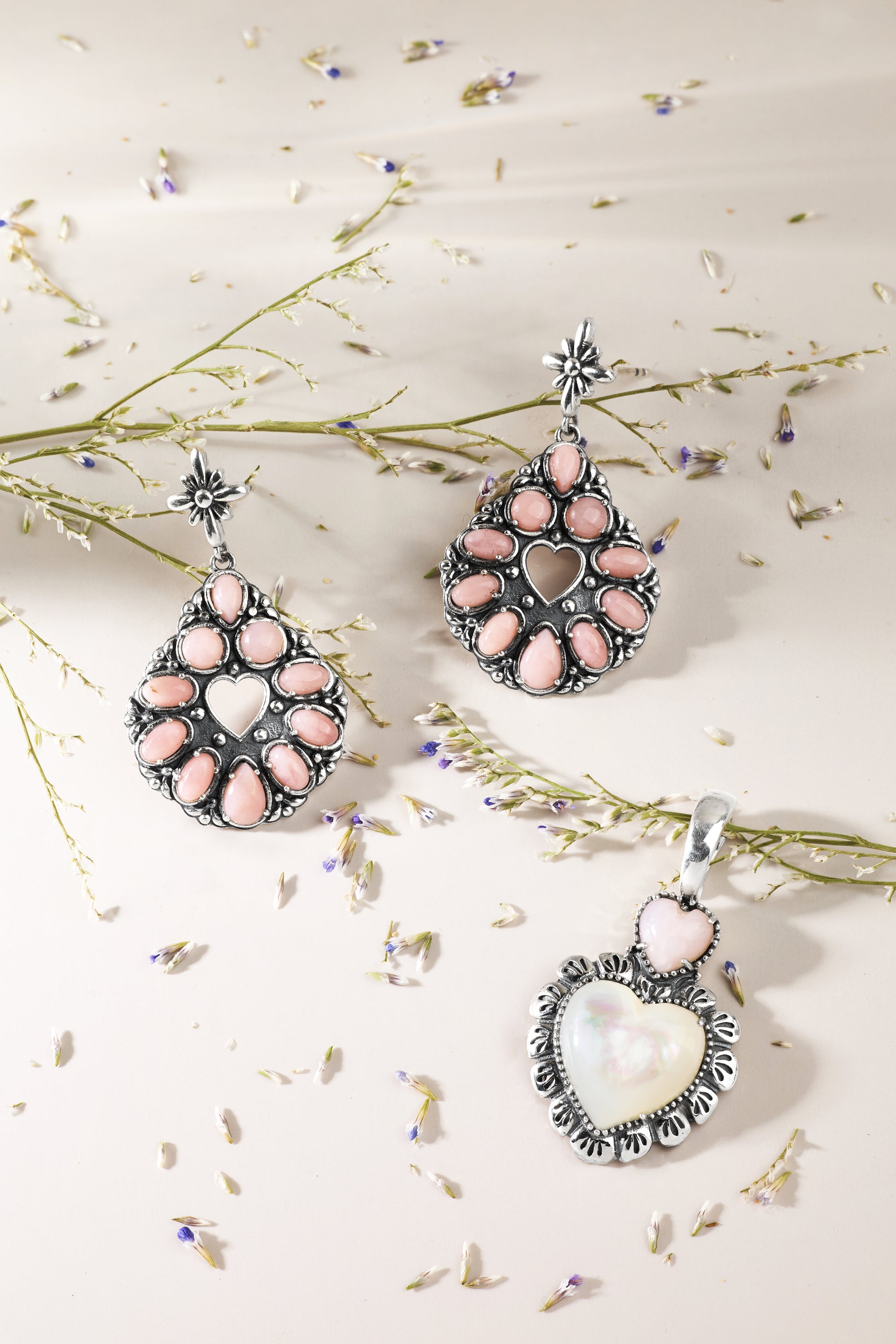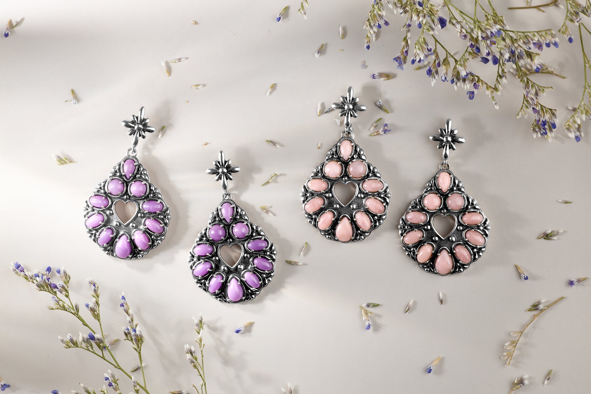 That little black dress that suits every occasion depending on how you accessorize? Make it a standout style with these dangle earrings, aglow in stunning Pink Opal cabochons, creating a captivating look. The American West Jewelry Heart Center Teardrop Earrings feature a beautiful teardrop design with prong-set pear, oval and round-shaped Pink Opal cabochons set in genuine Sterling Silver with an oxidized, polished finish. The Sterling Silver posts feature a detailed sunburst design, while the open center creates a heart-shaped cutout, making these earrings the perfect way to show your love! They are secured with post and clutch closures and are for pierced ears only. Pink Opal is closely linked to the heart chakra, which governs love, compassion, and emotional well-being. Pink Opal promotes emotional balance, helping individuals open their hearts to love, both for themselves and others.