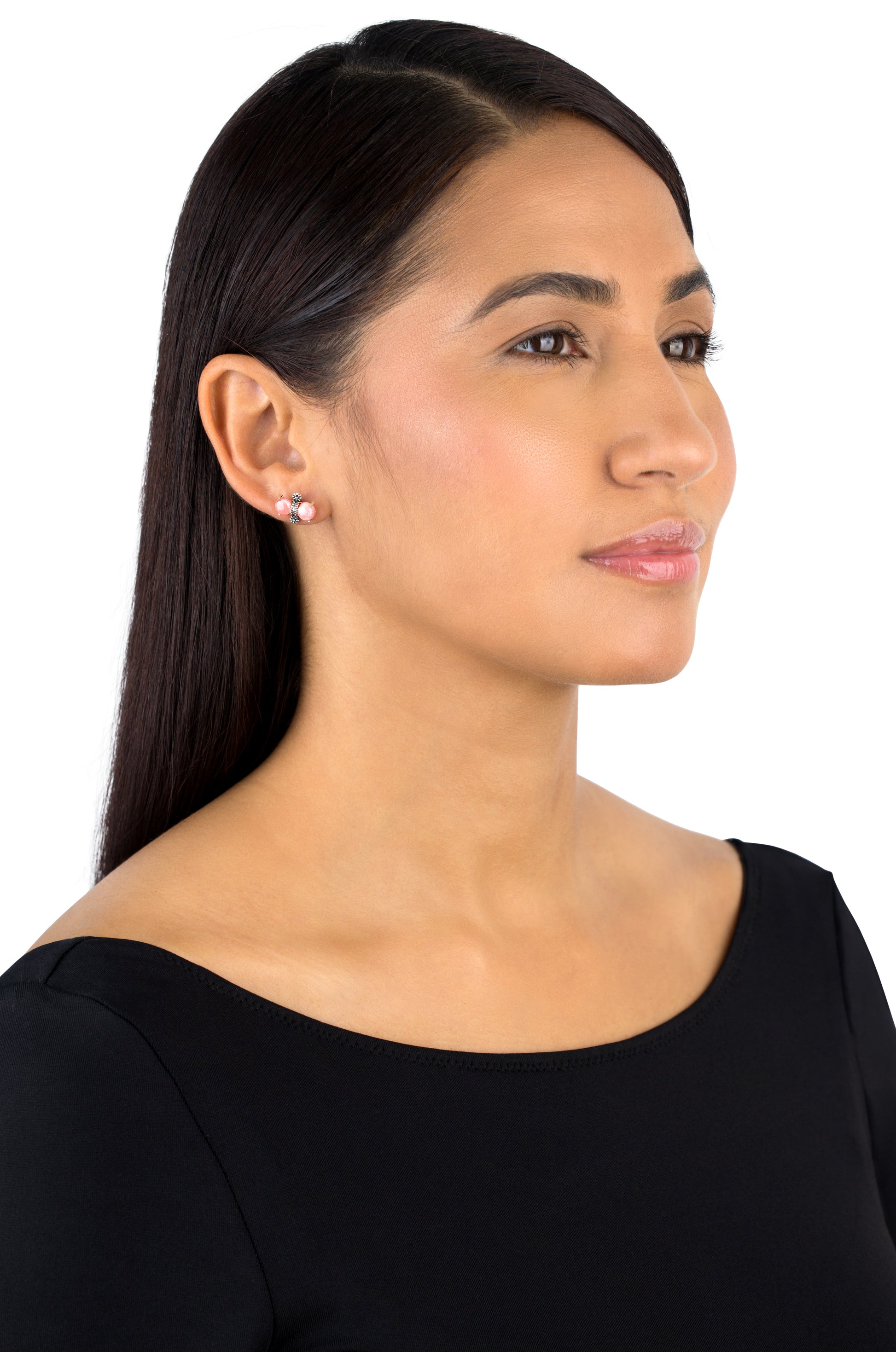 • Each earring features 2 round, prong-set 6mm Rhodochrosite cabochons with rope details and concha flower Sterling Silver accents