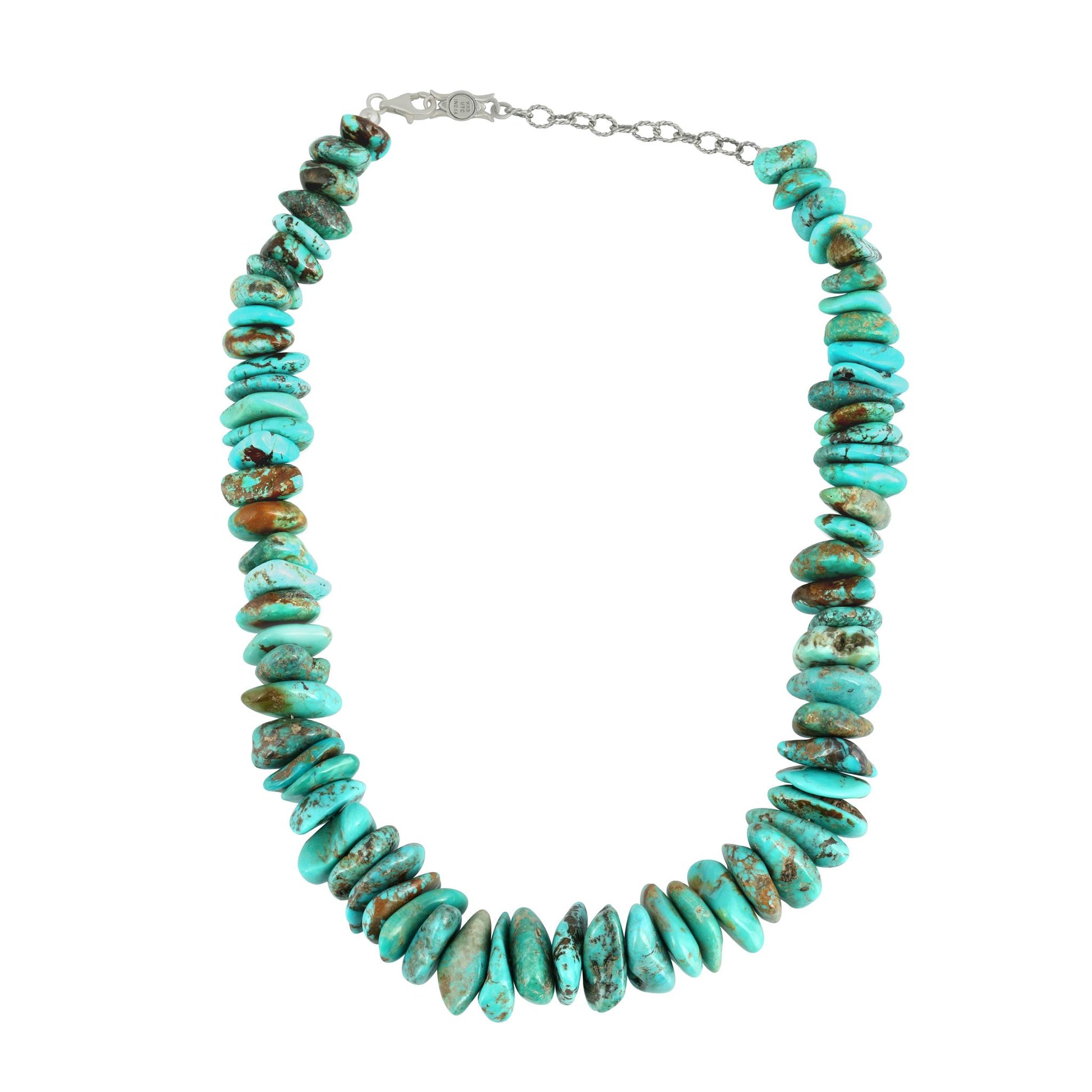Whether you're forever in Turquoise or want to get in on the hot jewelry trend, this big, bold necklace of graduated Turquoise beads in varying shades is here for it. (The brown matrix gives such a rich look.) Pair this piece with your favorite white button-front, blue jeans and a blouse, or a simple sheath and prepare for a total wow moment. Turquoise is known to bring luck to its wearer and have healing properties, making it an invaluable accessory for those looking to live a healthy and happy life. We carefully select the GIA certified gems, making your necklace one-of-a-kind. You will find that this strand will elevate any outfit! Whether at work, a date night with your honey or a special party or event– American West Jewelry will get you noticed. Get ready for compliments!