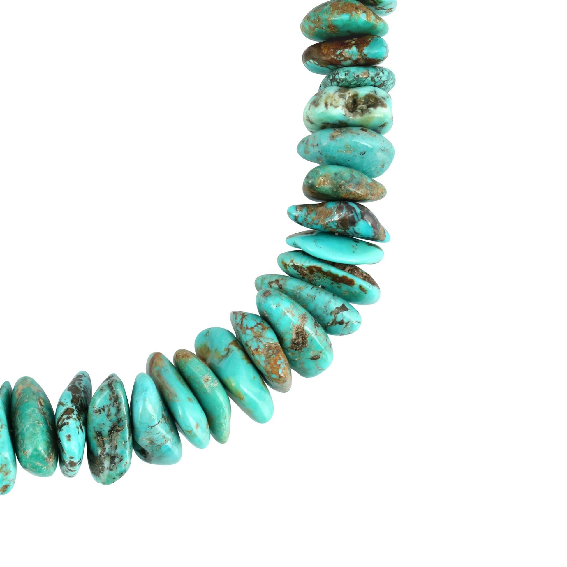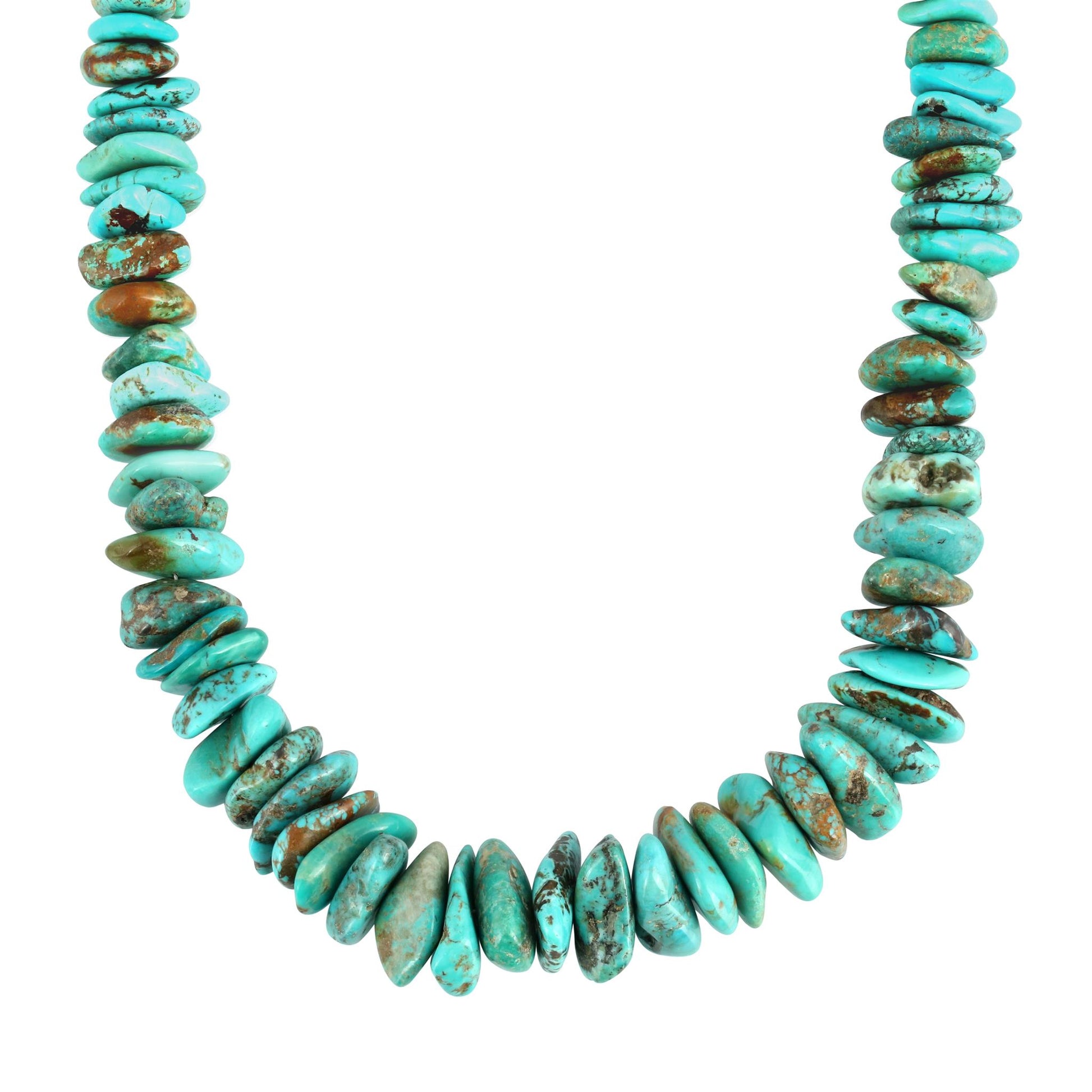 • Graduated design of Turquoise beads in shades of blue, blue-green, and green with brown matrix; oxidized finish