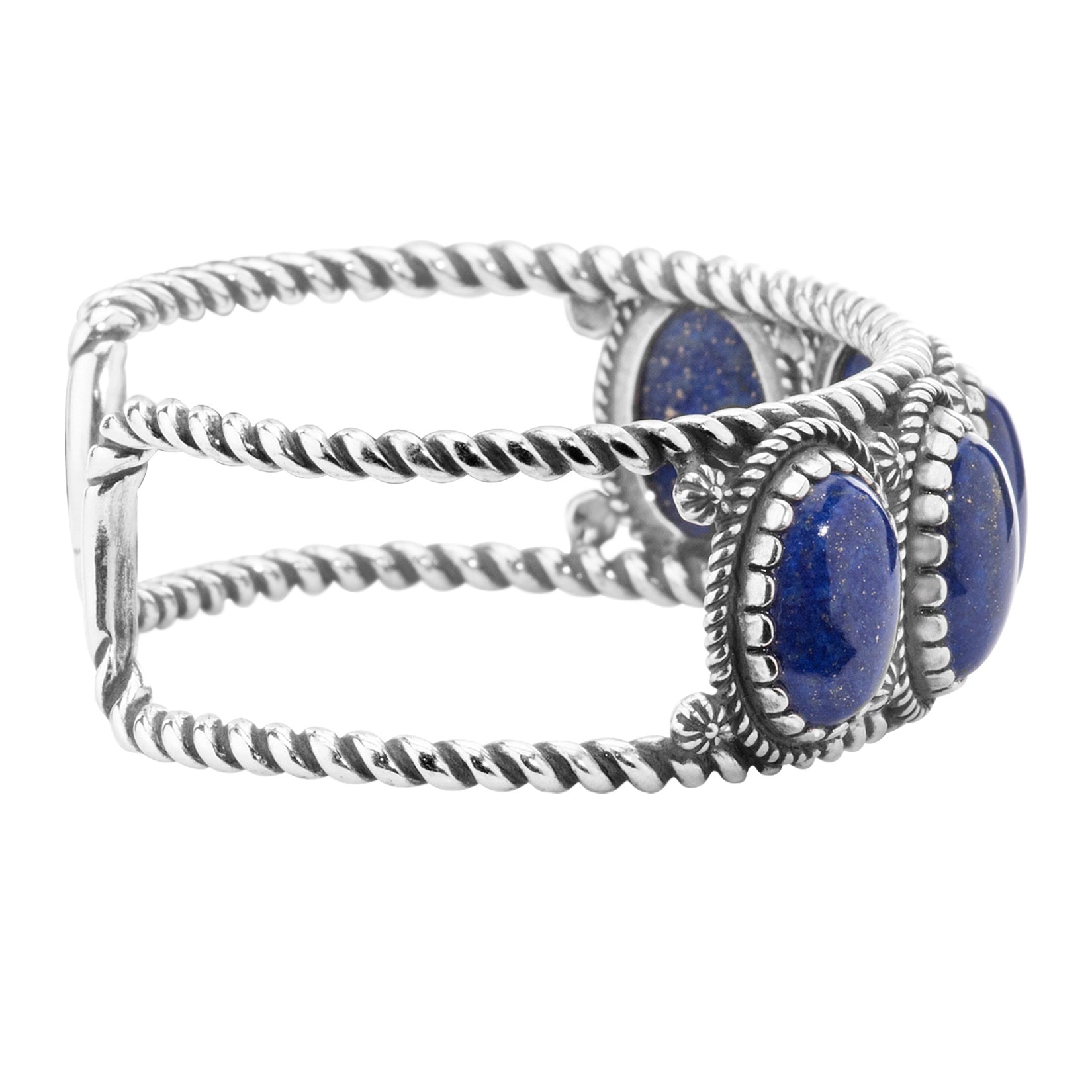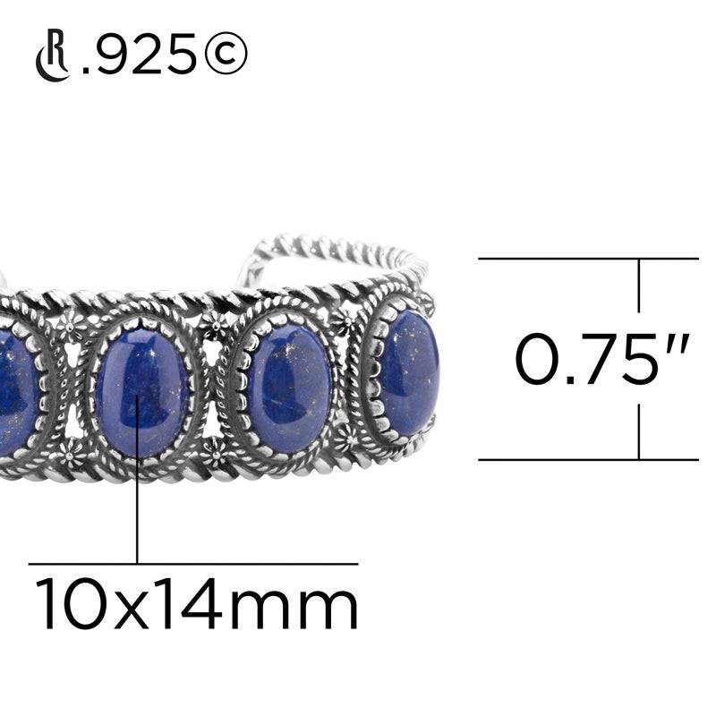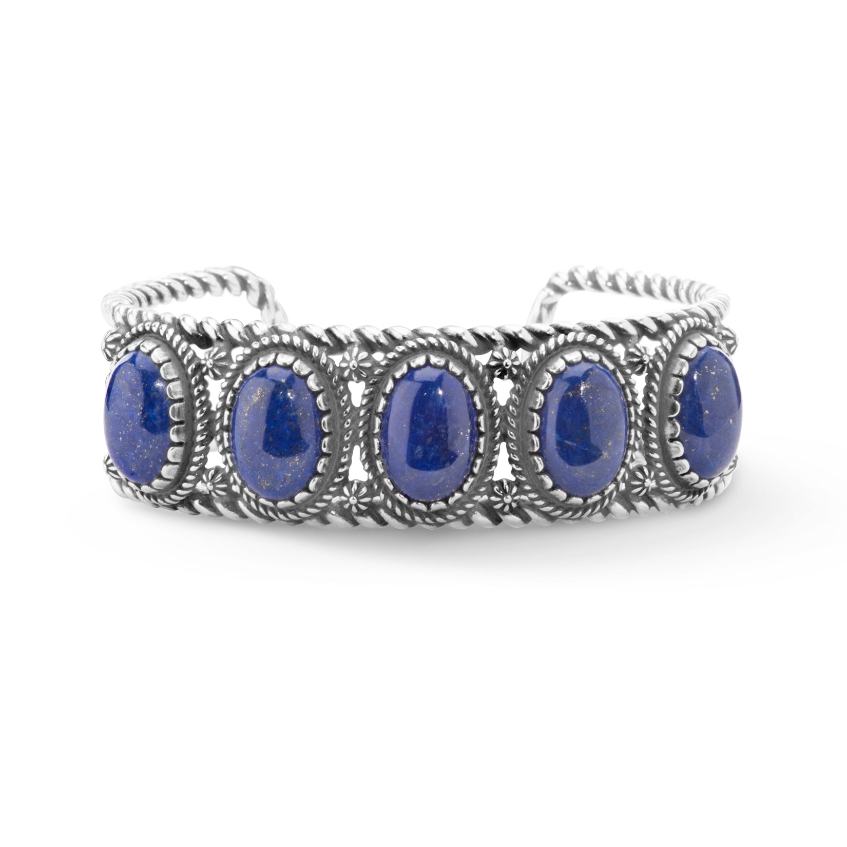Add a splash of vibrant color to any look with this versatile, Southwest-inspired bracelet of nickel-free .925 Sterling Silver. This cuff bracelet is proudly designed for the beauty and rich history of the western region in Sterling Silver and five oval-shaped Lapis Lazuli cabochons. It features notched bezel, a rope border, and flower-design accents and an oxidized, polished finish. This piece brilliantly captures the wonder and flair of the Land of Enchantment. Ideal for any ensemble, make this exclusive bracelet part of your collection today.