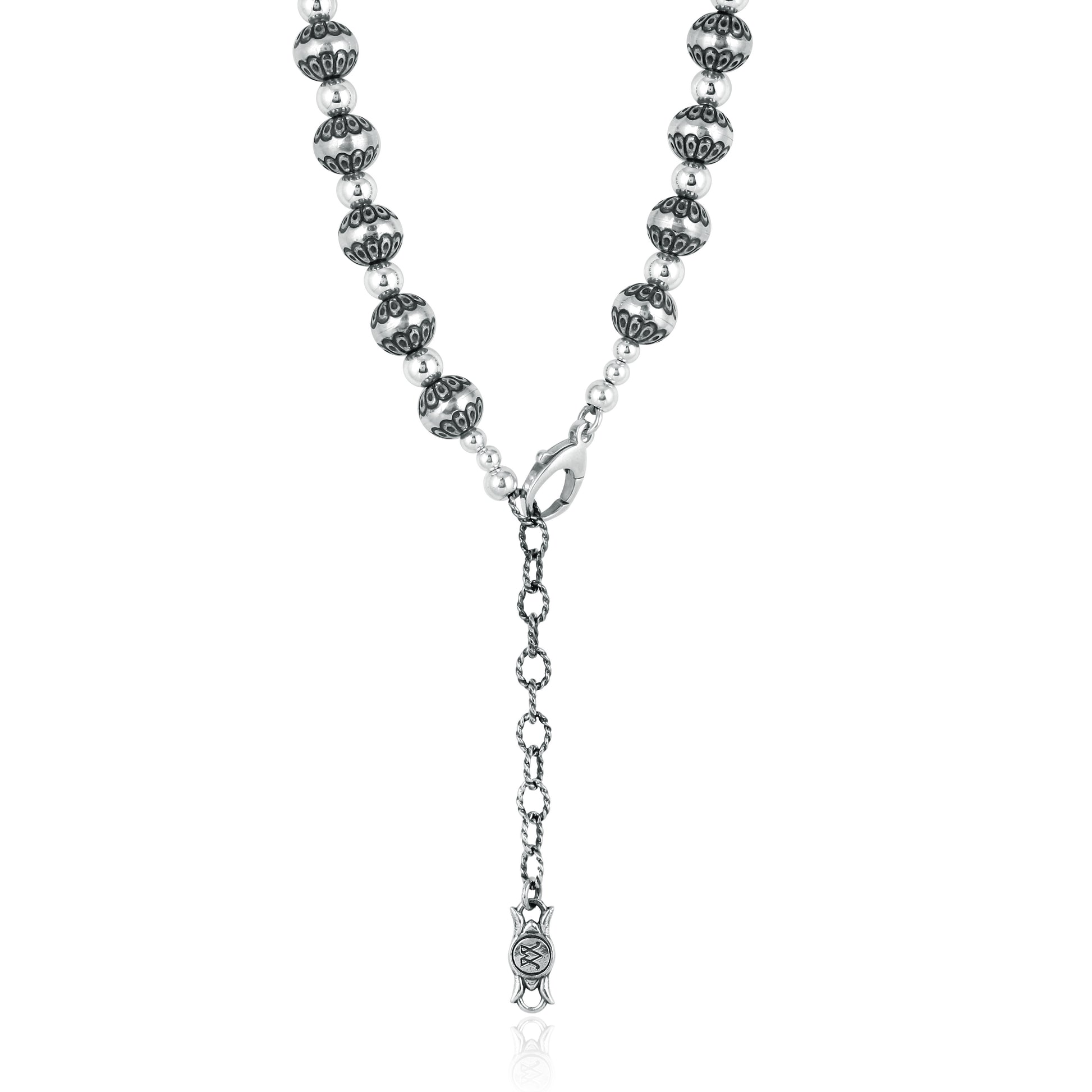 A piece that everyone will want to know more about, this statement-making American West Jewelry Sterling Silver necklace displays a mix of rich textures and native pearl-stamped beads. Add the shine of silver to any look with this versatile necklace made from real, nickel-free .925 Sterling Silver. Stamped native pearl beads with detailed concha engravings alternate with smaller polished beads. The "native pearl" is a signature element of Southwestern fashion. This substantial necklace features an oxidized finish with polished accents. It is 21 inches long, with a 3 inch textured extender with an American West charm and a lobster-claw clasp. This necklace is gorgeous alone as a strand of "silver pearls", or add a Pendant Enhancer and create a unique statement necklace. You will find this necklace will elevate any outfit! Whether at work, a date night with your honey or a special party or event– American West Jewelry will get you noticed. Get ready for compliments!