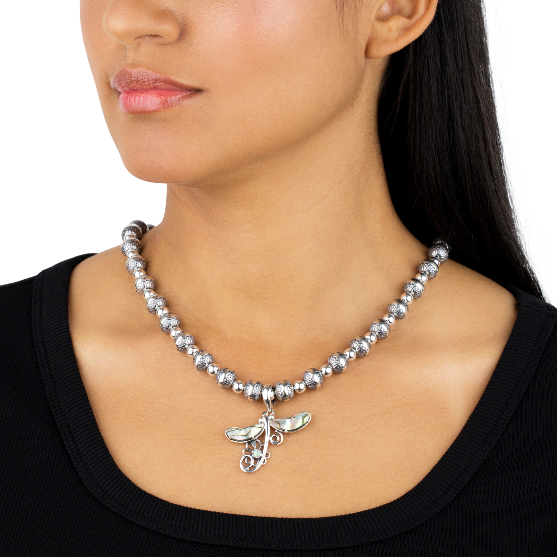 • Sterling Silver necklace featuring 10mm native pearl beads with detailed concha engravings separated by smaller polished silver beads