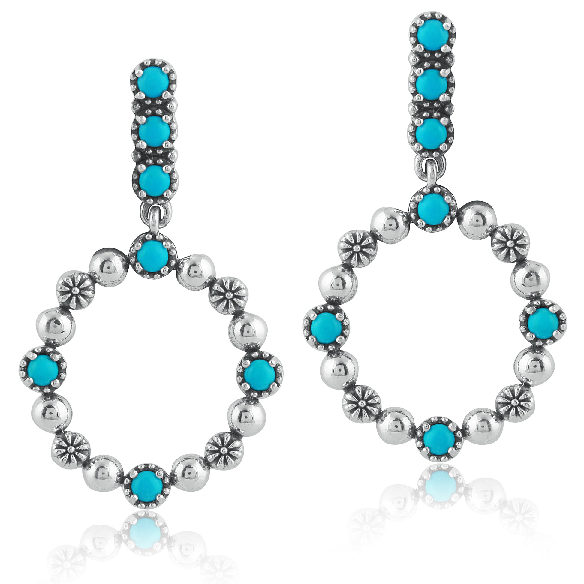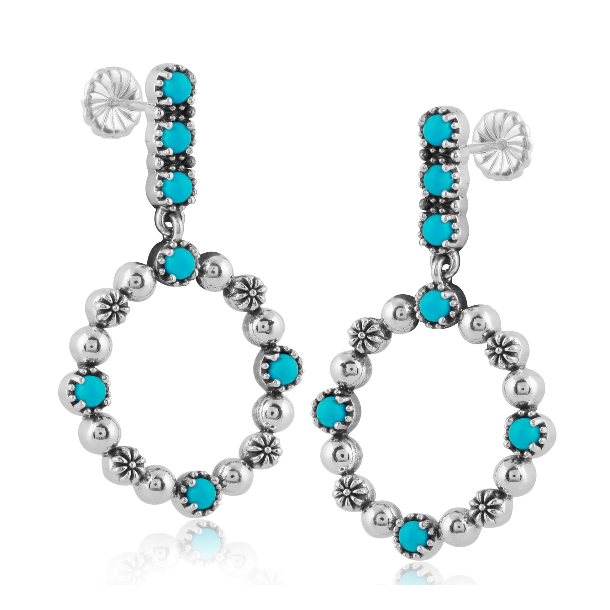 • Prong-set, round Sleeping Beauty Turquoise cabochons with Sterling Silver concha designs in an open circle; circle hangs from three prong-set cabochons