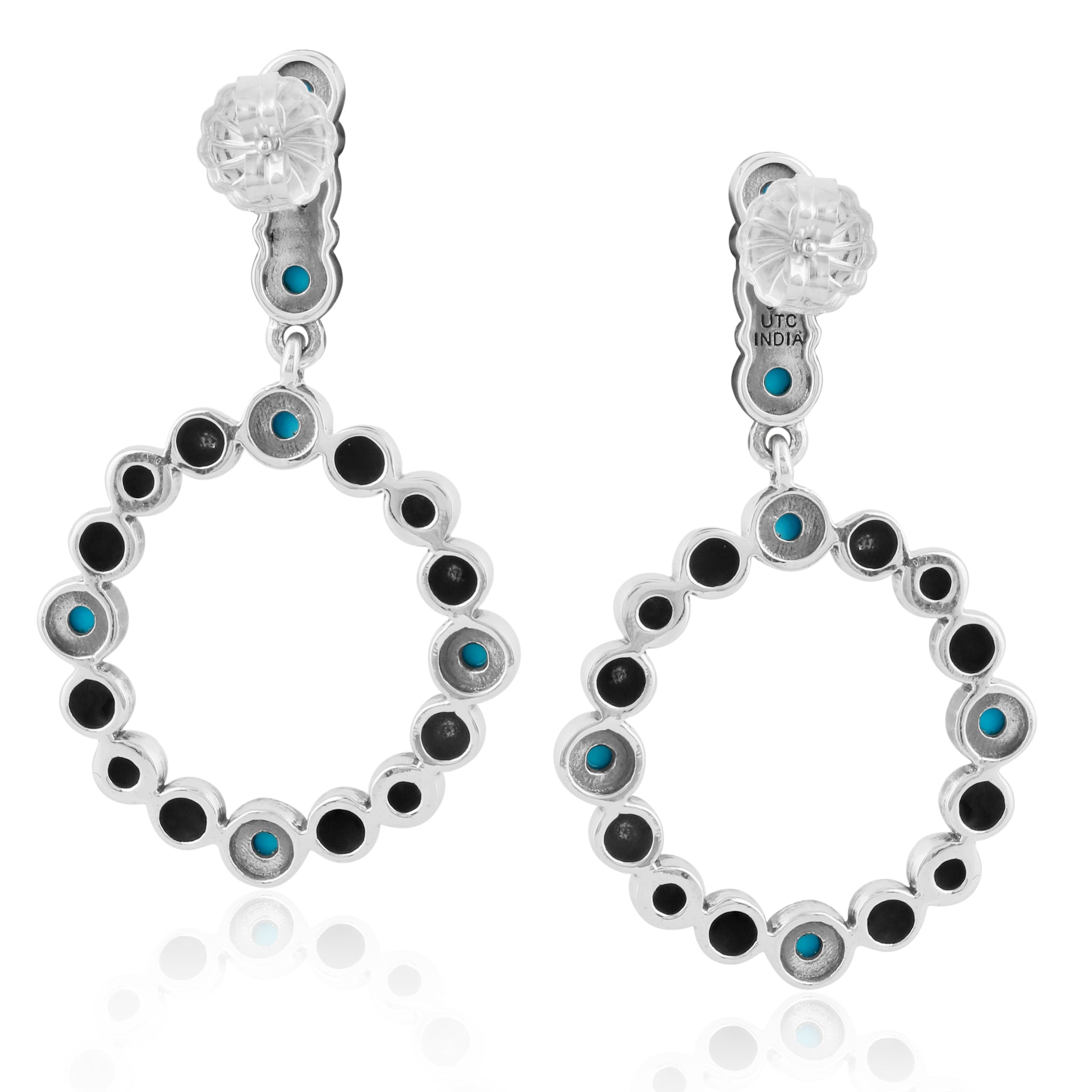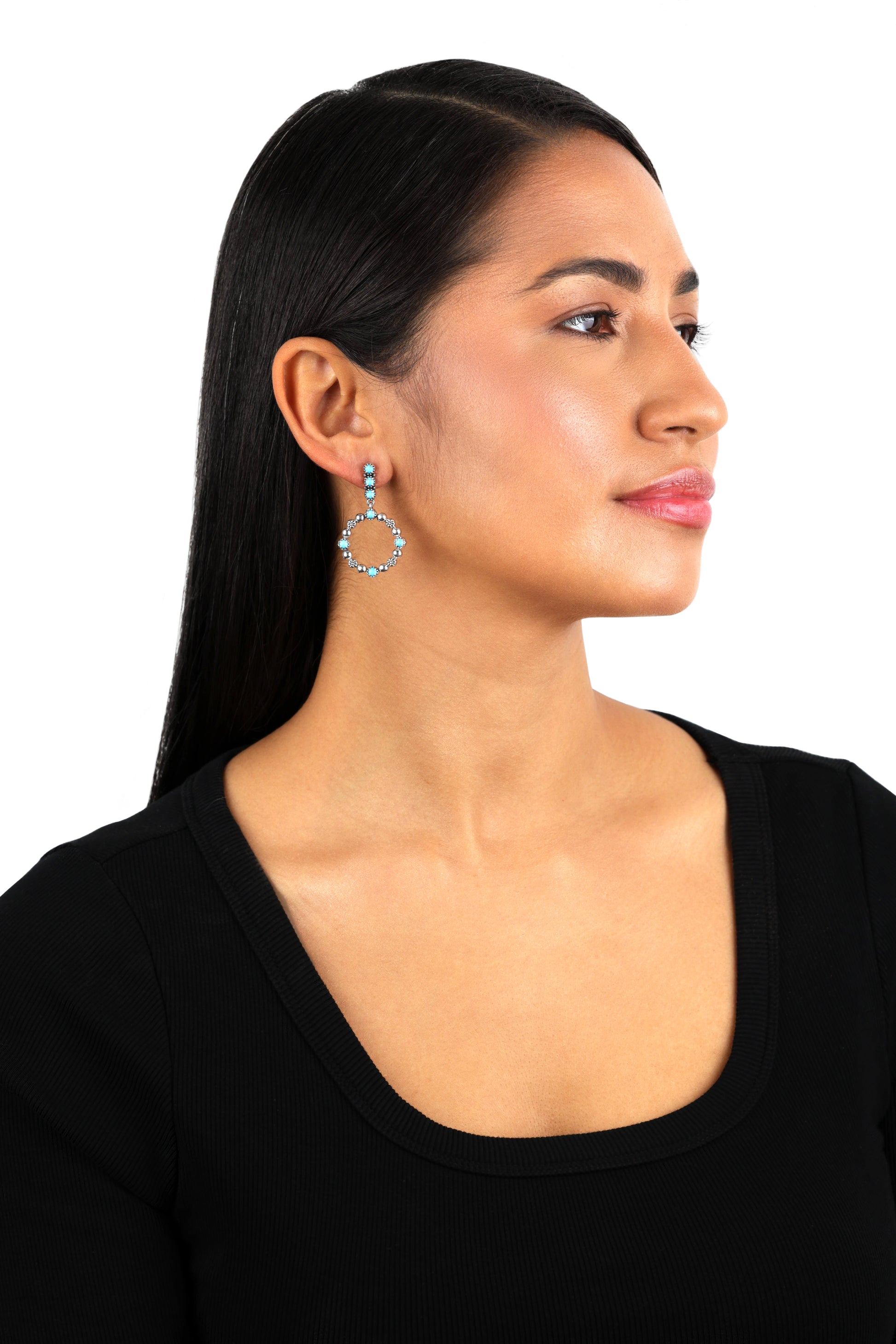 Take your little black dress out of the closet. It is the perfect background for showing off these chic earrings which combine delicate Sterling Silver details with the bold color of Sleeping Beauty Turquoise. These stunning front-facing "door knocker" style hoop earrings feature a total of 14 beautiful genuine Sleeping Beauty Turquoise cabochons. All stones are all prong-set, round cut and interspersed with Sterling Silver concha designs in an open circle. Each circle hangs from three cabochons and is secured with post and nut style closures. These beautiful open circles move when you move and are light on your ears. They are oxidized, polished and each earring measures approximately 1" wide x 1⁵⁄₈" long.