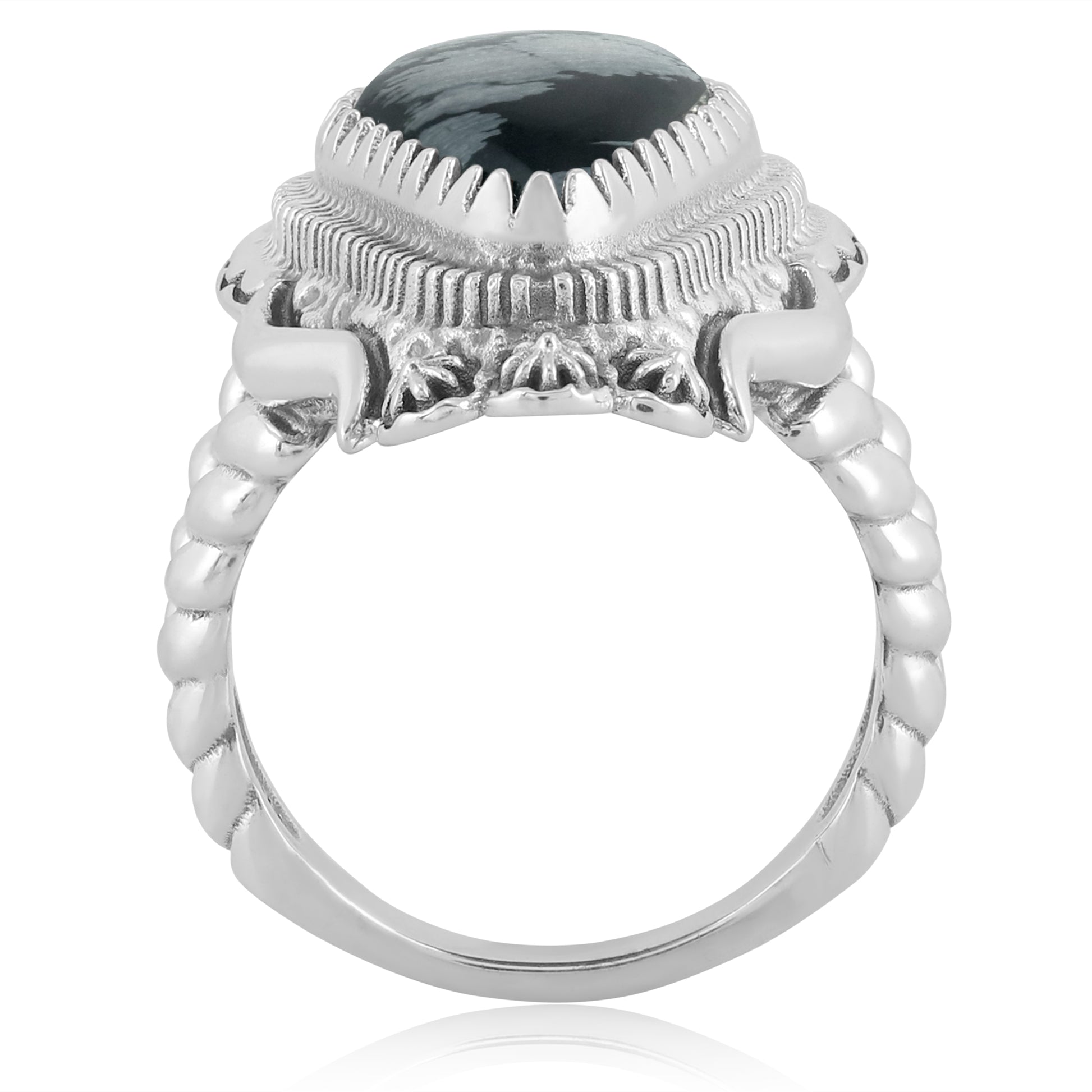• 13x19 mm pear cut Snowflake Obsidian cabochon in serrated setting; 3 oxidized Sterling Silver concha flowers at the bottom; split shank, braided rope design band