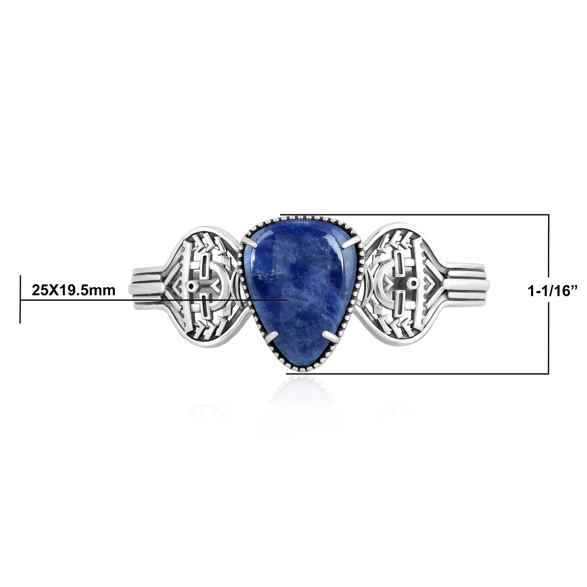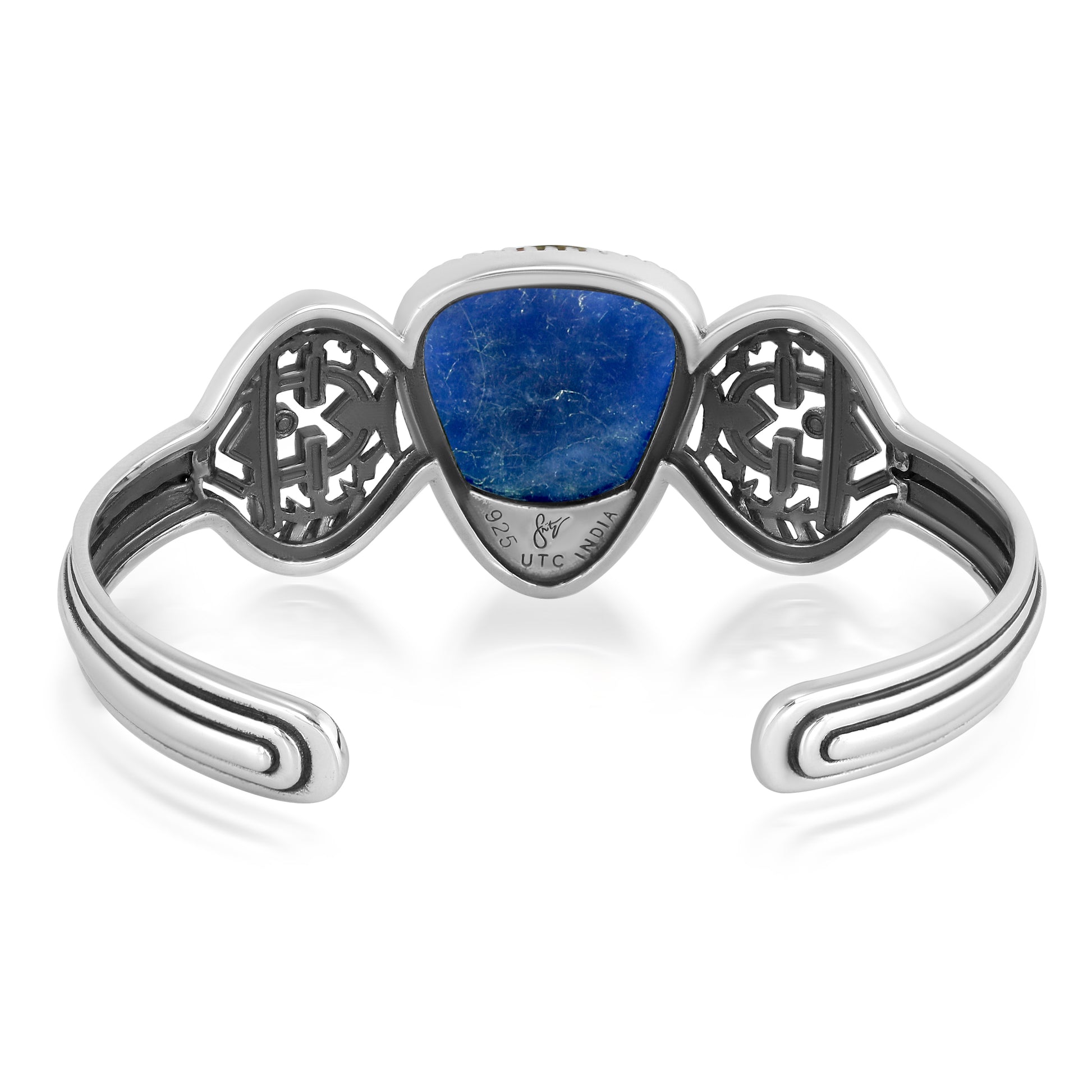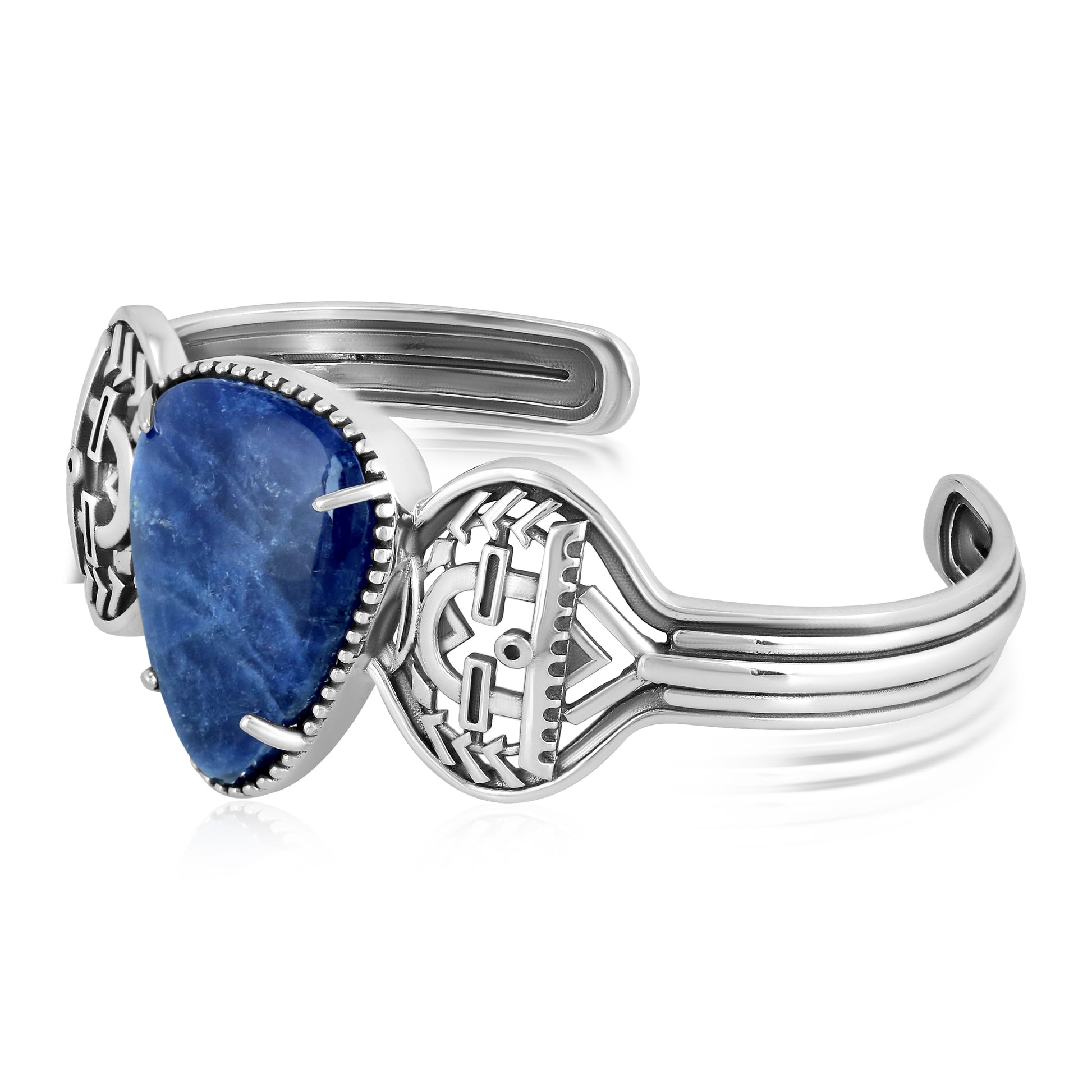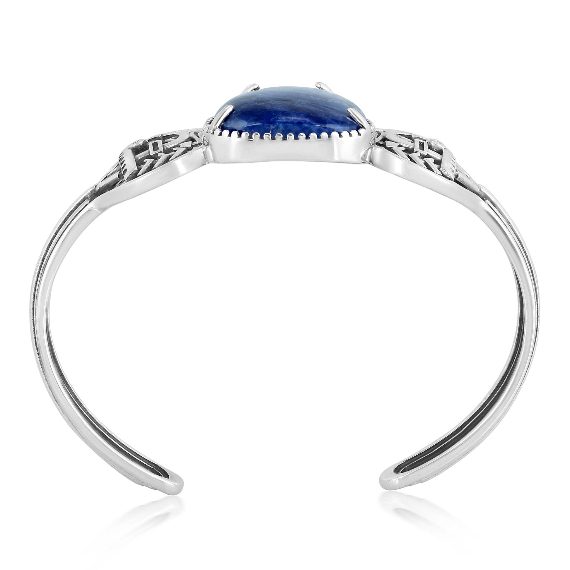 Embrace the Navajo culture and all its beauty with this Yeibichai gemstone cuff. The stunning piece showcases a rounded-triangular gemstone cabochon in the center that is enhanced with intricate Yeibichai designs on either side. Designed by Native artist and jeweler Fritz Casuse, this handcrafted cuff bracelet features a striking triangular cabochon of Sodalite at its center. The gemstone's deep blue color and natural white calcite inclusions are beautifully complemented by the intricate openwork of the oxidized Sterling Silver. The design features traditional Yeibichai geometric motifs on the side panels, which lead to a simple, polished cuff band. This powerful piece combines a modern silhouette with timeless Southwestern artistry.