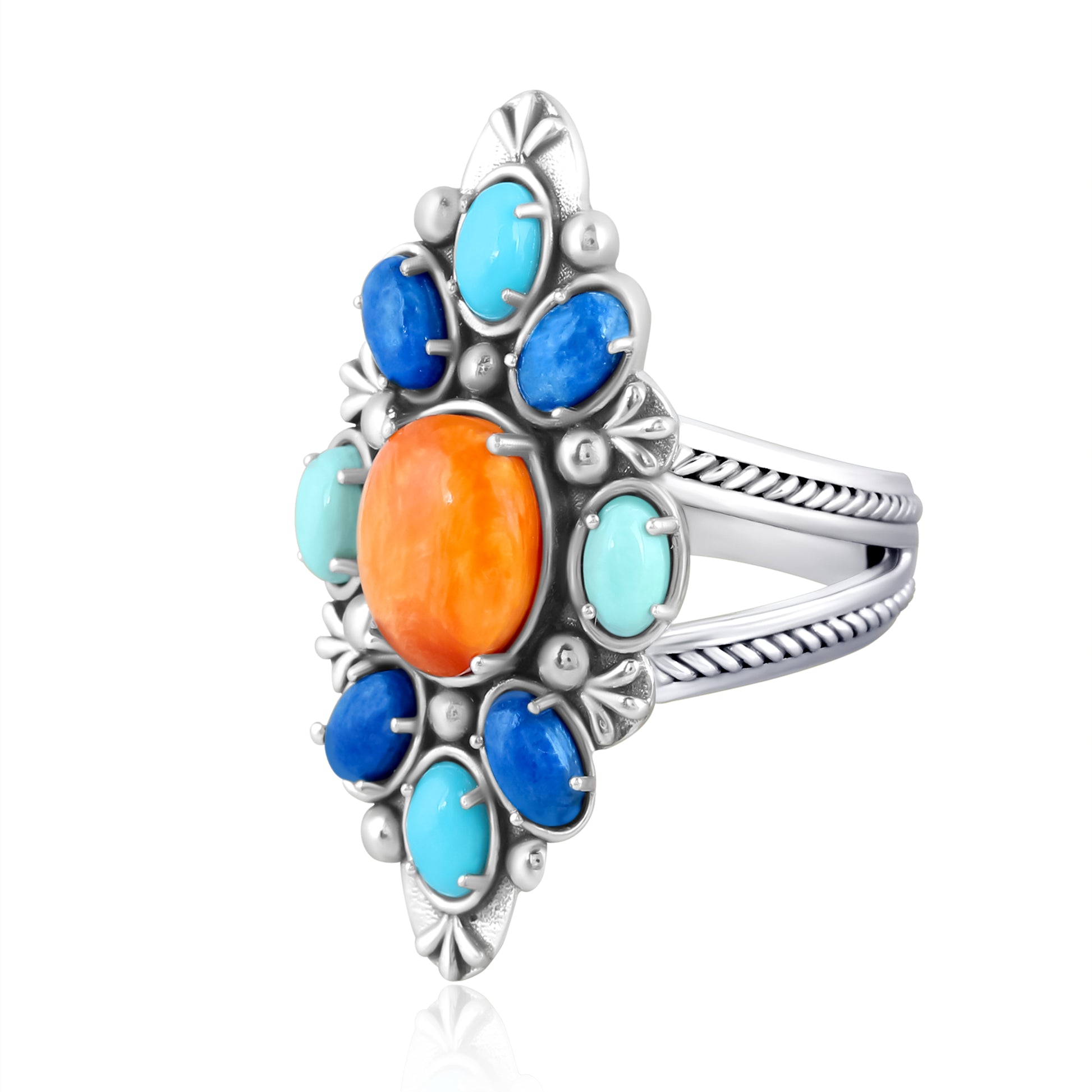 A celebration of the sunrise, this Sterling Silver cluster ring captivates with its colorful cabochons. Featuring a marquise-shaped design that dazzles with Sleeping Beauty Turquoise, Orange Spiny Oyster, Lapis, and Variscite oval gemstones, the radiant ring is sure to bring a burst of bright color to any outfit (we're looking at you, little black dress!). The polished Sterling Silver setting forms a beautiful frame around the prong-set central stones, with rope designed accents on the split shank and intricate leaf and bead details for added flair.