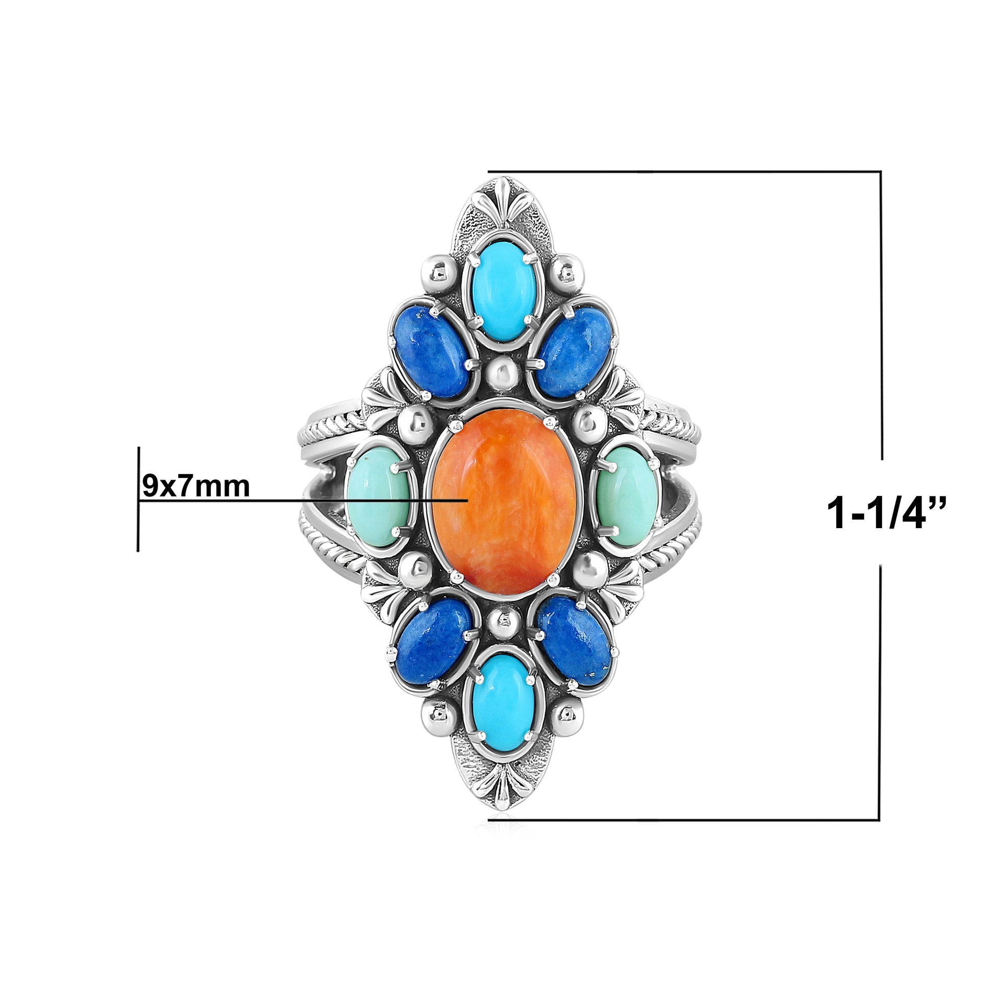 Sterling Silver Orange Spiny Oyster, Lapis, Sleeping Beauty Turquoise and Variscite Santa Fe Sunrise Cluster Ring, Sizes 7 and 8