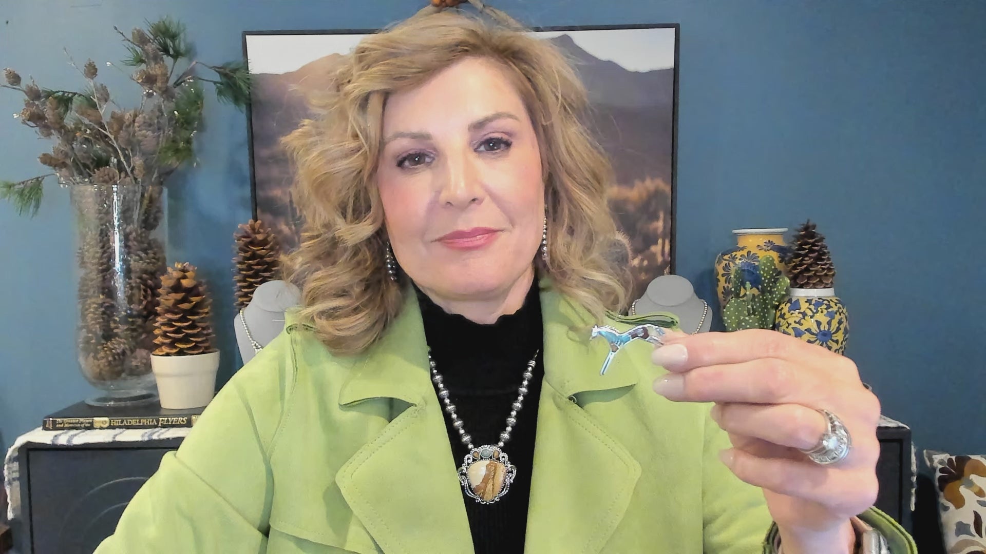 • Pin features Turquoise, Red and Yellow Jasper gemstone inlay a to create the body of the horse; with Sterling Silver detailing, spiral and sun accents