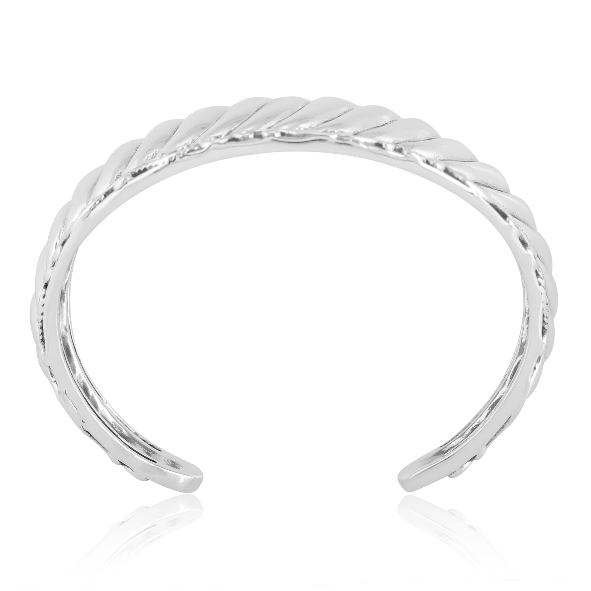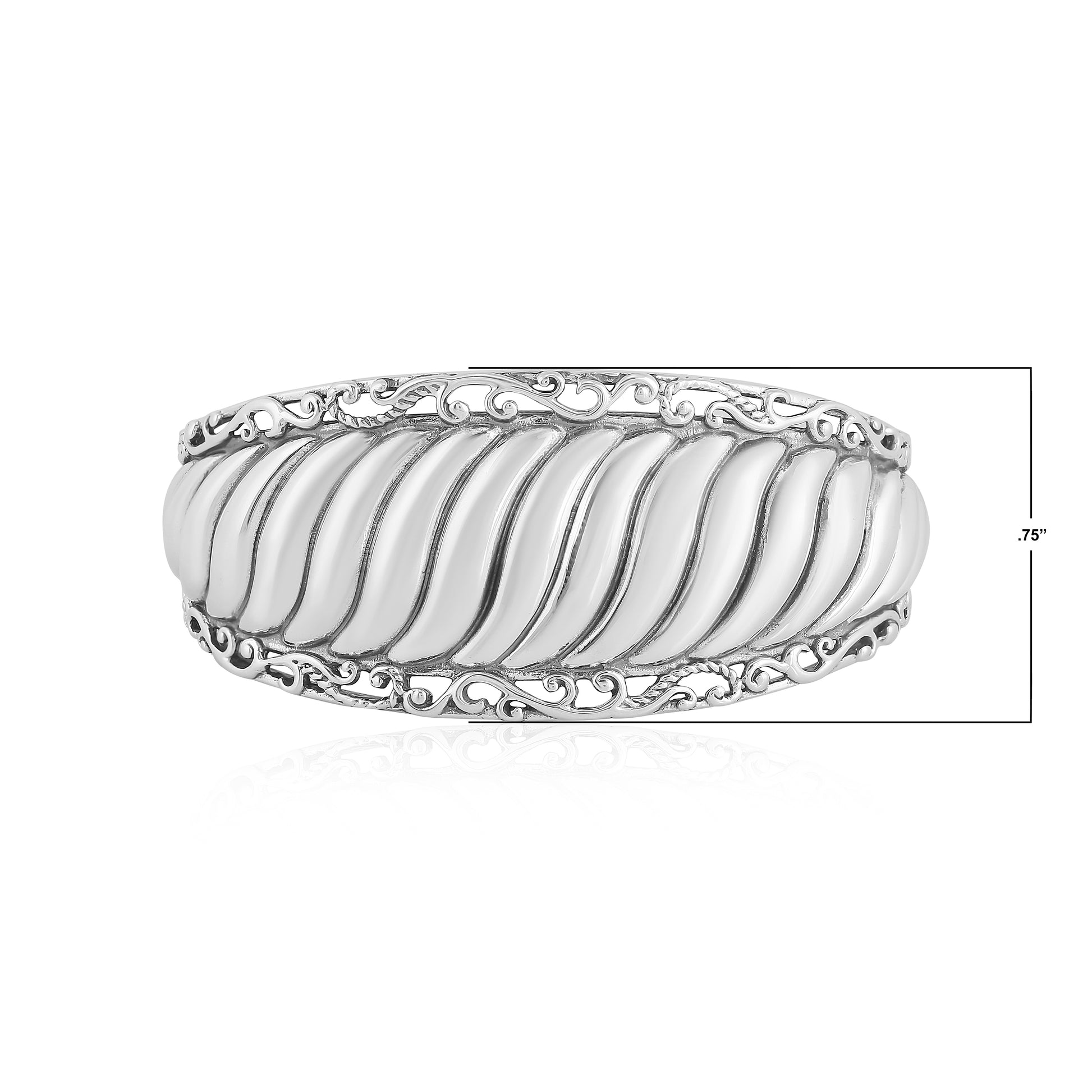 • Wide Sterling Silver Cuff features filigree detailing on top and bottom and twisted rope design in the center; perfect to wear alone or stack with other bracelets