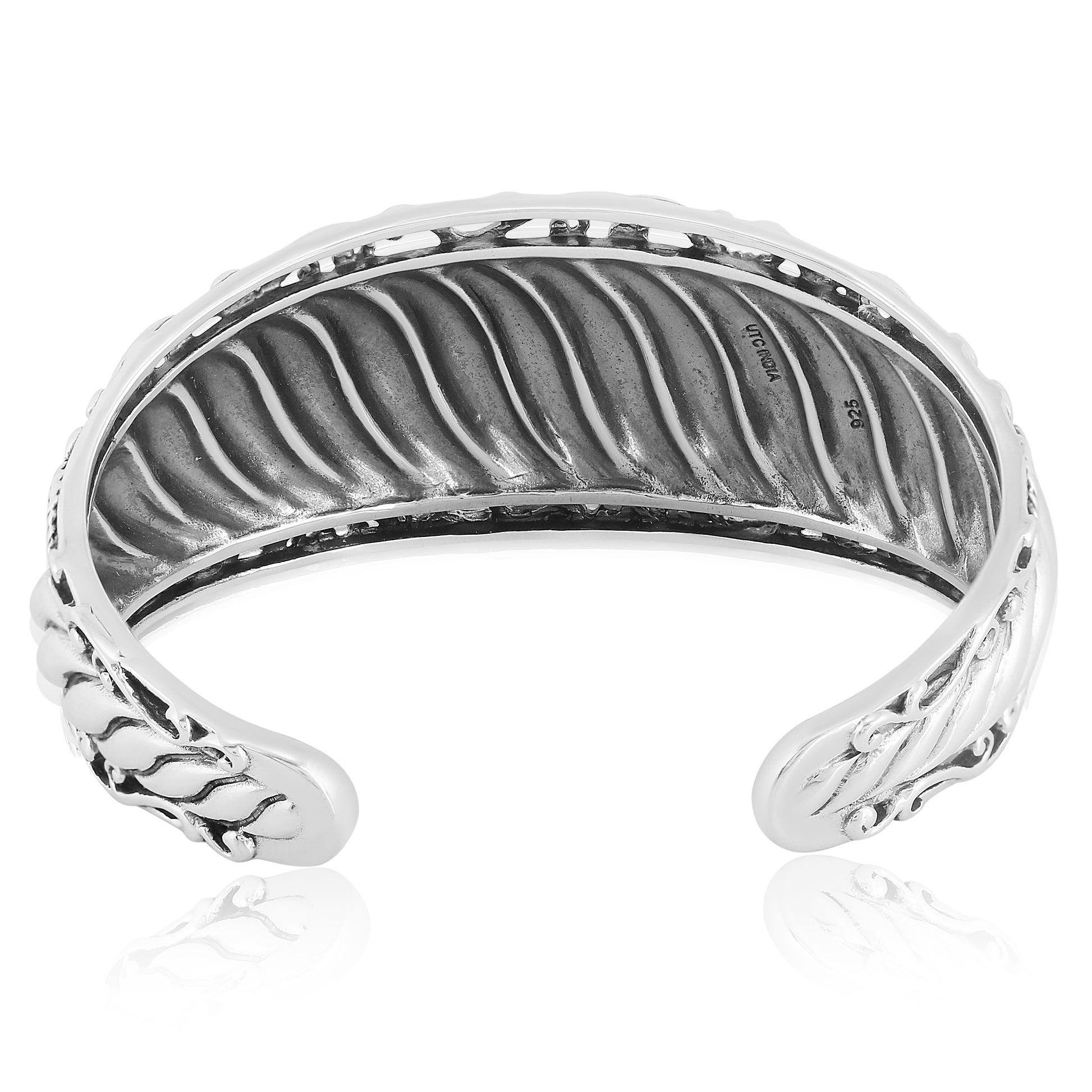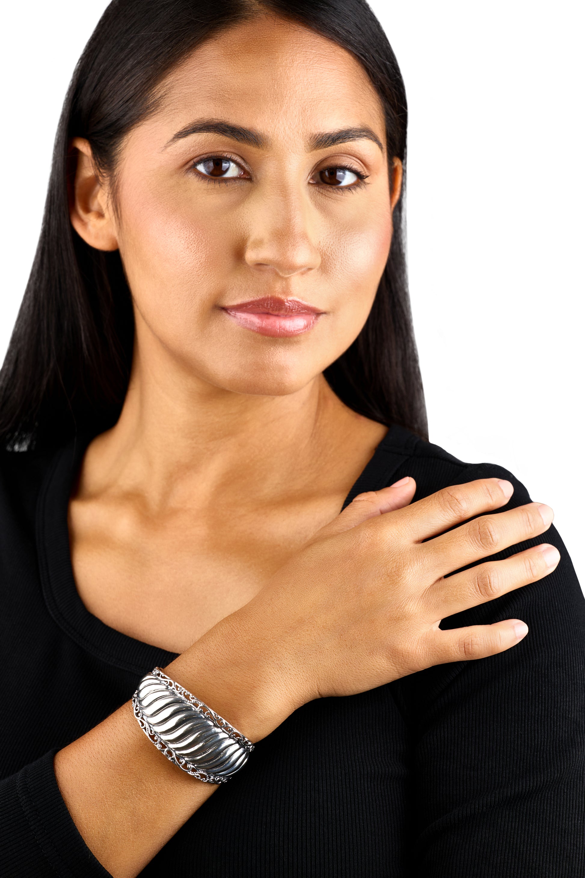 Enjoy a modern twist on a classic jewelry staple with this statement-making Wide Cuff Bracelet. This exclusive design is handcrafted from genuine, nickel- and lead-free .925 Sterling Silver. It features a filigree border at the top and bottom with a curved, textured rope design in the center and an open back to allow for easy on and off. This is a substantial piece, with a total metal gram weight of 49.5. This cuff bracelet is a standalone stunner but is also stackable and collectible - mix and match with other pieces to change up your look. The polished, oxidized finish helps to accent the elaborate details in the Sterling Silver. The AWJ Wide Textured Cuff will elevate any outfit! Whether at work, a date night with your honey or a special party or event, wear American West jewelry and get ready for compliments!